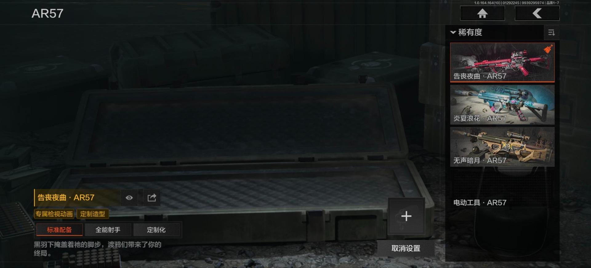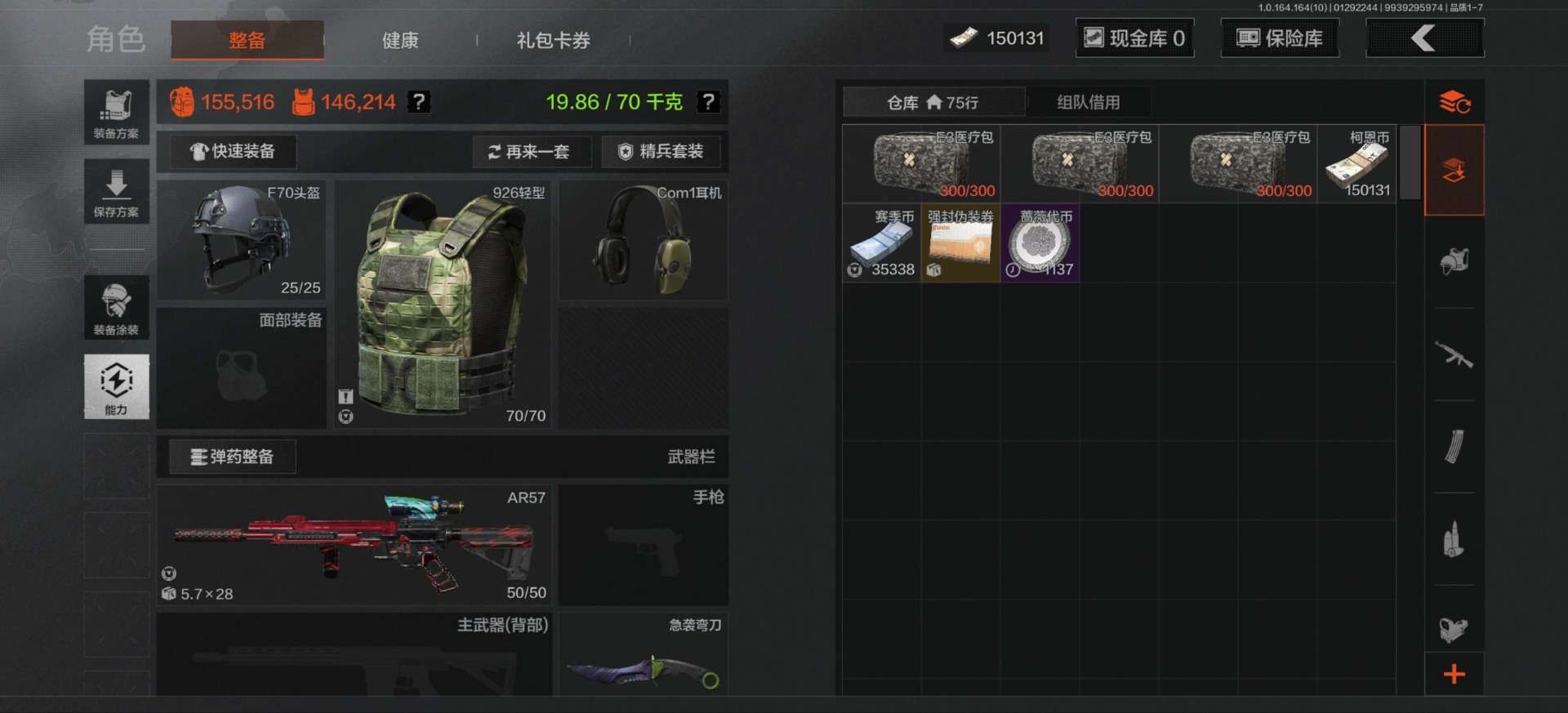 库存价值503.8 2近战武器 3金呛皮 可修改实名 【柯恩币数量】150131 【近战武器】工兵铲急袭弯刀 【金色呛皮】旧王圣谕·q191告丧夜曲·ar57利齿风暴·m 【紫色呛皮】利齿风暴·t79猩红羽翼·vss利齿风暴·t03鱼跃丹青·mcx竞技·mdr伦琴计量·v