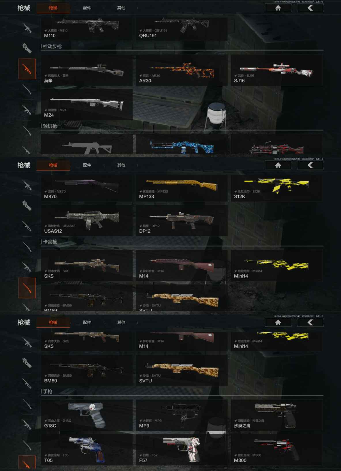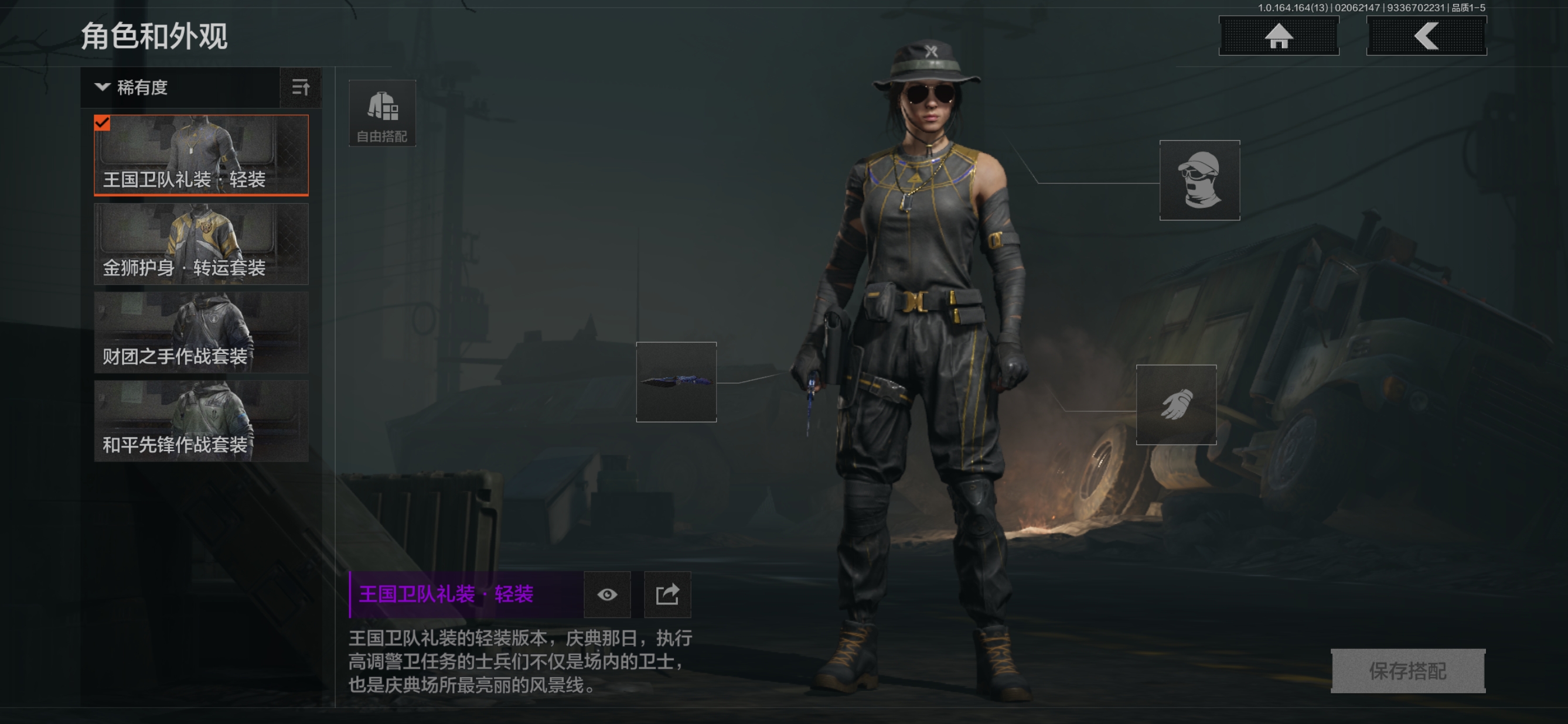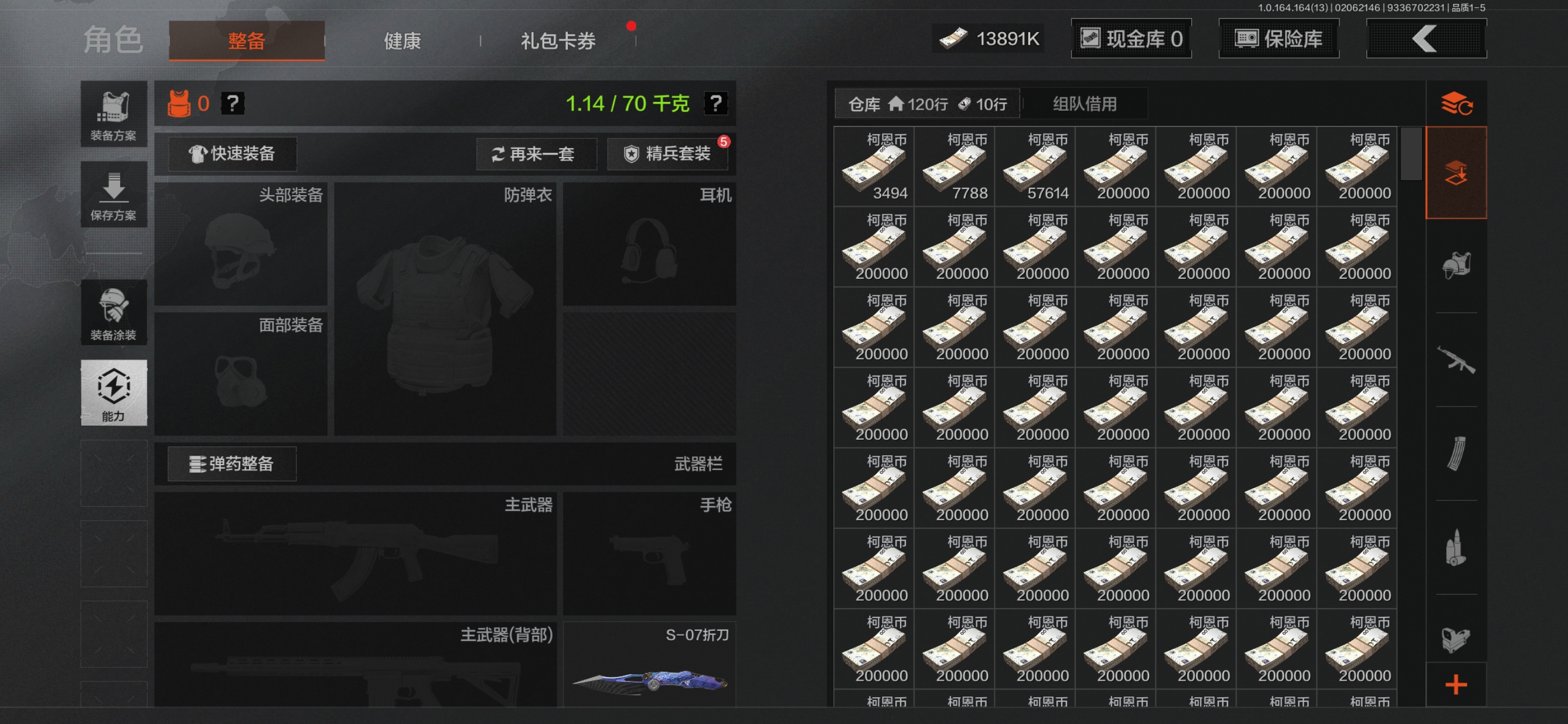 安卓q-等级30-仓库价值14m-科恩币13891k-【套装】 轻装王国卫队礼装 金狮护身·转运套装 财团之手作战套装 和平先锋作战套装 【呛皮】 告丧夜曲·aug 利齿风暴·m 【近战武器】 s-07折刀