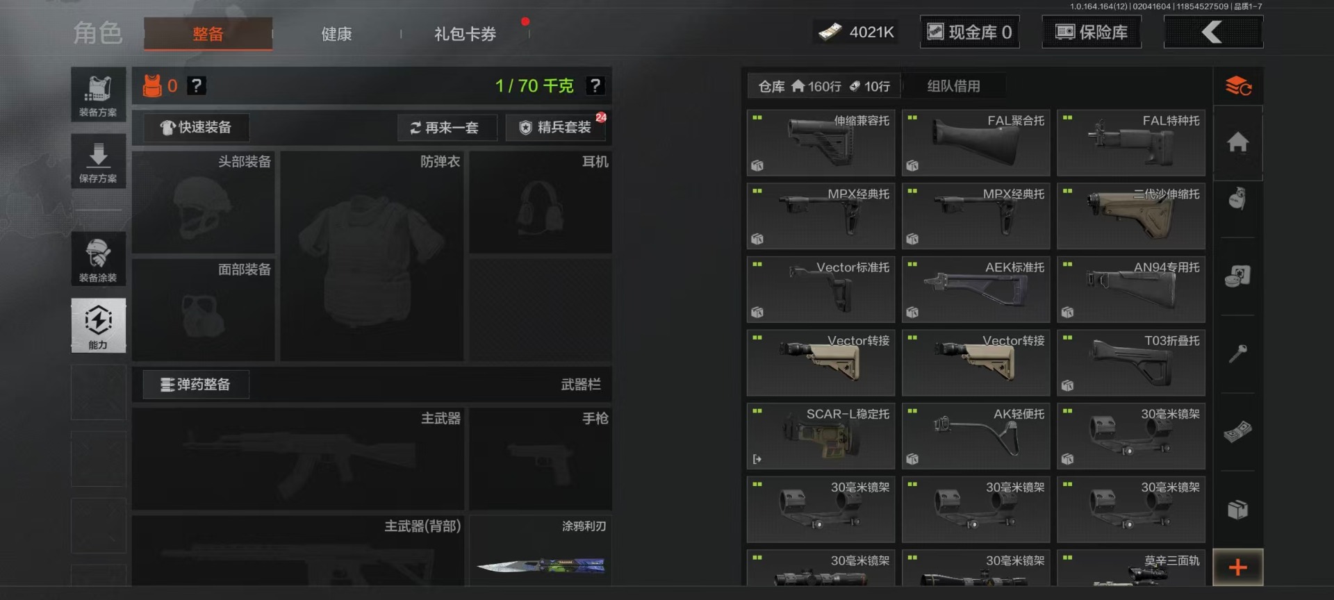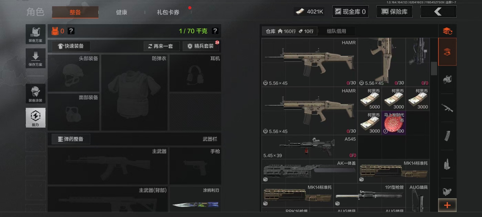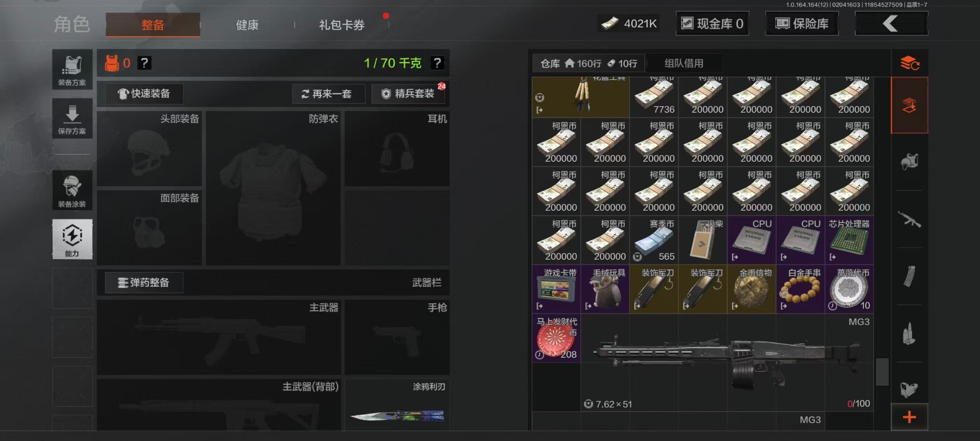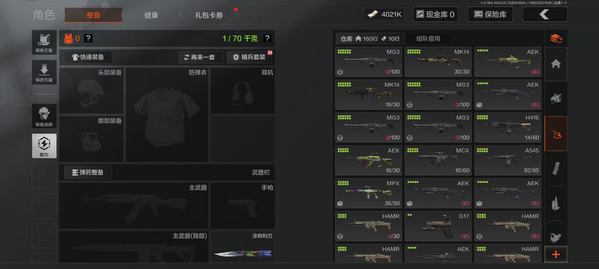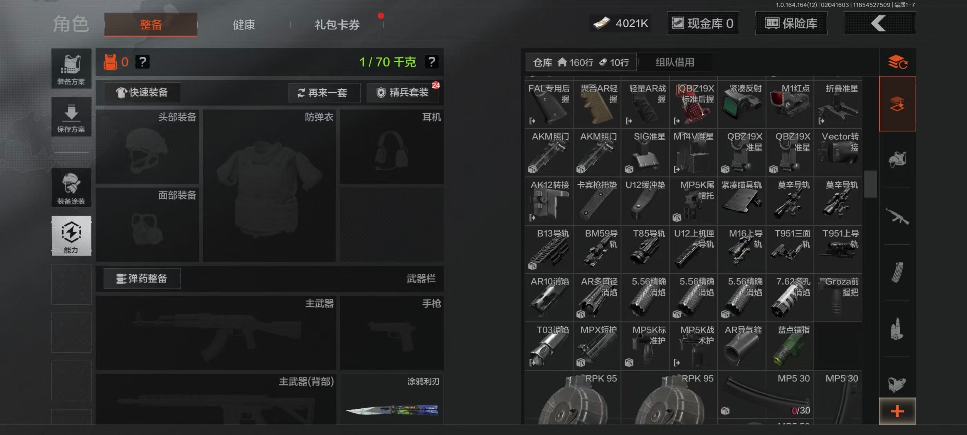 库存价值22.9 4近战武器 7金呛皮 可修改实名 【柯恩币数量】4021k 【近战武器】工兵铲空腔战术来战·开山刀涂鸦利刃 【金色呛皮】旧王圣谕·vss旧王圣谕·q191骑士之剑·ax50利齿风暴·m旗帜·aek钢铁真理·q191蓝色咆哮·h416 【紫色呛皮】利