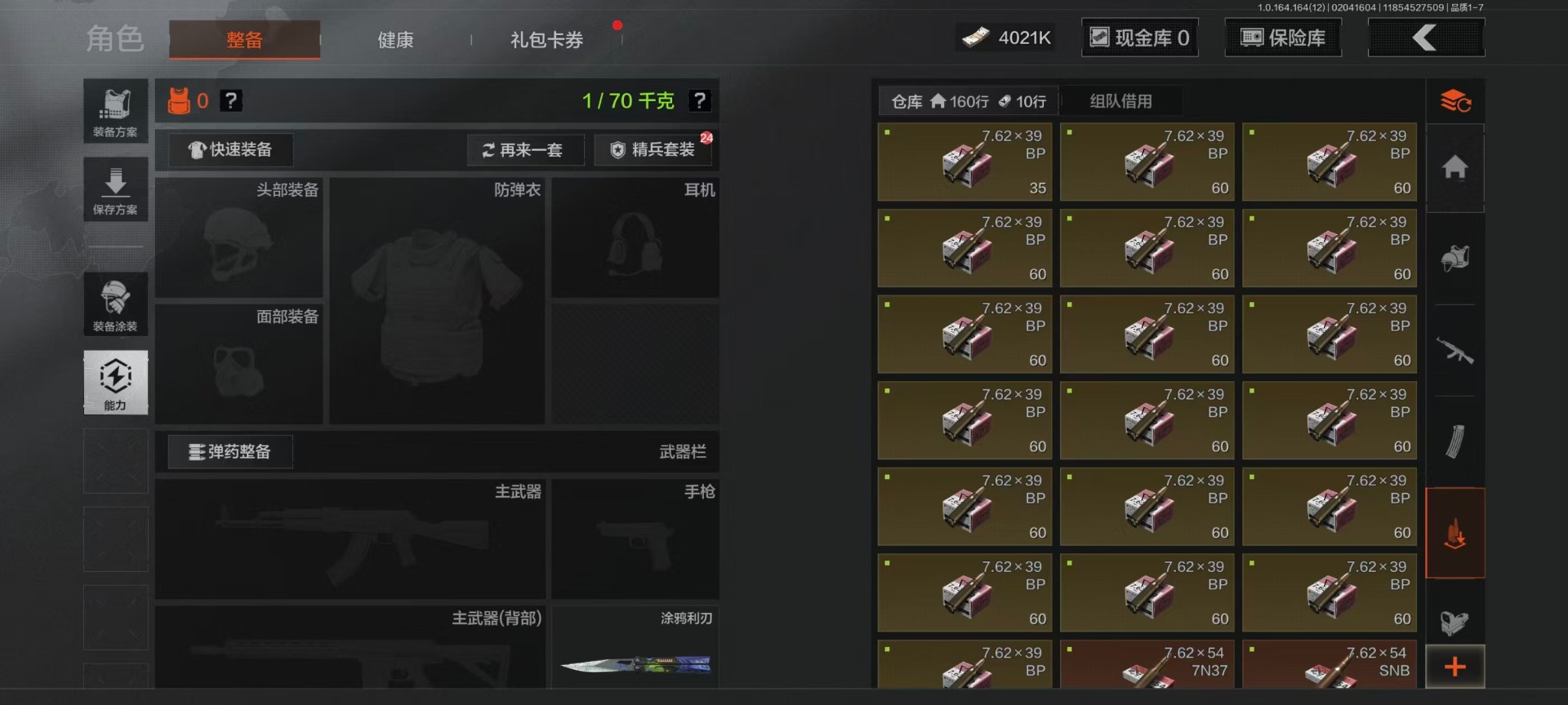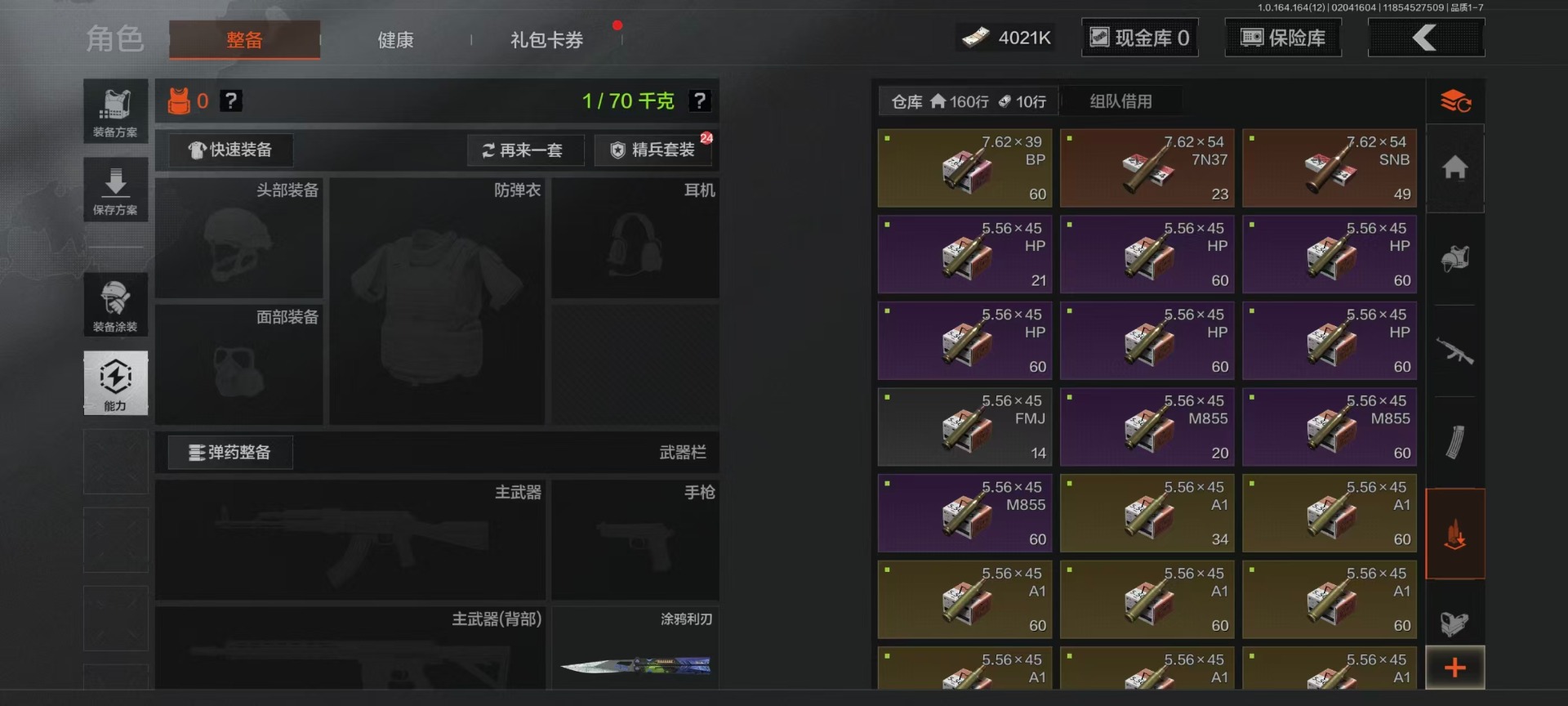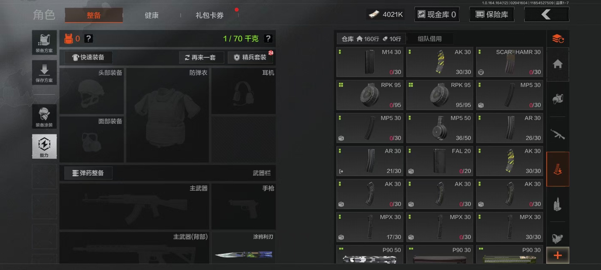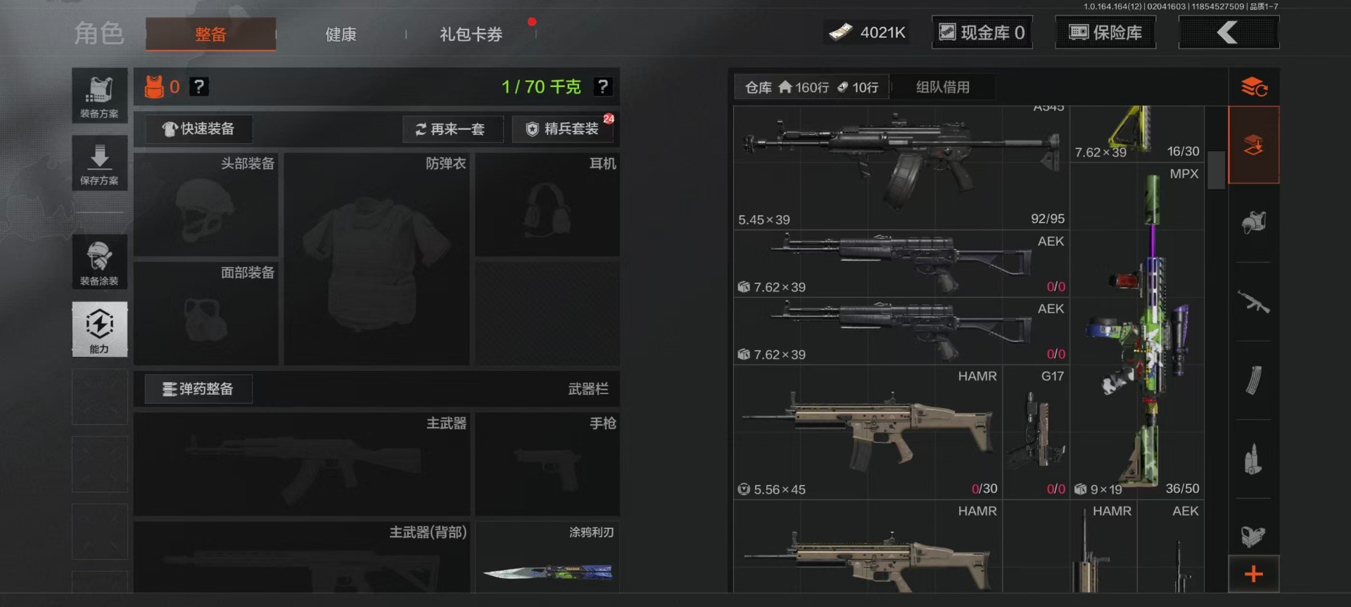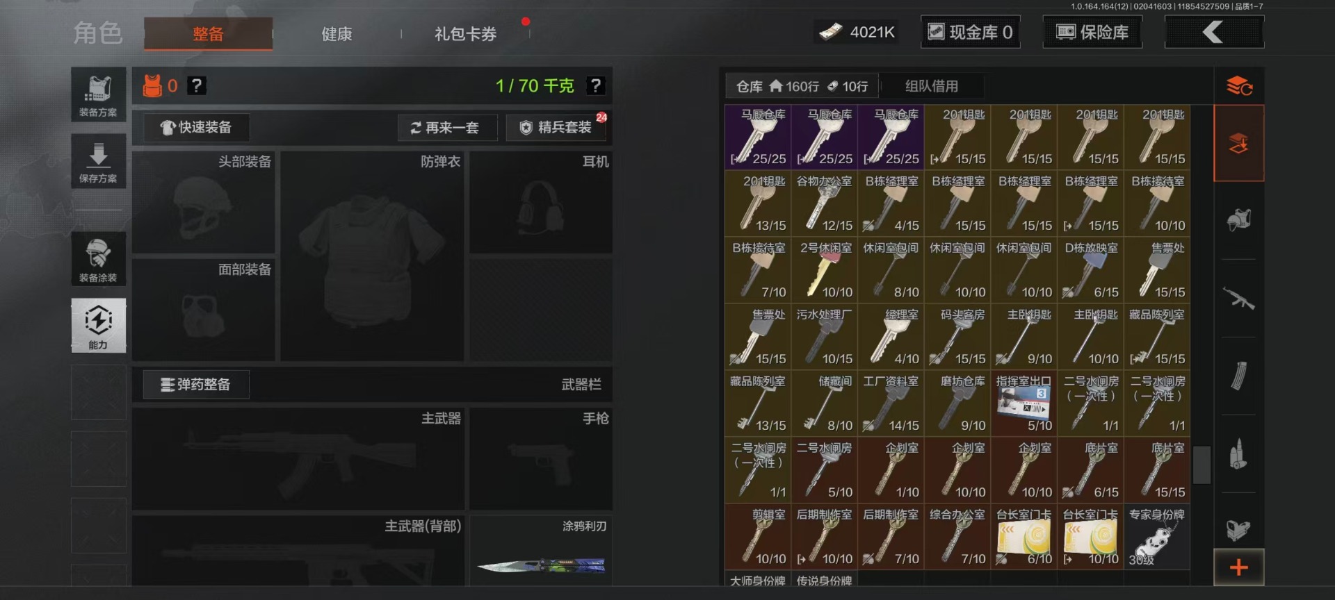库存价值22.9 4近战武器 7金呛皮 可修改实名 【柯恩币数量】4021k 【近战武器】工兵铲空腔战术来战·开山刀涂鸦利刃 【金色呛皮】旧王圣谕·vss旧王圣谕·q191骑士之剑·ax50利齿风暴·m旗帜·aek钢铁真理·q191蓝色咆哮·h416 【紫色呛皮】利