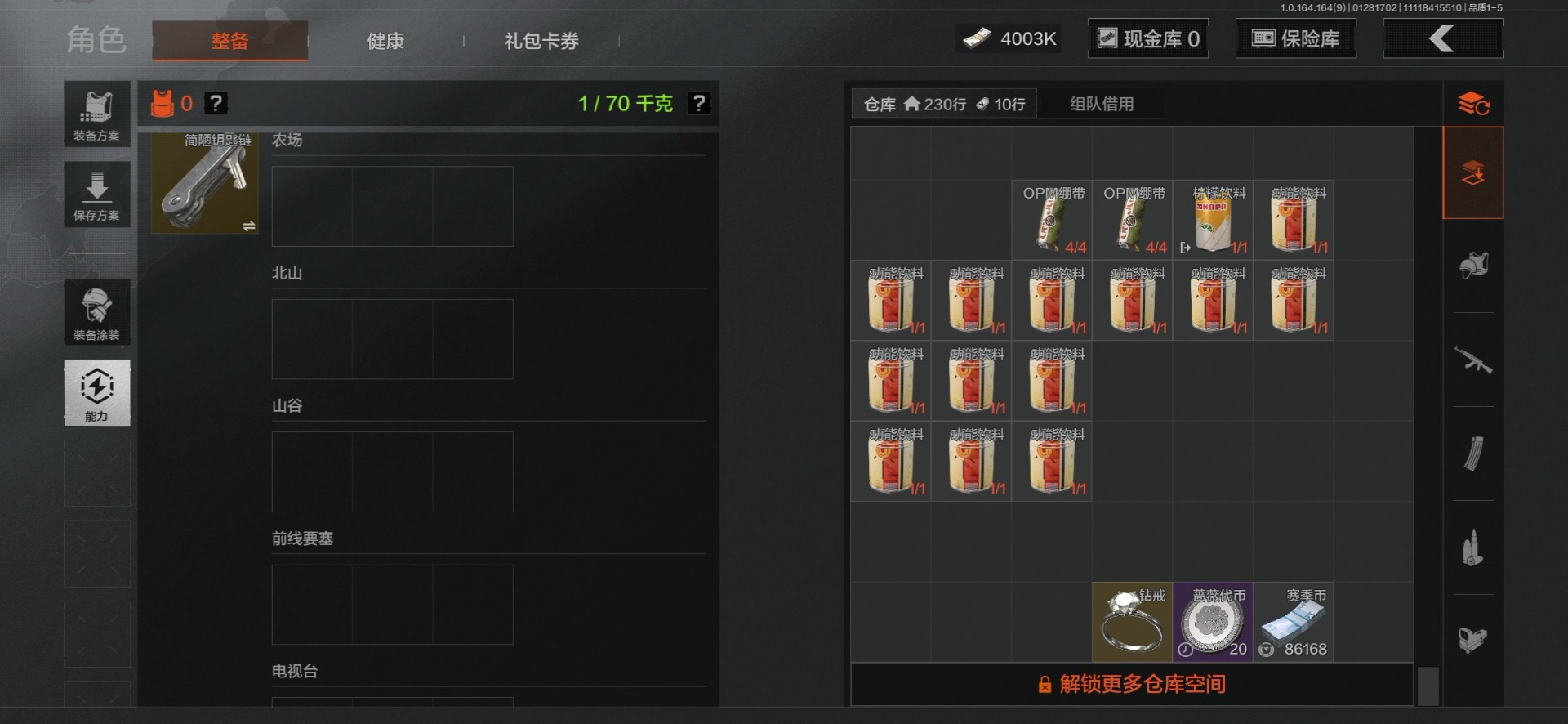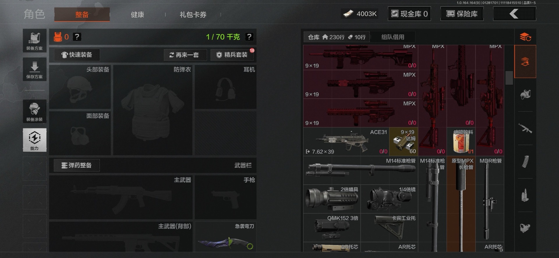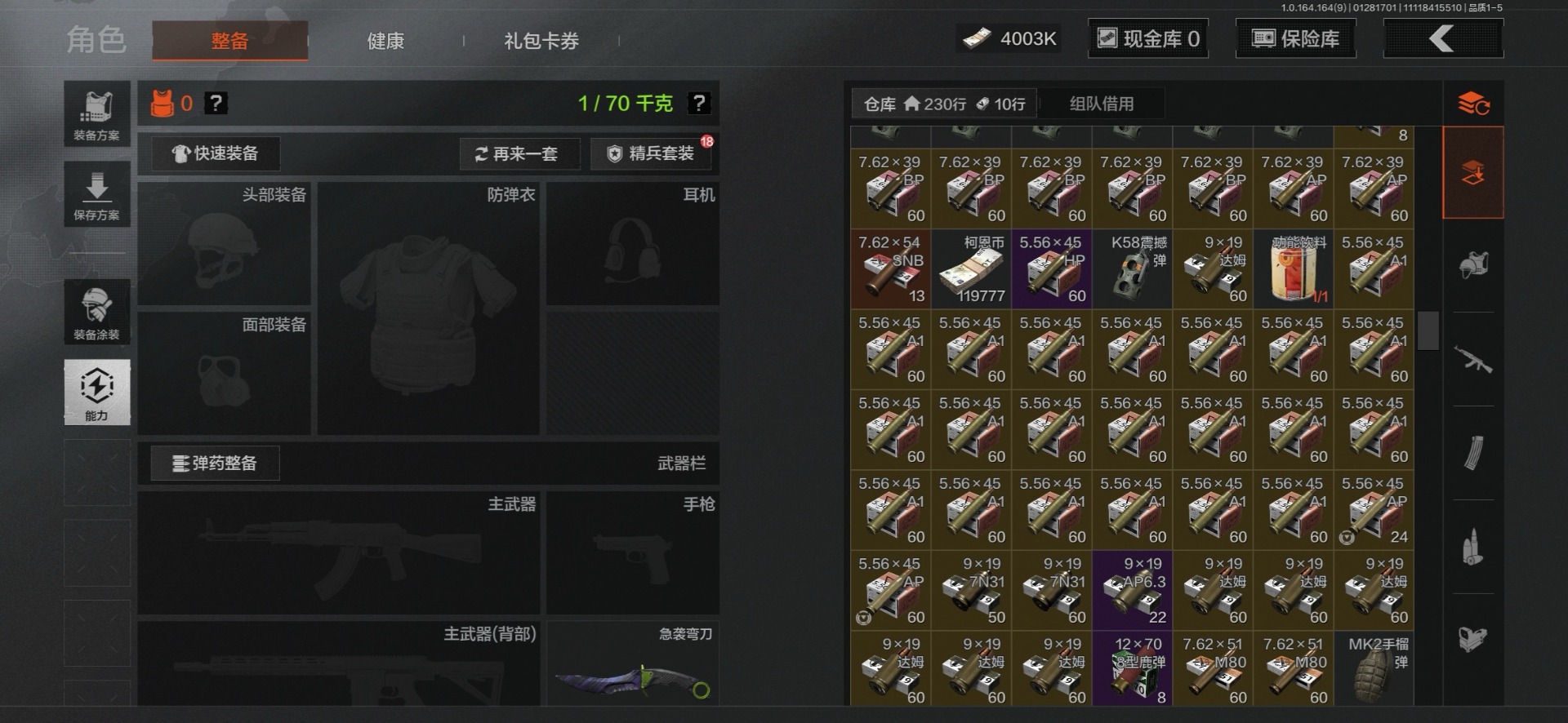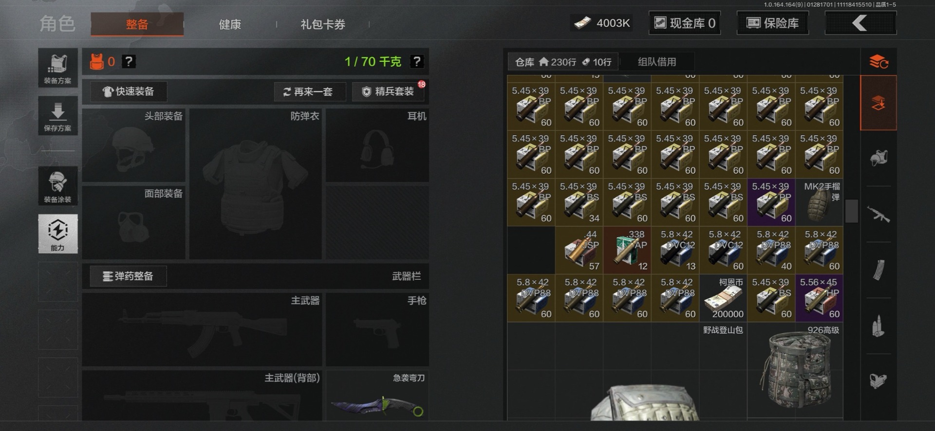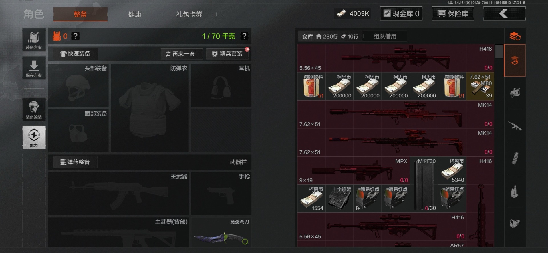 [16545692]库存价值46.5 2近战武器 2金呛皮 可修改实名 【柯恩币数量】4003k 【近战武器】工兵铲急袭弯刀 【金色呛皮】战术大师·an94利齿风暴·m 【紫色呛皮】猩红羽翼·vss利齿风暴·t79鱼跃丹青·qbu191动感舞步·ace31格勒涂装·ak12包络战术·usas12粉绒臻选·ar30秘域鎏金·rpk16典礼武备·mcx典礼武备·mk14战术大师·sj16战术大师·sks旗帜脉冲·m110深蓝·mp5无声暗月·ax50无声暗月·ar57危崖敌影·f2000深潜·t03深蓝·aek 【角色装扮(紫)】野狩骑士套装王国卫队礼装和平先锋作战套装财团之手作战套装 信誉分低于350