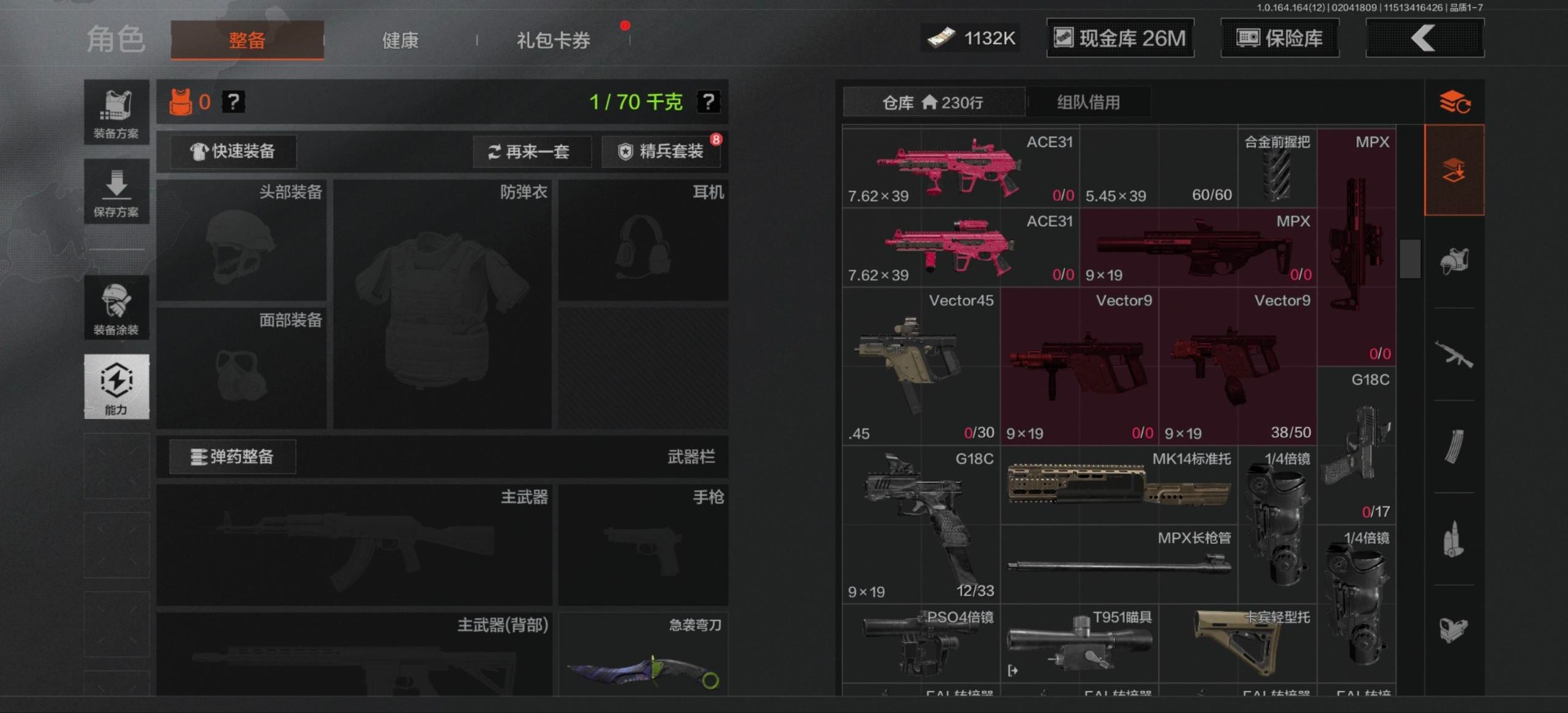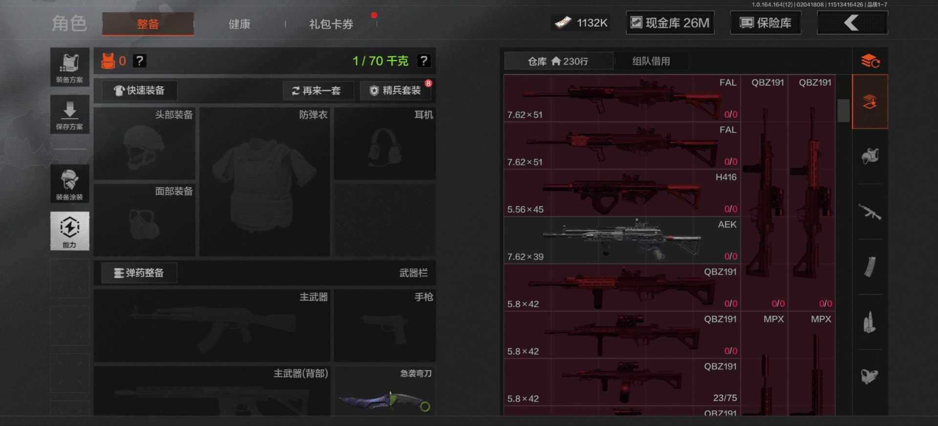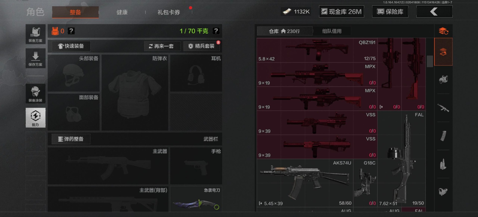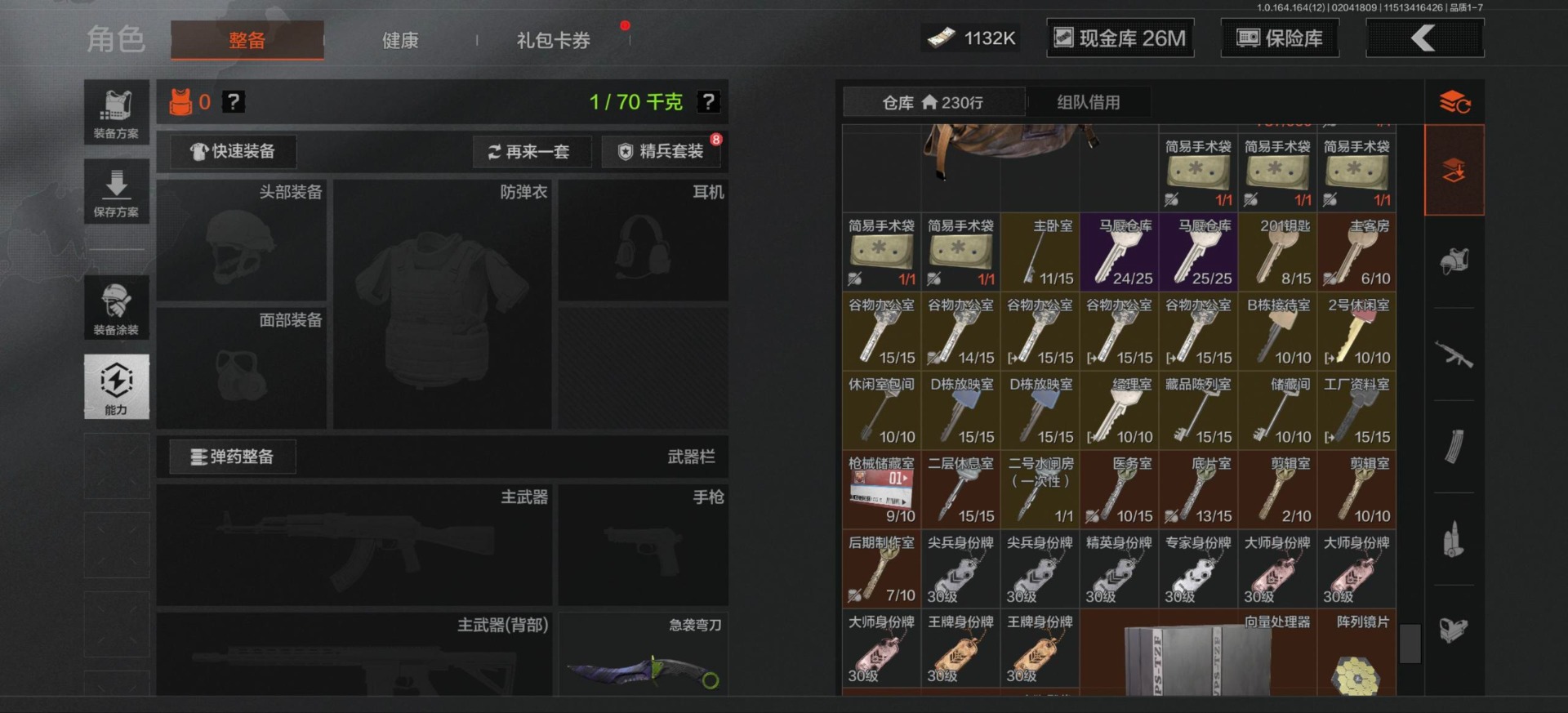 库存价值54.1 2近战武器 2金呛皮 可修改实名 【柯恩币数量】1132k现金库26m 【近战武器】工兵铲急袭弯刀 【金色呛皮】包络战术·akm战术大师·an94 【紫色呛皮】猩红羽翼·vss骑士之剑·t03粉绒臻选·ar30秘域鎏金·rpk16战术大师·sks战术大师·suom