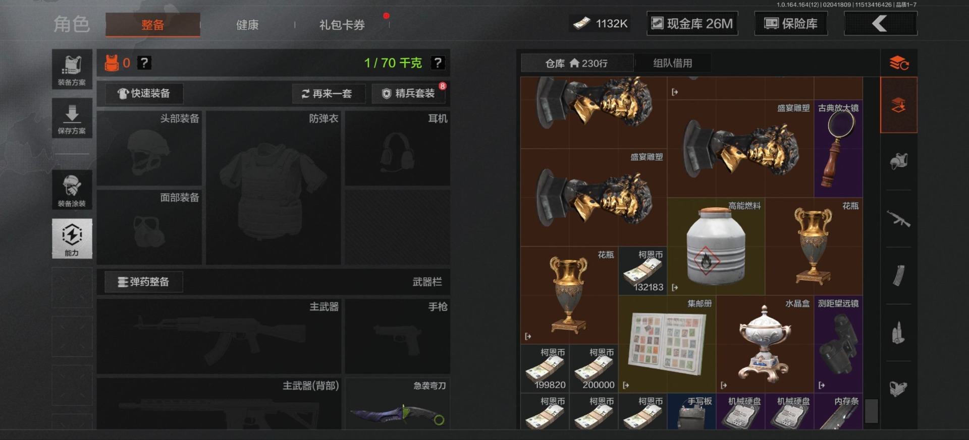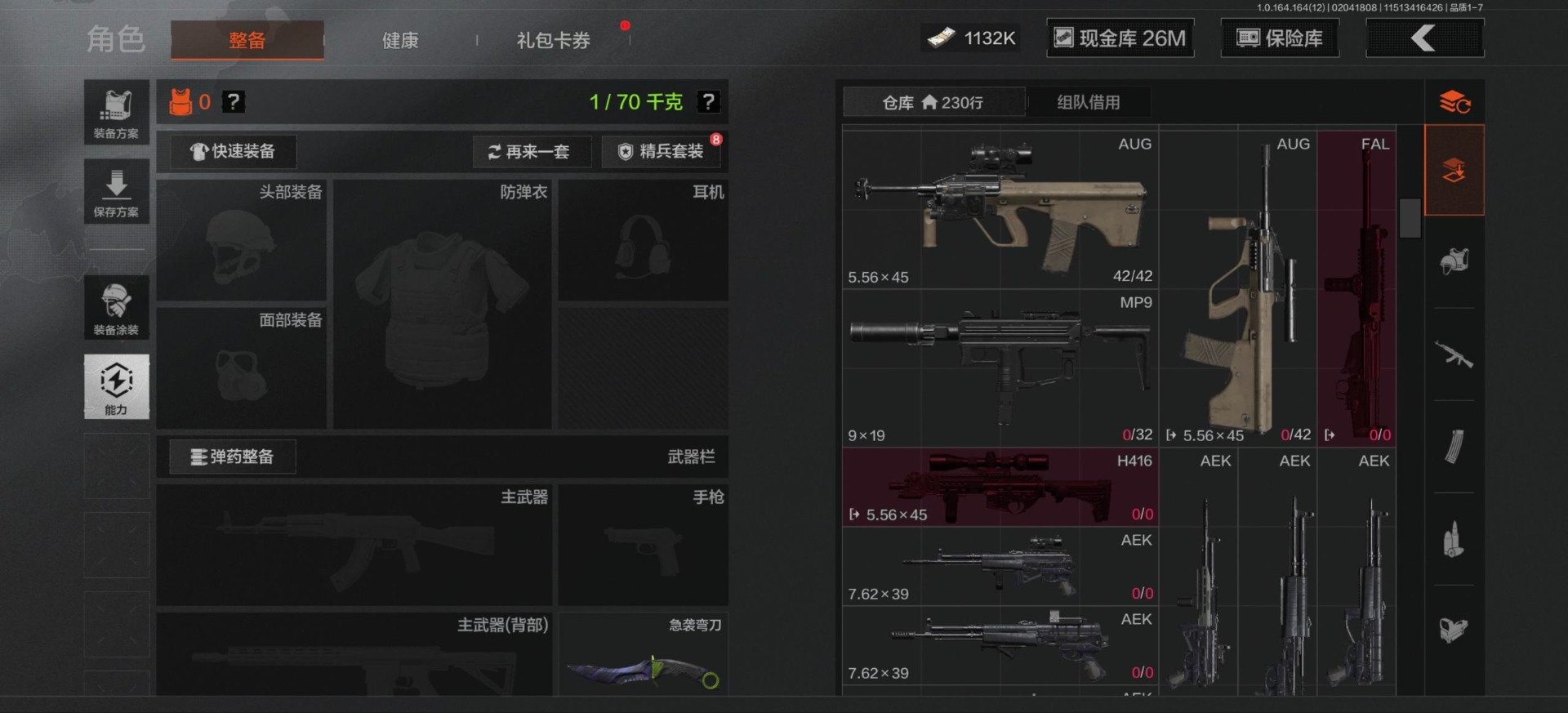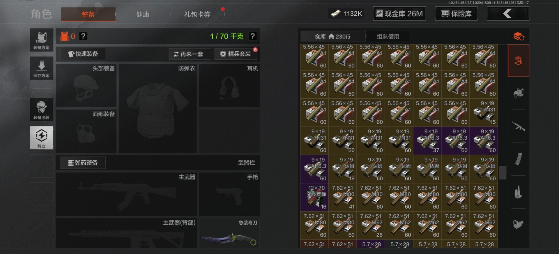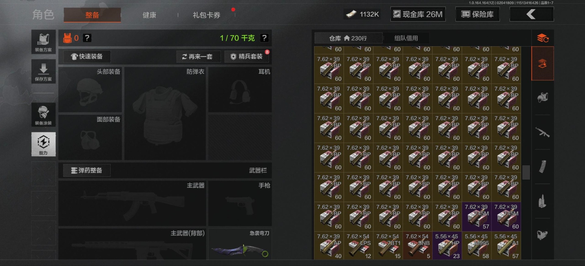 库存价值54.1 2近战武器 2金呛皮 可修改实名 【柯恩币数量】1132k现金库26m 【近战武器】工兵铲急袭弯刀 【金色呛皮】包络战术·akm战术大师·an94 【紫色呛皮】猩红羽翼·vss骑士之剑·t03粉绒臻选·ar30秘域鎏金·rpk16战术大师·sks战术大师·suom