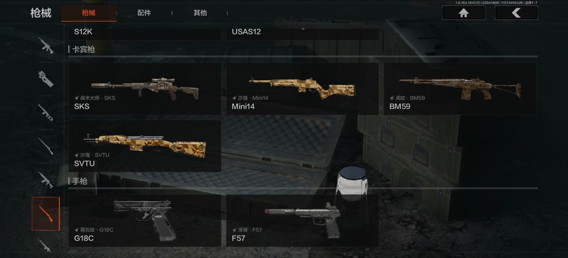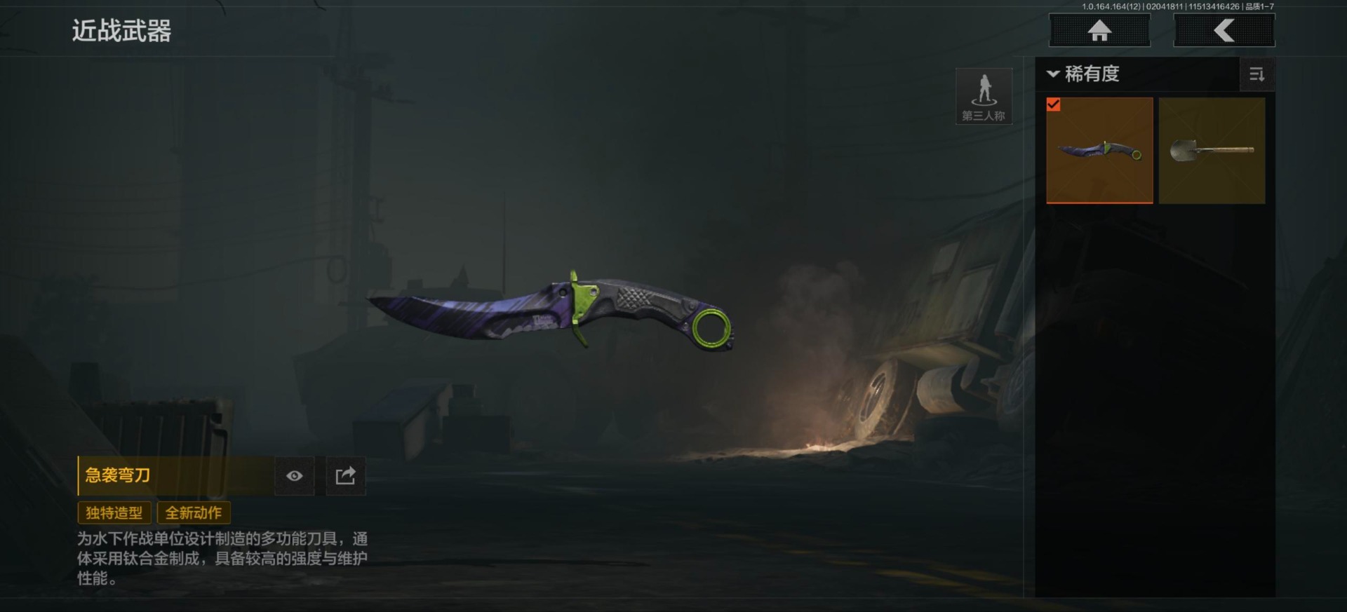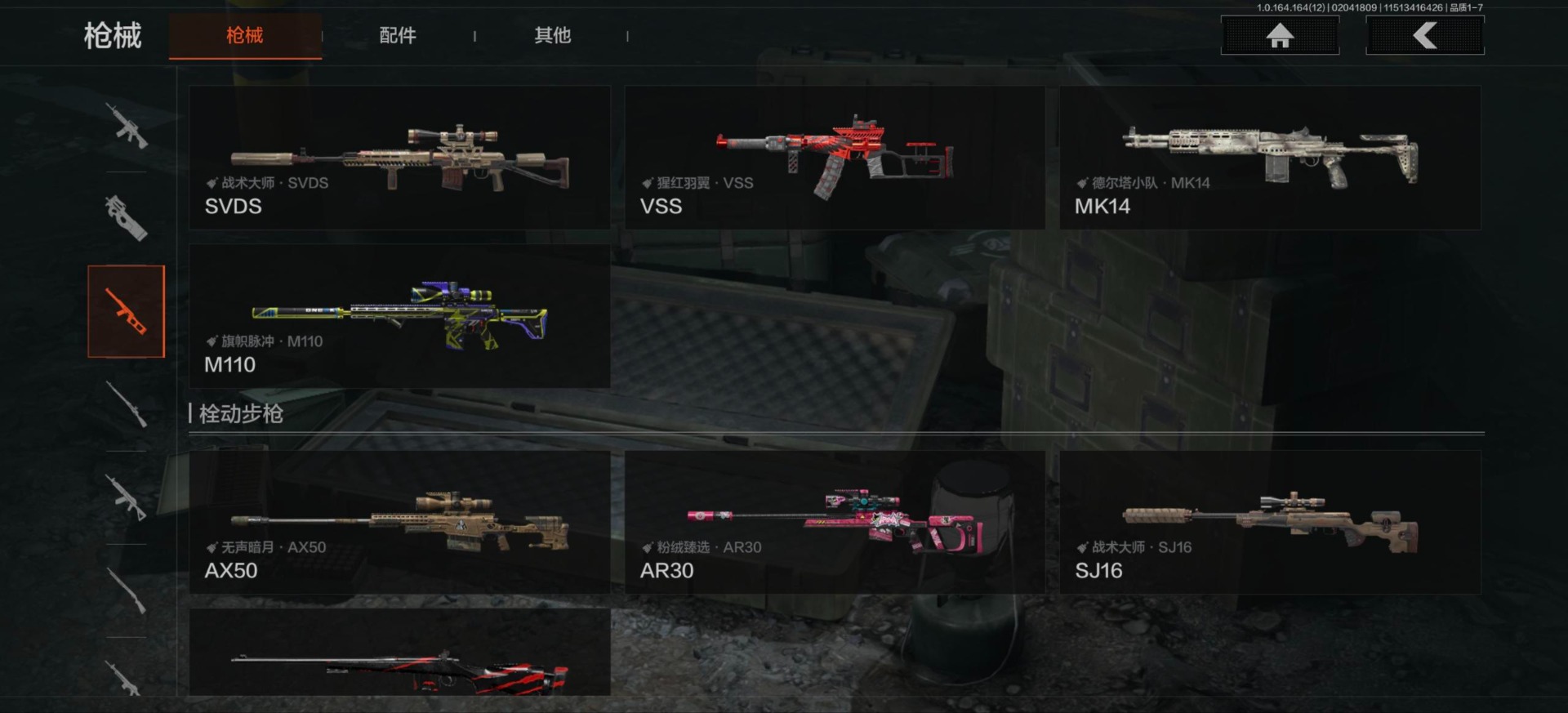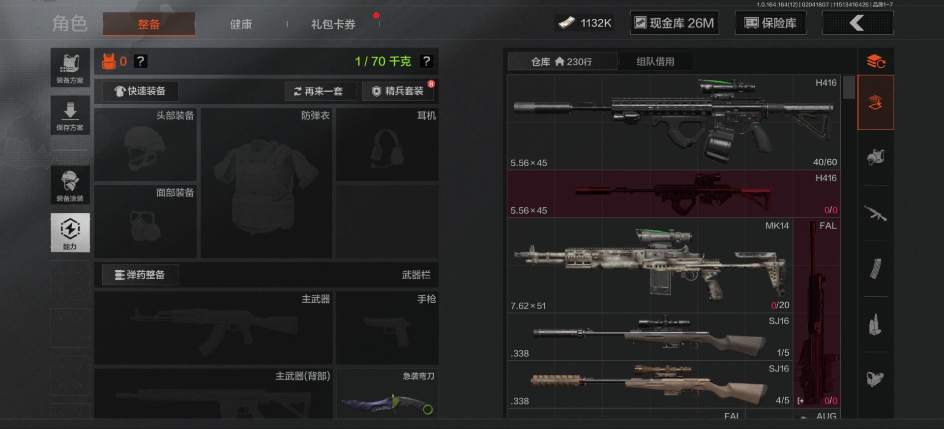 库存价值54.1 2近战武器 2金呛皮 可修改实名 【柯恩币数量】1132k现金库26m 【近战武器】工兵铲急袭弯刀 【金色呛皮】包络战术·akm战术大师·an94 【紫色呛皮】猩红羽翼·vss骑士之剑·t03粉绒臻选·ar30秘域鎏金·rpk16战术大师·sks战术大师·suom