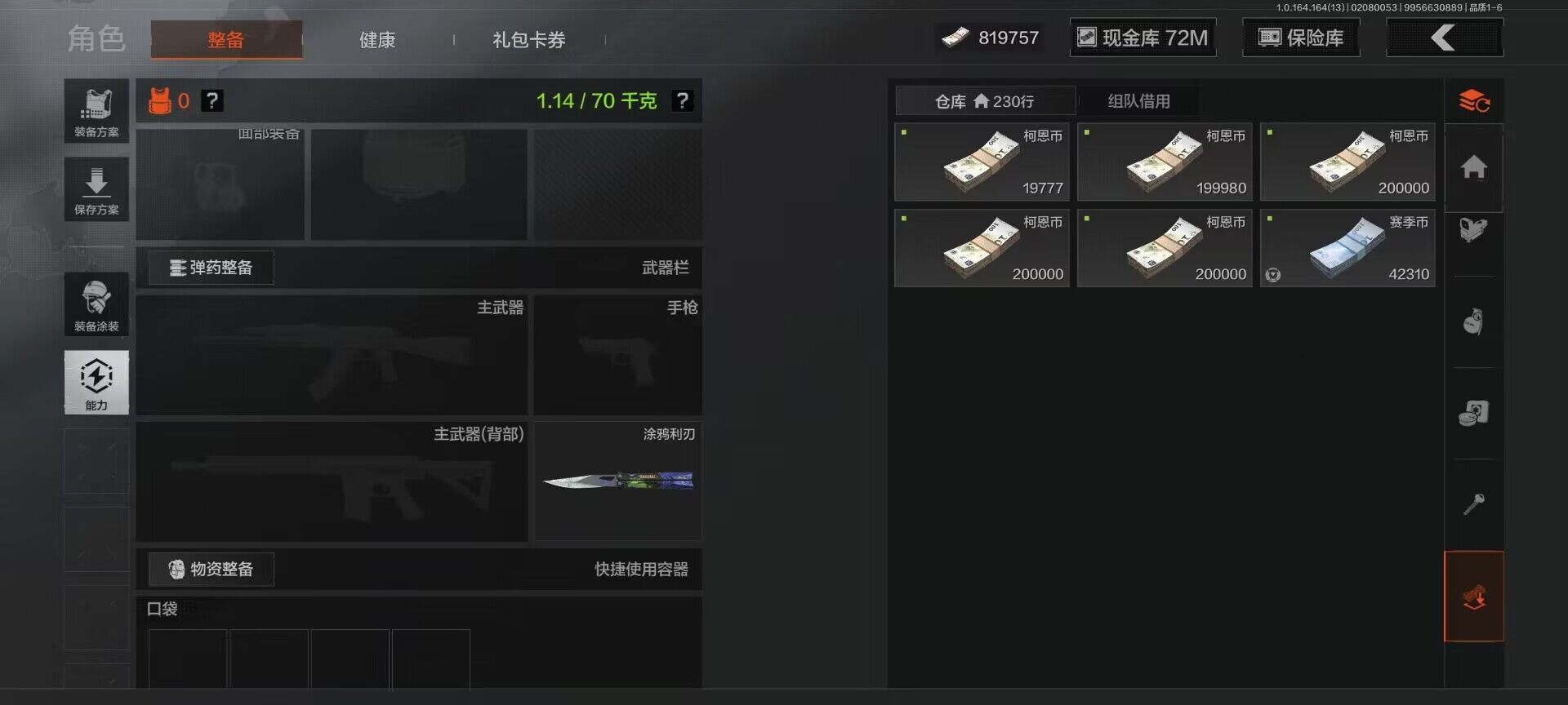 【aqzg1233】等级:30/段位:王牌/仓库价值百万:93.4/柯恩币:72000000/涂鸦利刃
