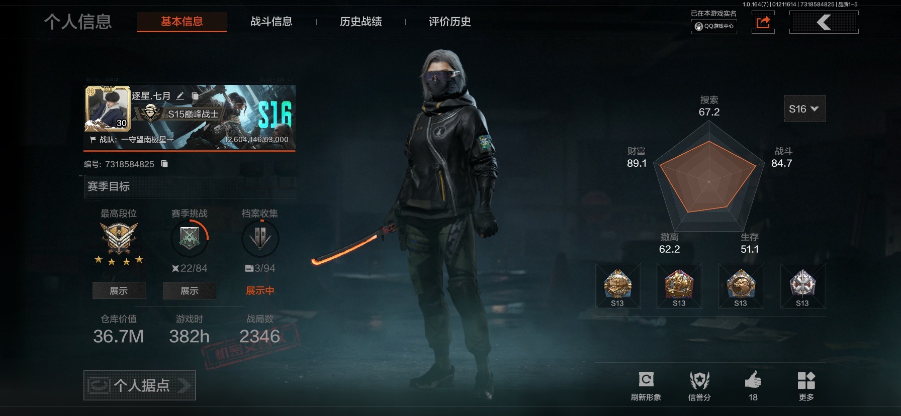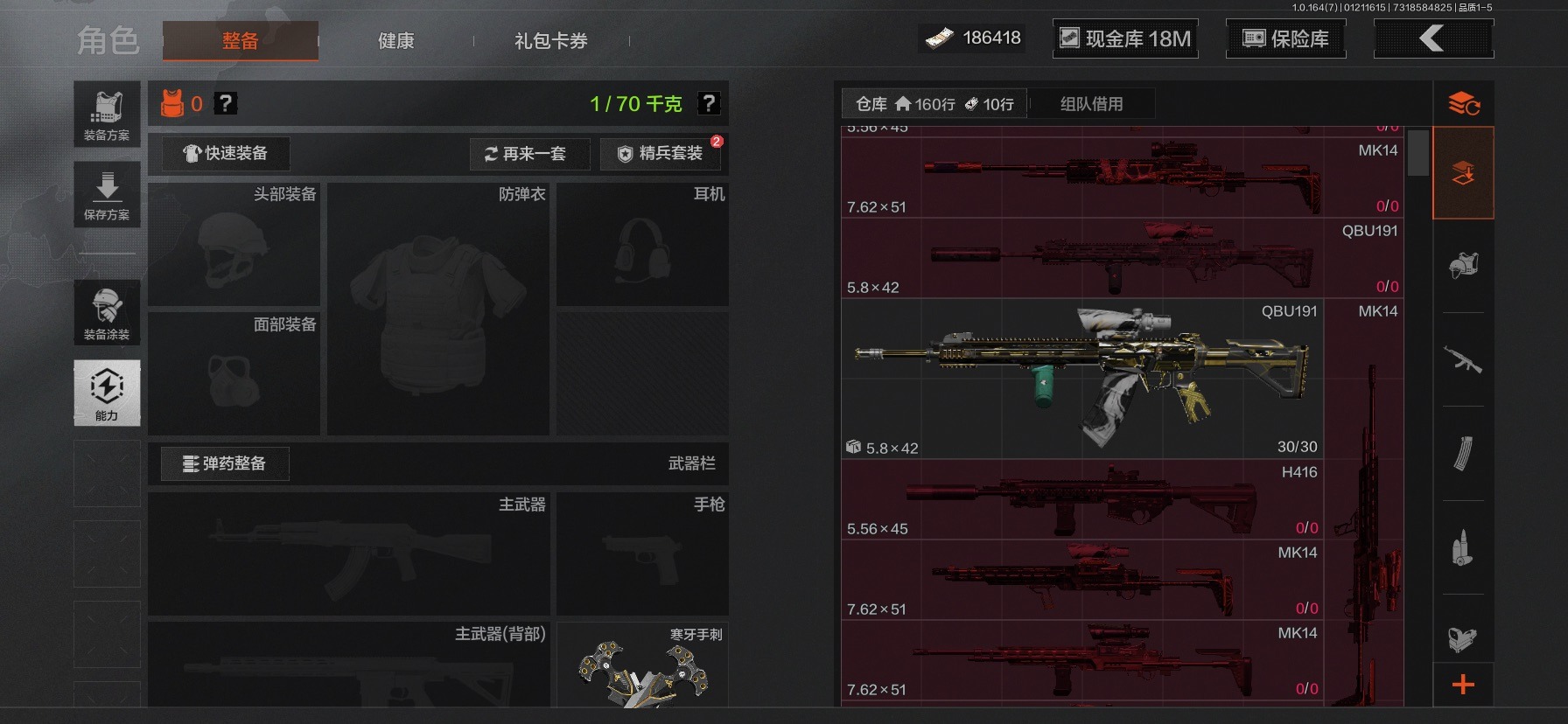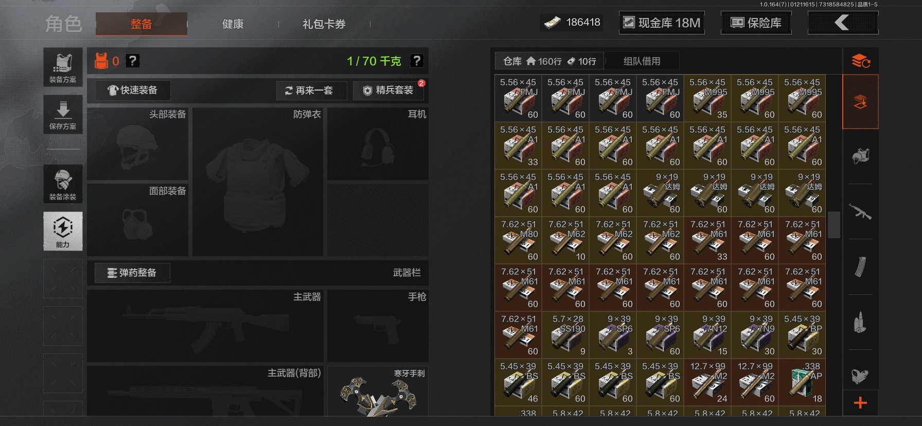 库存价值36.7 3近战武器 2金呛皮 可修改实名 【柯恩币数量】186418现金库18m 【近战武器】热能武器·补牢工兵铲寒牙手刺 【金色呛皮】旧王圣谕·vss棱光裂变·qbu191 【紫色呛皮】竞技·mdr鱼跃丹青·mcx脊峰速降·m火力倾泻·rpd武侍·sj16正在骇入