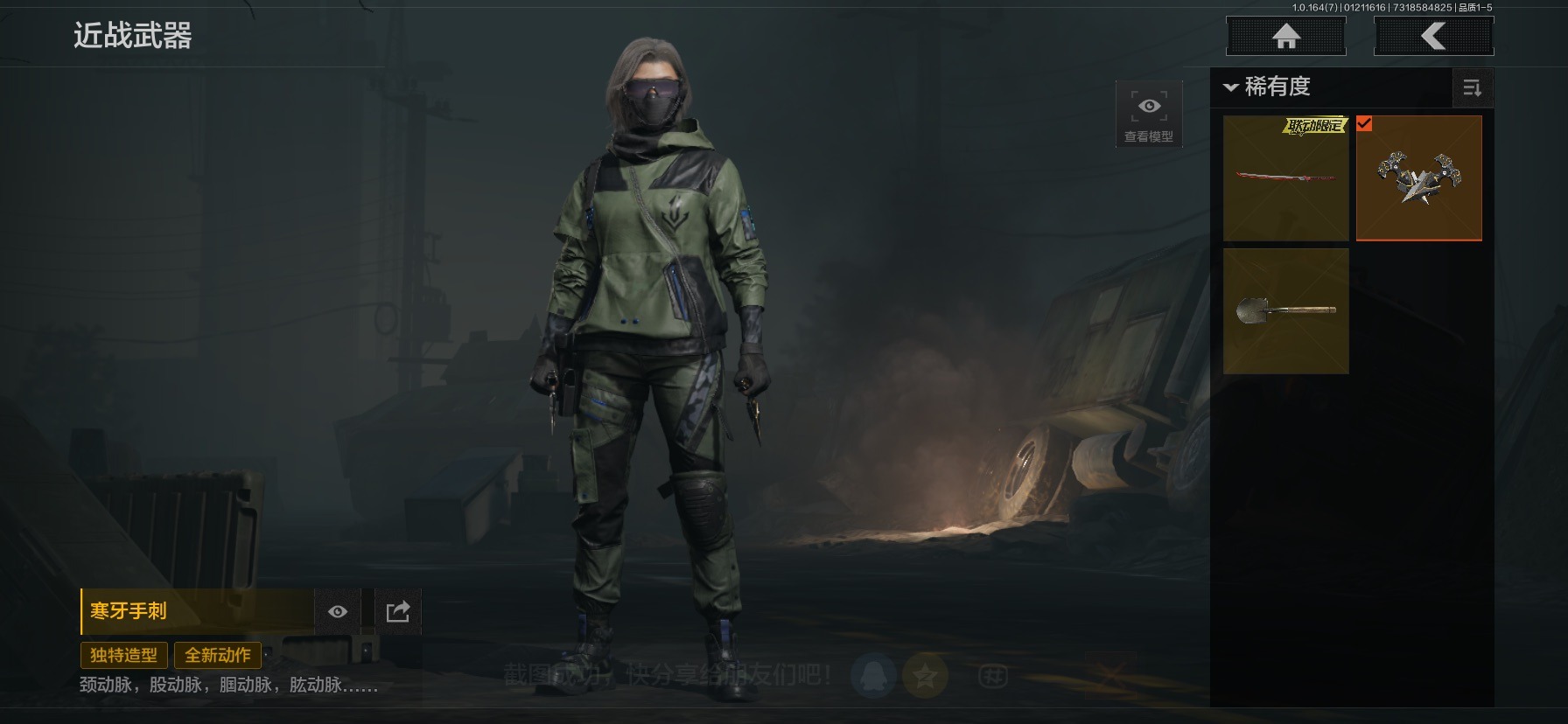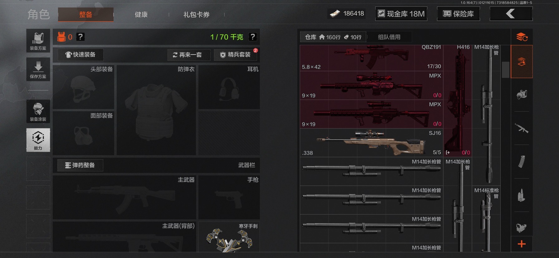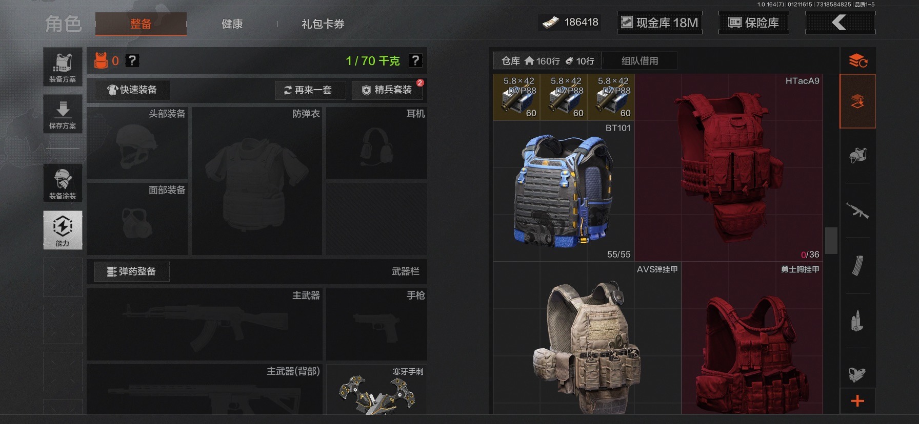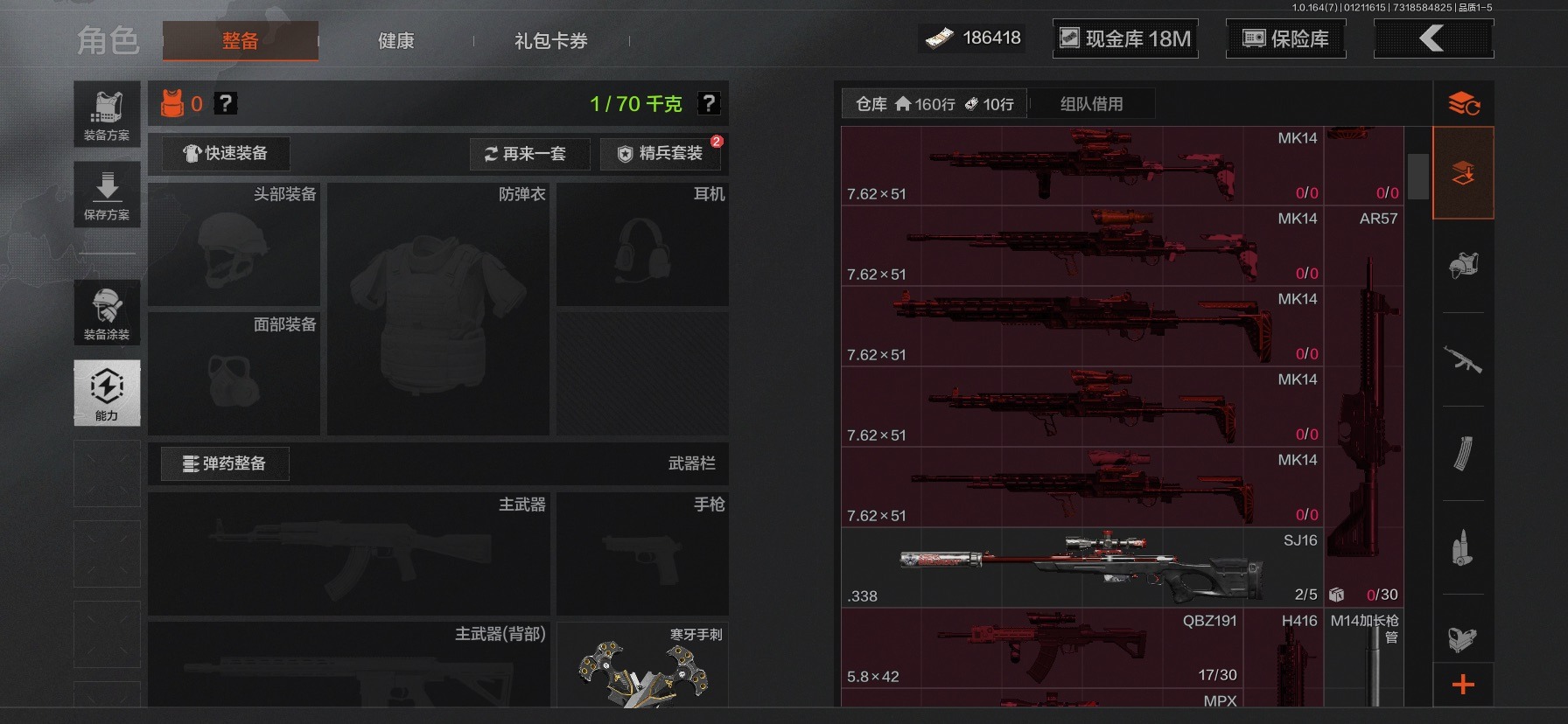 库存价值36.7 3近战武器 2金呛皮 可修改实名 【柯恩币数量】186418现金库18m 【近战武器】热能武器·补牢工兵铲寒牙手刺 【金色呛皮】旧王圣谕·vss棱光裂变·qbu191 【紫色呛皮】竞技·mdr鱼跃丹青·mcx脊峰速降·m火力倾泻·rpd武侍·sj16正在骇入