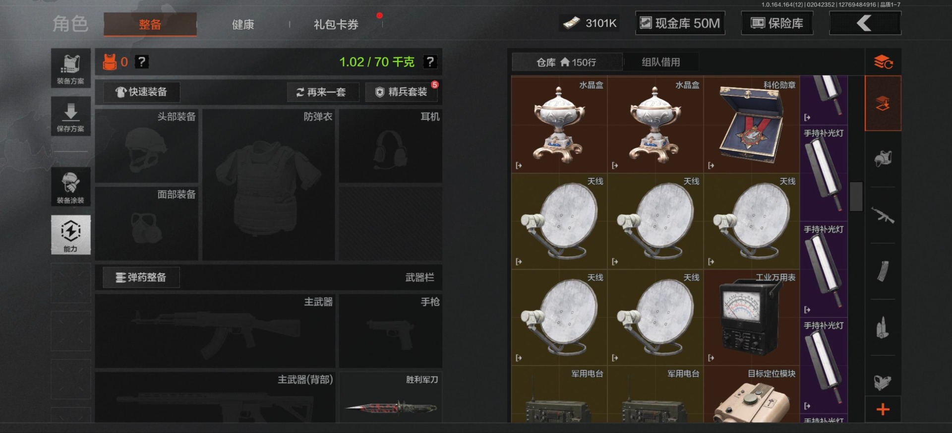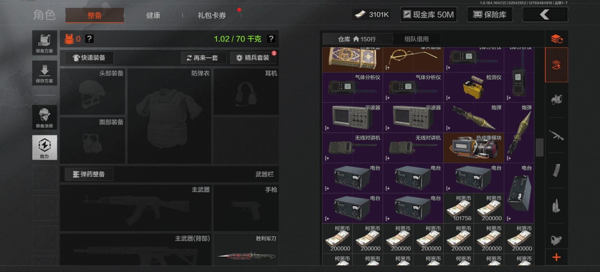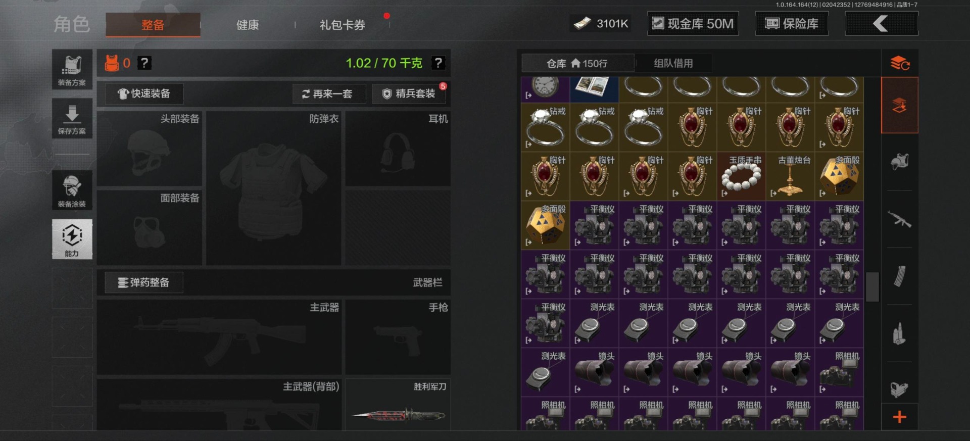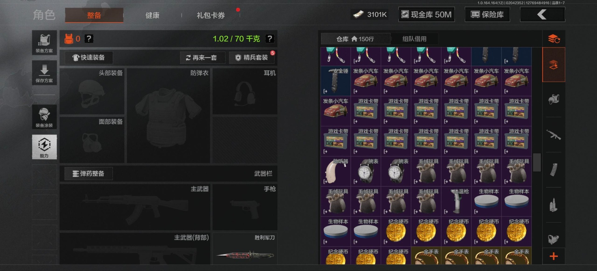 [16548814]库存价值81.1 3近战武器 3金呛皮 可修改实名 【柯恩币数量】3101 【近战武器】工兵铲来战·开山刀胜利军刀 【金色呛皮】旧王圣谕·q191浮鳞影青·q192告丧夜曲·ar57 【紫色呛皮】骑士之剑·akm包络战术·莫辛动感舞步·ace31包络战术·usas12粉绒臻选·sks秘域鎏金·rpk16来战·ak74n自喷网格·h416掌中盾·mp5骑士之剑·aks74u雪原凌锋·svds缟兵玄墨·m110玄戈梨花·t03 【角色装扮(紫)】粉绒暴击套装和平先锋作战套装财团之手作战套装砼城浪客·套装
