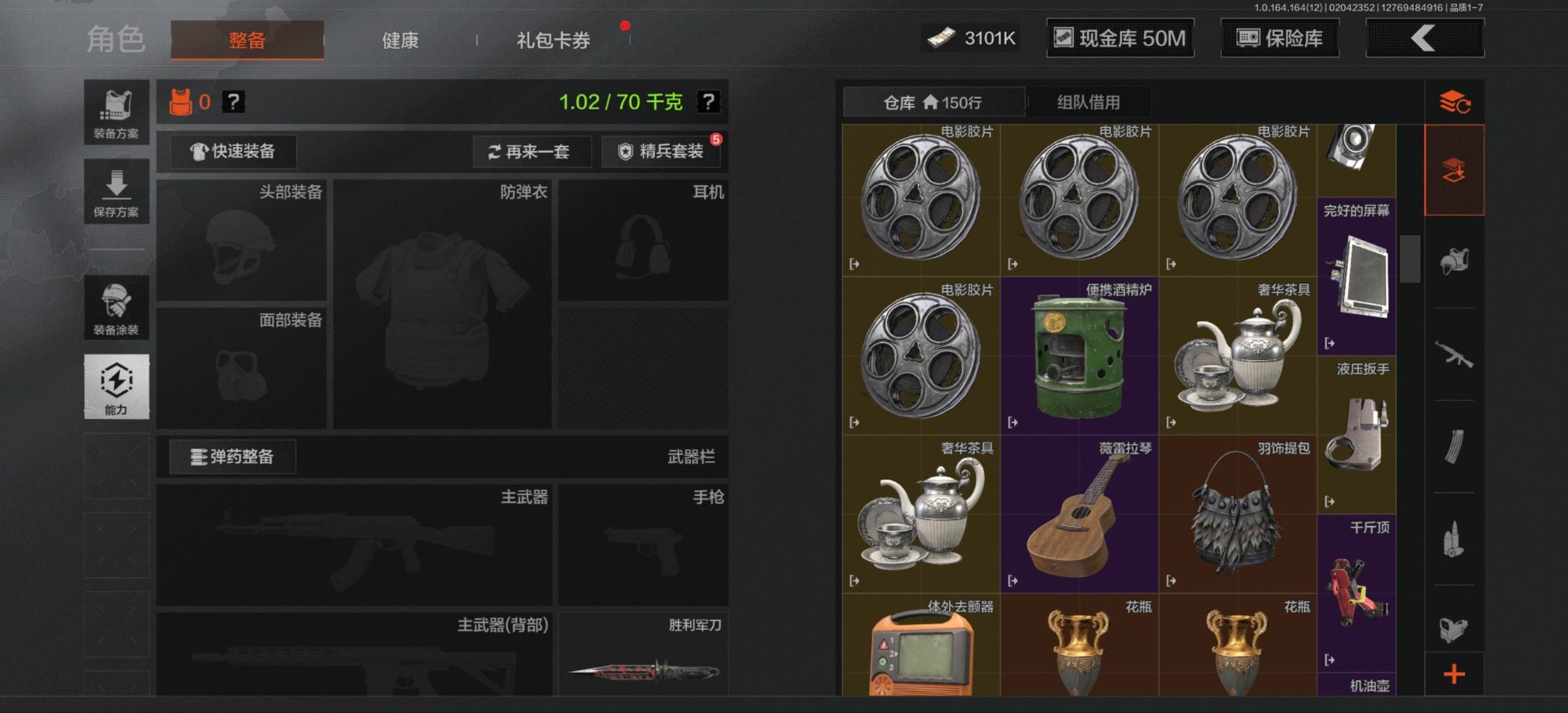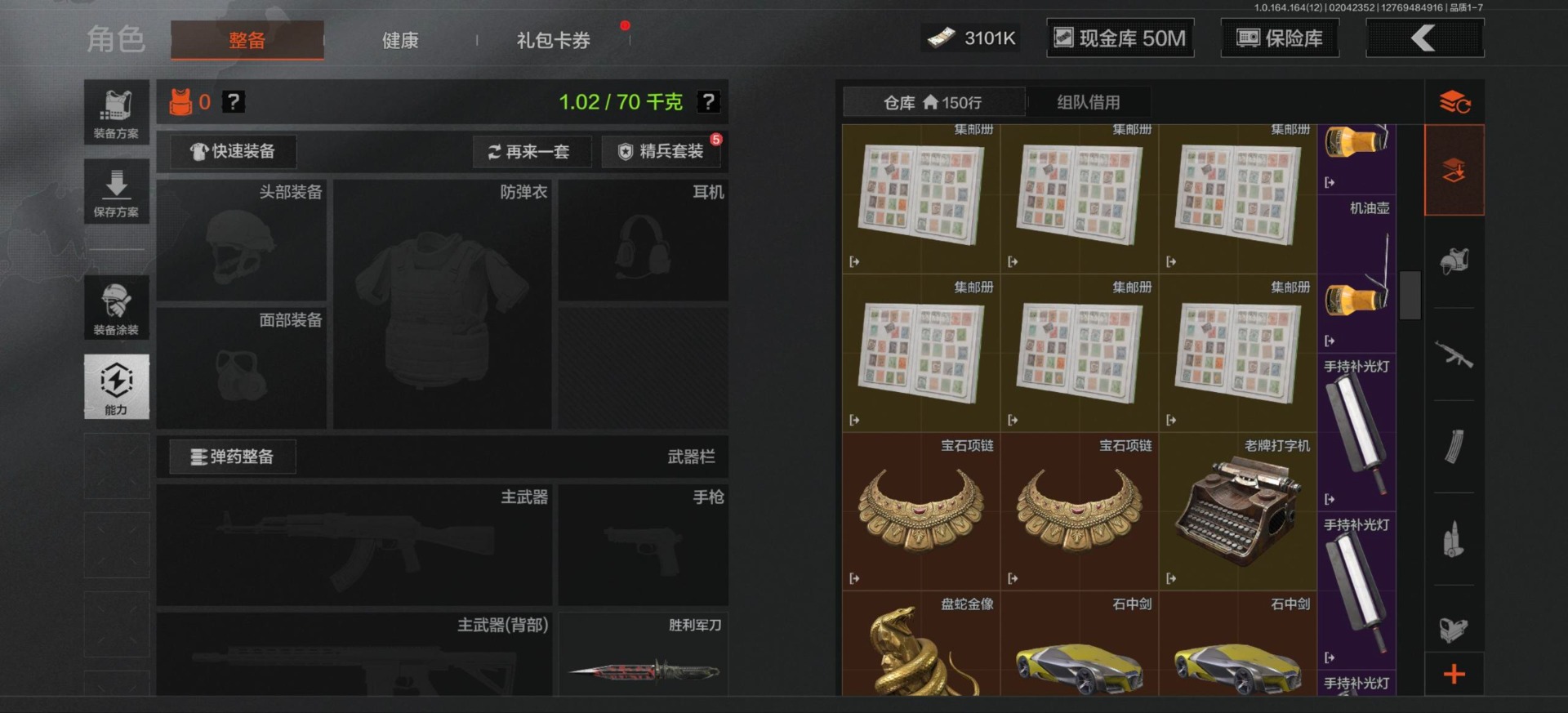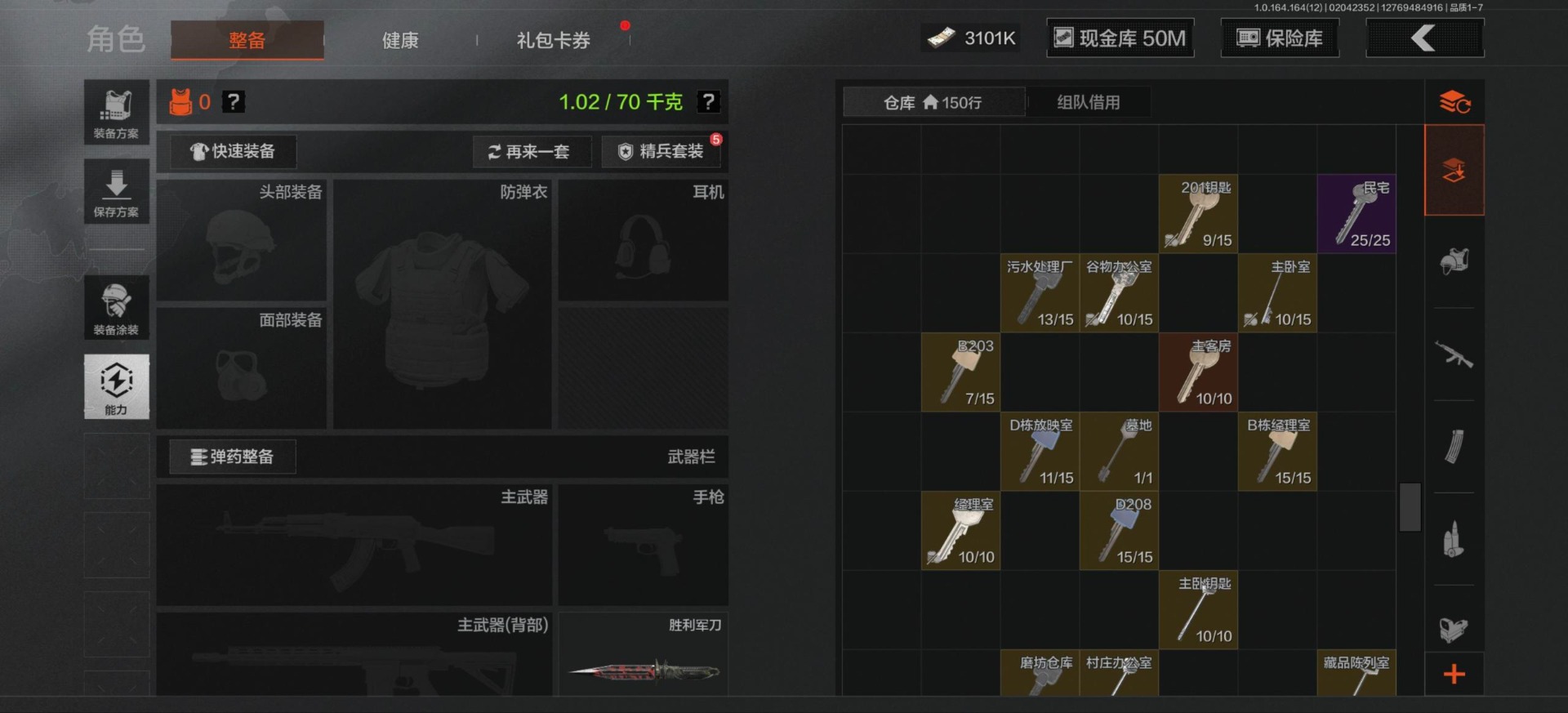 [16548814]库存价值81.1 3近战武器 3金呛皮 可修改实名 【柯恩币数量】3101 【近战武器】工兵铲来战·开山刀胜利军刀 【金色呛皮】旧王圣谕·q191浮鳞影青·q192告丧夜曲·ar57 【紫色呛皮】骑士之剑·akm包络战术·莫辛动感舞步·ace31包络战术·usas12粉绒臻选·sks秘域鎏金·rpk16来战·ak74n自喷网格·h416掌中盾·mp5骑士之剑·aks74u雪原凌锋·svds缟兵玄墨·m110玄戈梨花·t03 【角色装扮(紫)】粉绒暴击套装和平先锋作战套装财团之手作战套装砼城浪客·套装