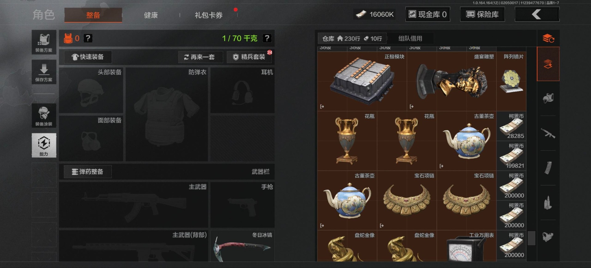 [16549034]库存价值38.8 4近战武器 7金呛皮 可修改实名 【柯恩币数量】16060k 【近战武器】盘牙·彻甲短刃工兵铲冬日冰镐来战·开山刀 【金色呛皮】旧王圣谕·vss告丧夜曲·aug棱光裂变·qbu191旗帜·aek竞技·fal冬夜·ak12蓝色咆哮·h416 【紫色呛皮】竞技·mdr竞技·m110骤羽尖啸·famas鱼跃丹青·ak102饰金·ax50旗帜·rpk16旗帜·svds棱光裂变·ace31棱光裂变·akm棱光裂变·ak74n骑士之剑·groza骑士之剑·沙墨之鹦典礼武备·mk14粉绒臻选·ar30禁止访问·ump45白色丧钟·莫辛神锋·vect45骑士之剑·aks74u湖冰倒影·mp5彻甲铜斑·t03彻甲铜斑·t951 【角色装扮(紫)】鎏金街头套装金狮护身·转运套装野狩骑士套装王国卫队礼装都市夜影套装