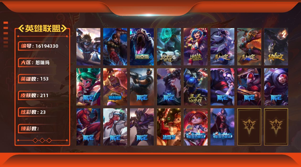 [16194330]【编号23539 可秒换绑】【赛季冲分号!喜欢的宝宝来下单吧!!】 未定级段位-153英雄-211皮肤-23炫彩-2终极-3神话-20限定-16传说-55史诗 【年限皮肤】:替父从军花木兰,广寒仙子嫦娥,王国机神青龙德莱文 【海克斯皮肤】:海克斯科技雷克顿 【冰雪限定】:幸福女神乐芙兰,圣诞糖果棒厄运小姐,圣诞玩偶波比,圣诞老人古拉加斯 【终极皮肤】:灵魂守卫乌迪尔,未来战士伊泽瑞尔 【神话皮肤】:十周年纪念安妮,源代码乐芙兰,海克斯科技雷克顿 【限定皮肤】:冠军之刃锐雯2016,暗杀星慎,sktt1贾克斯,sktt1劫,sktt1李青,ssw辛吉德,sktt1烬,海贼瑞兹,南瓜头费德提克,蒙多蒙多,波比的巧克力工坊,防暴士兵格雷福斯,防暴天使凯尔 【传说皮肤】:大天使长米迦勒凯尔,战场女武神凯尔,烈焰雄心崔丝塔娜,合金巨兽努努和威朗普,女皇艾希,律政大亨蒙多,冰霜之刃艾瑞莉娅,最终boss维迦,苹果机器人布里茨,神拳李青,源计划净化薇恩,银河魔装机神兰博,屠龙勇士潘森,苍穹之光韦鲁斯,泳池派对吉格斯,灌篮高手德莱厄斯 【史诗皮肤】:特战先锋赵信,圣光审判凯尔,天人合一易,钢铁之心希维尔,源代码索拉卡,荒野豺狼沃里克,国王泰达米尔,百夫长贾克斯,少林武僧贾克斯,死神卡尔萨斯,小小骑士阿木木,熔火之心拉莫斯,全金属狂潮拉莫斯,战争血统蒙多,夜行义贼艾瑞莉娅,海克斯科技迦娜,星之守护者迦娜,血石诅咒塔里克,穿着正装的恶魔维迦,绝代智将斯维因,抵抗军天使凯特琳,古墓丽影凯特琳,无畏号墨菲特,沙漠风暴卡特琳娜,源计划雄心卡特琳娜,符文战神雷克顿,龙骑统帅嘉文四世,v字仇杀者布兰德,防弹武僧李青,至高之拳李青,屠龙勇士薇恩,苍穹之光薇恩,深海妖姬卡西奥佩娅,法老王朝内瑟斯,艳后奈德丽,血色之锤波比,飞车暴走族古拉加斯,刺客信条凯南,腥红之月泰隆,刺客信条锐雯,odst地狱伞兵拉克丝,铁血猎人雷恩加尔,绞肉机刽子手德莱文,全金属狂潮杰斯,无限烈焰黛安娜,血羽凤凰奎因,野火之藤婕拉,萌侦探喵尔摩斯,西部牛仔亚索,源计划风亚索,银河魔装机神千珏,黑帮狂花金克丝,职业杀手卢锡安,时之砂艾克,冰雪游神巴德 【王者皮肤】:五杀摇滚鼓手奥拉夫,星空之门内瑟斯,霹雳游侠弗拉基米尔 【勇士皮肤】:创意工坊黑默丁格,烈焰猛士奥拉夫 【典藏皮肤】:法老阿木木,魔导绅士维迦,嗜血狂暴沃里克 【其他