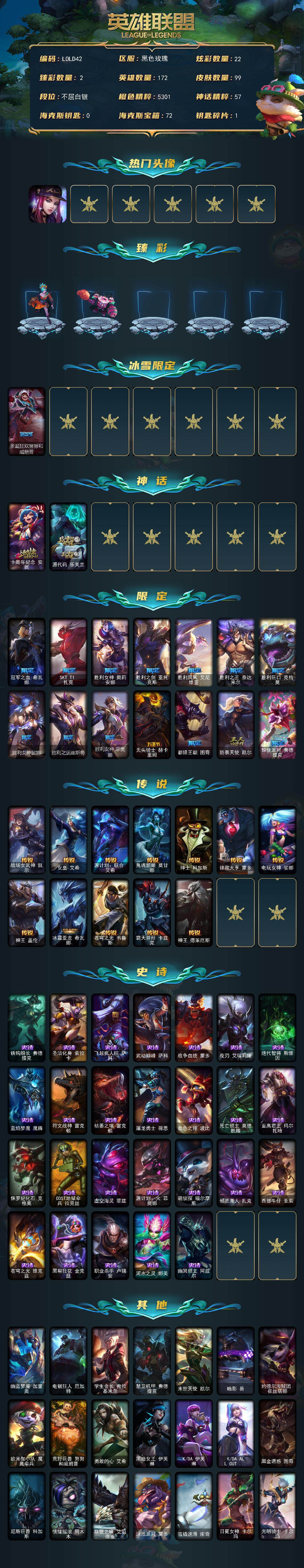 【lold42】172英雄/99皮肤/2神话/15限定/2臻彩/22炫彩/12传说/26史诗/白银账号等级:650/十周年纪念安妮/源代码乐芙兰/kda阿卡丽头像/灵魂莲华锐雯流火/可爱可爱粉红红布里茨/圣诞狂欢努努和威朗普/冠军之血希瓦娜/sktt1扎克/胜利女神奥莉安娜/胜利之剑亚托克斯/胜利凤凰艾尼维亚/胜利之王泰达米尔/胜利巨口克格莫/胜利女神娑娜/胜利之运崔斯特/胜利女神菲奥娜/无头骑士赫卡里姆/都铎王朝图奇/防暴天使凯尔/惊悚派对费德提克/战场女武神凯尔/女皇艾希/源计划联合艾希/鬼魂新娘莫甘娜/绅士科加斯/律政大亨蒙多/电玩女神娑娜/神王盖伦/冰霜亚龙希瓦娜/苍穹之光韦鲁斯/霸天异形卡兹克/神王德莱厄斯/铁钩船长费德提克/圣洁化身索拉卡/飞越疯人院萨科/武动巅峰萨科/战争血统蒙多/夜刃艾瑞莉娅/绝代智将斯维因/蓝焰梦魔魔腾/符文战神雷克顿/枯萎之壤雷克顿/屠龙勇士薇恩/血色之锤波比/死亡领主莫德凯撒/至高君王玛尔扎哈/侏罗纪化石克格莫/odst地狱伞兵拉克丝/虚空海灵菲兹/源计划火菲奥娜/萌侦探喵尔摩斯/邪恶魔人扎克/西部牛仔亚索/苍穹之光维克兹/黑帮狂花金克丝/职业杀手卢锡安/河水之灵娜美/幽冥领主阿兹尔/幽蓝梦魇加里奥/电锯狂人厄加特/学生会长弗拉基米尔/禁卫机甲费德提克/末世天使凯尔/暗影易/约德尔海贼团崔丝塔娜/欧米伽小队魔鬼伞兵/荒野巨兽努努和威朗普/勇敢的心艾希/黑暗女王伊芙琳/kda伊芙琳/kdaallout伊芙琳/黑金诱惑图奇/尼斯巨兽科加斯/情绪摇滚阿木木/联盟之喙艾尼维亚/泳池派对蒙多/雪橇速滑库奇/日冕女神卡尔玛/光明骑士卡尔玛/冰壶选手维迦/传统造型特朗德尔/荒野之咬雷克顿/黑色玫瑰假面舞会伊莉丝/荒漠之咬卡西奥佩娅/法国女仆奈德丽/五杀摇滚吉他手莫德凯撒/kda阿卡丽/银色闪电凯南/医学博士凯南/极寒慎/符文生物泽拉斯/破败军团希瓦娜/kda阿狸/永恒之森阿狸/无情重炮格雷福斯/苔原猎手菲兹/瑟庄妮逐晓者/血石骑士赫卡里姆/kda卡莎/灵之菊纳尔/玉剑传说寒潭夭夭