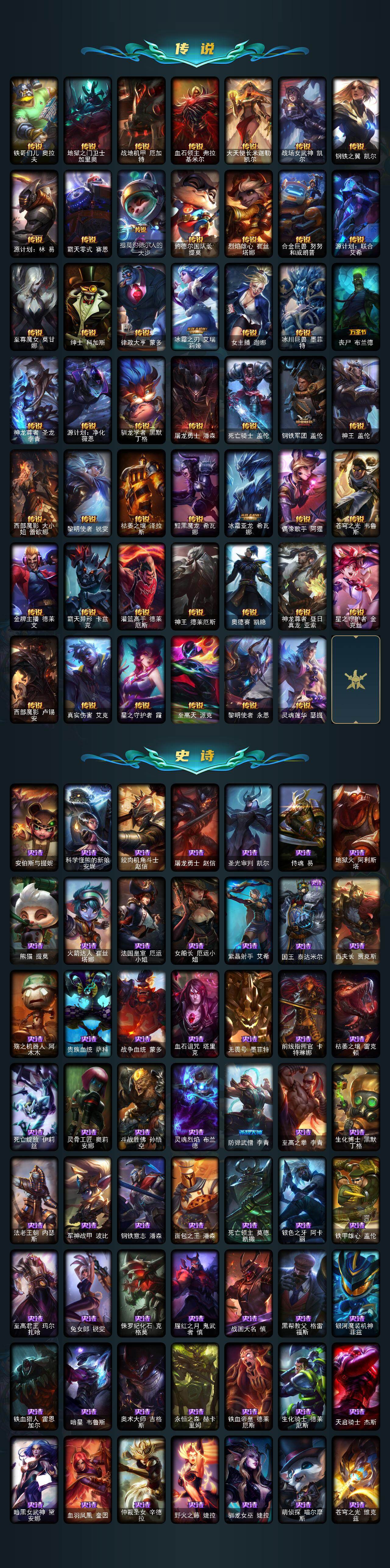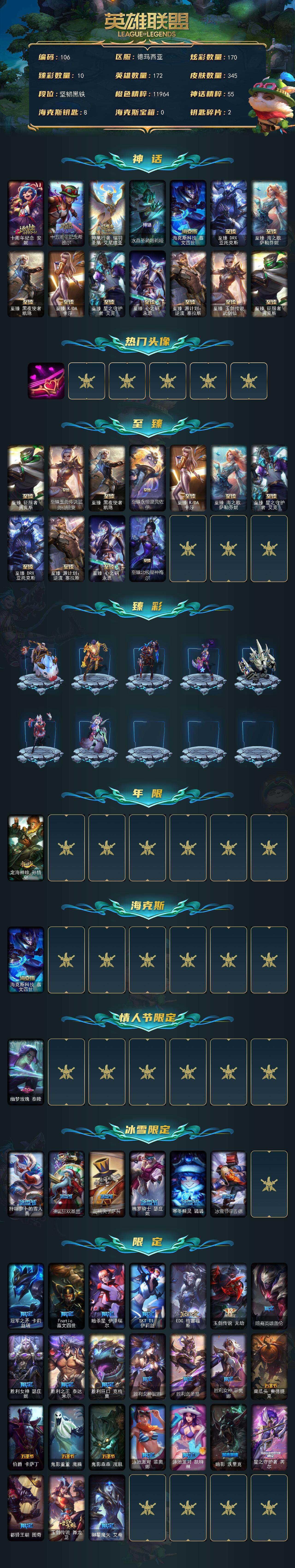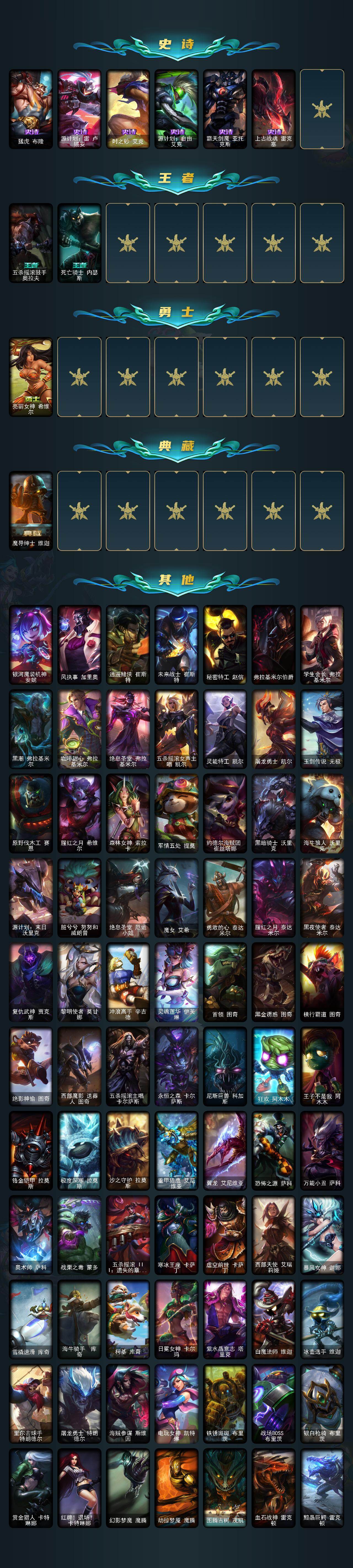 172英雄-345皮肤-未定级段位-172英雄-345皮肤-170炫彩-0终极-16神话-32限定-48传说-62史诗 【神话皮肤】:十周年纪念安妮,十五周年纪念希维尔,神凰行者瑞羽圣凰艾尼维亚,水晶圣骑塔莉娅,海克斯科技嘉文四世,至臻征服者贾克斯,至臻drx亚托克斯,至臻海之歌萨勒芬妮,至臻黑夜使者凯隐,至臻kda卡莎,至臻星之守护者艾克,至臻心之钢永恩,至臻源计划逆流塞拉斯,至臻玉剑传说武剑仙 【热门头像】:爱情