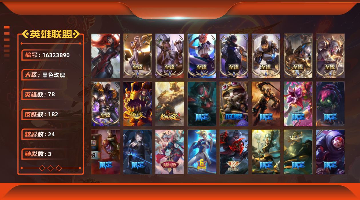 [16323890]【店主推荐捡漏号】未定级段位-78英雄-182皮肤-24炫彩-1终极-8神话-35限定-22传说-50史诗 【至臻皮肤】:至臻魅惑女巫厄运小姐,至臻女帝黛安娜,至臻kda卡莎,至臻真实伤害赛娜,至臻未来战士卢锡安,至臻真实伤害奇亚娜,至臻斗魂觉醒派克,至臻神龙尊者炎龙瑟提 【臻彩皮肤】:无畏骑士瑟庄妮赤子初心,玉剑传说神机花火青竹,魔女阿卡丽虚荣 【年限皮肤】:定海神珍孙悟空,醒狮克格莫,北辰之威内瑟斯 【冰雪限定】:圣诞狂欢努努和威朗普,圣诞狂欢基兰,阿木木“主人不要我了”,胡桃夹子萨科,邪恶圣诞老人维迦,圣诞玩偶波比,圣诞老人古拉加斯,冰雪节辛吉德 【终极皮肤】:武装战姬厄运小姐 【神话皮肤】:至臻真实伤害奇亚娜,至臻真实伤害赛娜,至臻斗魂觉醒派克,至臻kda卡莎,至臻魅惑女巫厄运小姐,至臻女帝黛安娜,至臻神龙尊者炎龙瑟提,至臻未来战士卢锡安 【限定皮肤】:冠军之箭艾希,fnatic迦娜,fnatic库奇,sktt1贾克斯,ssw辛吉德,sktt1阿利斯塔,sktt1雷克顿,sktt1瑞兹,sktt1奥拉夫,星之守护者伊泽瑞尔,玉剑传说无劫,鬼影重重魔腾,鬼影森森茂凯,泳池派对奥莉安娜,泳池派对黑默丁格,泳池派对蕾欧娜,密林猎手提莫,玉剑传说翼剑仙,征服者诺提勒斯,防暴士兵辛吉德,海之歌奈德丽,惊悚派对阿木木,惊悚派对费德提克,警用试作体k9内瑟斯 【传说皮肤】:恶魔男爵瑞兹,提莫约德尔人的一大步,约德尔国队长提莫,烈焰雄心崔丝塔娜,女皇艾希,源计划联合艾希,至尊魔女莫甘娜,双重冰晶艾尼维亚,电玩女神娑娜,女主播迦娜,红色男爵库奇,未来战士凯特琳,陆地王者4wd布里茨,上古战魂魔腾,战斗学院伊泽瑞尔,死亡骑士盖伦,宇航员诺提勒斯,金牌主播德莱文,黑夜使者亚索,暗星尊烬,星之守护者洛,至高天派克 【史诗皮肤】:冰霜烈焰安妮,翼骑统领赵信,摄魂男爵弗拉基米尔,天人合一易,战争机器赛恩,钢铁之心希维尔,源代码索拉卡,熊猫提莫,火箭达人崔丝塔娜,法国皇室厄运小姐,黑帮狂花厄运小姐,女船长厄运小姐,百夫长贾克斯,少林武僧贾克斯,刀锋女王莫甘娜,五杀摇滚键盘手娑娜,特种部队普朗克,恐惧新星普朗克,穿着正装的恶魔维迦,抵抗军天使凯特琳,古墓丽影凯特琳,蓝焰梦魔魔腾,枯萎之壤雷克顿,地下拳王李青,法老王朝内瑟斯,血色之锤波比,飞车暴走族古拉加斯,大夏武士潘森,冰川勇者伊泽瑞尔