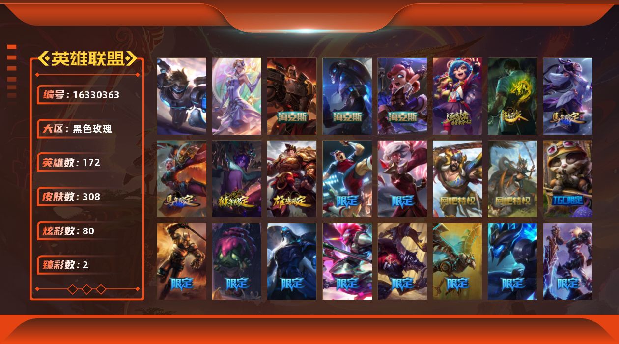 [16330363]【特价出售/店主推荐】白银段位-172英雄-308皮肤-80炫彩-2终极-4神话-65限定-32传说-69史诗 【热门头像】:觅心游侠卢锡安头像 【臻彩皮肤】:冠军之志瑞兹凯旋圣装,泳池派对辛德拉荔枝枝连击 【年限皮肤】:龙的传人李青,替父从军花木兰,广寒仙子嫦娥,紫金罗刹莫甘娜,张辽文远 【海克斯皮肤】:海克斯科技安妮,海克斯科技玛尔扎哈,恐惧新星德莱厄斯 【冰雪限定】:幸福女神乐芙兰,阿木木“主人不要我了”,胡桃夹子萨科,邪恶圣诞老人维迦,雪默丁格,圣诞玩偶波比,圣诞驯鹿克格莫,魄罗骑士瑟庄妮,圣诞老人德莱文,圣诞老人布隆 【终极皮肤】:大元素使拉克丝,未来战士伊泽瑞尔 【神话皮肤】:十周年纪念安妮,海克斯科技安妮,海克斯科技玛尔扎哈,恐惧新星德莱厄斯 【限定皮肤】:卧虎藏龙贾克斯,冠军之刃锐雯,冠军之血希瓦娜,冠军之矛卡莉丝塔,冠军之刃锐雯2016,冠军之隐劫,冠军之志瑞兹,fnatic迦娜,fnatic嘉文四世,fnatic卡尔萨斯,fnatic库奇,暗杀星蒙多,暗杀星努努和威朗普,暗杀星慎,sktt1贾克斯,sktt1李青,sktt1薇恩,sktt1阿利斯塔,sktt1雷克顿,sktt1瑞兹,sktt1艾克,ssg塔莉垭,ig乐芙兰,edg格雷福斯,edg佛耶戈,勇敢的心德莱厄斯,电玩勇者锐雯,电玩女神阿狸,胜利之剑亚托克斯,胜利凤凰艾尼维亚,胜利之王泰达米尔,胜利剑圣易,海贼瑞兹,灵魂收割者索拉卡,鬼影森森茂凯,泳池派对厄运小姐,泳池派对格雷福斯,泳池派对雷克顿,泳池派对李青,密林猎手提莫,野兽猎人瑟庄妮,野兽猎人泰达米尔,电玩战魂赫卡里姆,都铎王朝图奇,钢铁之翼艾尼维亚,征服者卡尔玛,制胜金靴李青,防暴天使凯尔,惊悚派对阿木木,警用试作体k9内瑟斯 【传说皮肤】:地狱之门卫士加里奥,魔幻卡牌崔斯特,邪鸦魅影乐芙兰,大天使长米迦勒凯尔,战场女武神凯尔,霸天零式赛恩,欧米伽小队幽灵特工,鬼魂新娘莫甘娜,绅士科加斯,战地巨兽科加斯,双重冰晶艾尼维亚,律政大亨蒙多,冰霜之刃艾瑞莉娅,红色男爵库奇,苹果机器人布里茨,神拳李青,源计划净化薇恩,银河魔装机神兰博,屠龙勇士潘森,源计划超体莫德凯撒,钢铁军团盖伦,黎明使者锐雯,星之守护者拉克丝,冰霜亚龙希瓦娜,符文战熊沃利贝尔,女校长菲奥娜,灌篮高手德莱厄斯,神王德莱厄斯,西部魔影卢锡安,天煞劫,真实伤害艾克,黎明使