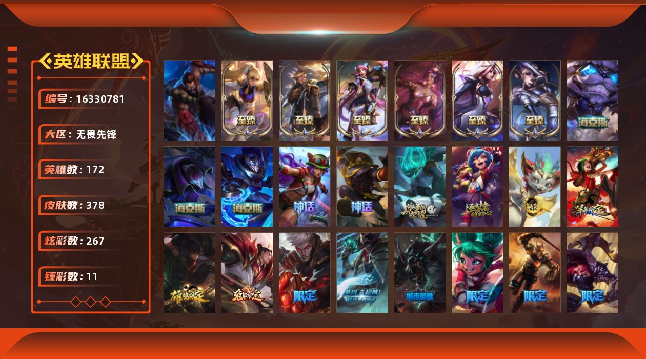[16330781]【店主推荐捡漏号!可直接换绑】未定级段位-172英雄-378皮肤-267炫彩-1终极-14神话-39限定-35传说-93史诗 【热门头像】:爱意绵绵头像,觅心之翼奎因头像 【至臻皮肤】:至臻剪纸仙灵希维尔,至臻绝息圣堂厄运小姐,至臻西部魔影伊芙琳,至臻灵能特工伊泽瑞尔,至臻战斗学院蕾欧娜,至臻幻灵战斗猫金克丝 【臻彩皮肤】:天龙之子卡莎飞龙乘云,无畏骑士瑟庄妮赤子初心,张辽文远炫金将军,天煞劫恒星游历者,星之守护者辛德拉未来之光,霸天巨兽雪崩墨菲特,可爱可爱粉红红布里茨,魔女阿卡丽虚荣,净雪之月莫甘娜冬虹,心之钢伊泽瑞尔锐意曲风,霸天异形卡兹克丛林灾厄 【年限皮肤】:神龙烈焰金克丝,虎痴之拳蔚,剪纸仙灵盖伦,天龙之子斯莫德,点心宝贝阿木木 【海克斯皮肤】:海克斯科技魔腾,海克斯科技嘉文四世,海克斯科技吉格斯 【情人节限定】:觅心猎手薇恩 【冰雪限定】:圣诞开心鬼提莫,圣诞糖果棒厄运小姐,圣诞狂欢基兰,阿木木“主人不要我了”,胡桃夹子萨科,平安夜女神娑娜,喜庆之树茂凯,圣诞老人古拉加斯,魄罗骑士瑟庄妮,冰雪节辛吉德 【终极皮肤】:灵魂守卫乌迪尔 【神话皮肤】:十周年纪念安妮,源代码乐芙兰,十五周年纪念希维尔,新卧虎藏龙贾克斯,神凰行者瑞羽圣凰艾尼维亚,海克斯科技嘉文四世,海克斯科技吉格斯,海克斯科技魔腾,至臻西部魔影伊芙琳,至臻幻灵战斗猫金克丝,至臻剪纸仙灵希维尔,至臻绝息圣堂厄运小姐,至臻灵能特工伊泽瑞尔,至臻战斗学院蕾欧娜 【限定皮肤】:地底世界崔斯特,fnatic古拉加斯,ssw图奇,ssw雷恩加尔,ssw锤石,sktt1扎克,暗裔英雄盖伦,胜利机器人布里茨,胜利巨口克格莫,南瓜头费德提克,伯爵卡萨丁,鬼影森森茂凯,魅惑女巫迦娜,魅惑女巫赛娜,泳池派对黑默丁格,泳池派对嘉文四世,暗影沃里克,波比的巧克力工坊,都铎王朝图奇,征服者韦鲁斯,防暴天使凯尔,海之歌萨勒芬妮,警用试作体k9内瑟斯 【传说皮肤】:地狱之门卫士加里奥,大天使长米迦勒凯尔,战场女武神凯尔,恶魔男爵瑞兹,烈焰雄心崔丝塔娜,合金巨兽努努和威朗普,女皇艾希,源计划联合艾希,恶魔之刃泰达米尔,鬼魂新娘莫甘娜,双重冰晶艾尼维亚,律政大亨蒙多,冰霜之刃艾瑞莉娅,红色男爵库奇,最终boss维迦,女警狙击凯特琳,未来战士凯特琳,陆地王者4wd布里茨,苹果机器人布里茨,冰川巨兽墨菲特,上古战魂魔腾,源计划泯灭雷