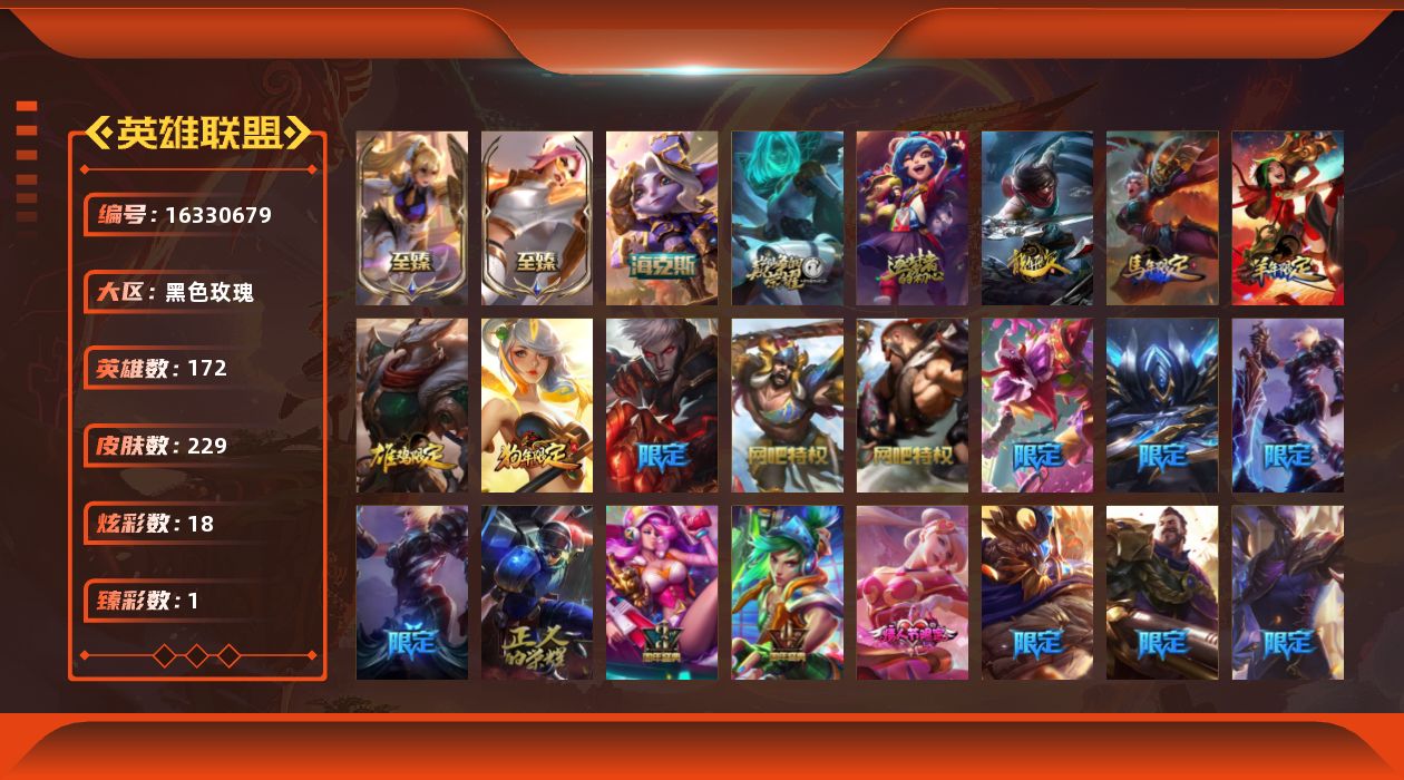 [16330679]黄金段位-172英雄-229皮肤-18炫彩-0终极-5神话-36限定-20传说-66史诗 【至臻皮肤】:至臻战斗学院蕾欧娜,至臻福牛守护者菲奥娜 【臻彩皮肤】:可爱可爱粉红红布里茨 【年限皮肤】:银龙裁决泰隆,替父从军花木兰,神龙烈焰金克丝,司马懿仲达,春晖神女拉克丝 【海克斯皮肤】:海克斯科技崔丝塔娜 【情人节限定】:甜心宝贝娑娜 【冰雪限定】:圣诞狂欢努努和威朗普,圣诞糖果棒厄运小姐,阿木木“主人不要我了”,胡桃夹子萨科,英勇玩具兵普朗克,圣诞老人古拉加斯,圣诞驯鹿克格莫,魄罗骑士瑟庄妮,冰雪节玛尔扎哈 【神话皮肤】:十周年纪念安妮,源代码乐芙兰,海克斯科技崔丝塔娜,至臻福牛守护者菲奥娜,至臻战斗学院蕾欧娜 【限定皮肤】:冠军之刃锐雯,冠军之刃锐雯2016,冠军掠夺者卡兹克,fnatic嘉文四世,ssw雷恩加尔,ssw锤石,ssg纳尔,电玩女神厄运小姐,电玩勇者锐雯,胜利之树茂凯,胜利呛神格雷福斯,胜利之剑亚托克斯,胜利机器人布里茨,胜利凤凰艾尼维亚,胜利之王泰达米尔,泳池派对塔里克,野兽猎人德莱文,野兽猎人泰达米尔,征服者韦鲁斯,防暴天使凯尔,惊悚派对费德提克 【传说皮肤】:地狱之门卫士加里奥,大天使长米迦勒凯尔,烈焰雄心崔丝塔娜,女皇艾希,恶魔之刃泰达米尔,律政大亨蒙多,电玩女神娑娜,最终boss维迦,未来战士凯特琳,冰川巨兽墨菲特,战斗学院伊泽瑞尔,腥红之月鬼武姬阿卡丽,月蚀骑士蕾欧娜,黎明使者锐雯,冰霜亚龙希瓦娜,偶像歌手阿狸,宇航员诺提勒斯,女校长菲奥娜,泳池派对吉格斯,真实伤害艾克 【史诗皮肤】:科学怪熊的新娘安妮,绞肉机角斗士赵信,重生之沙费德提克,地狱火阿利斯塔,战争机器赛恩,钢铁之心希维尔,源代码索拉卡,兔宝宝提莫,狼外婆沃里克,荒野豺狼沃里克,炼金狂士辛吉德,死神卡尔萨斯,小小骑士阿木木,贵族血统萨科,战争血统蒙多,掠星魔刃卡萨丁,夜行义贼艾瑞莉娅,血石诅咒塔里克,抵抗军天使凯特琳,古墓丽影凯特琳,铁血狙击手凯特琳,无畏号墨菲特,海贼魅影卡特琳娜,前线指挥官卡特琳娜,死亡绽放伊莉丝,三昧真火孙悟空,斗战胜佛孙悟空,冰晶之核布兰德,防弹武僧李青,深海妖姬卡西奥佩娅,战地机甲斯卡纳,法老王朝内瑟斯,大夏武士潘森,铁血女忍阿卡丽,钢铁烈阳蕾欧娜,源计划山蕾欧娜,腥红之月泰隆,侏罗纪化石克格莫,odst地狱伞兵拉克丝,沙之守护泽拉斯,钢之逆鳞希瓦娜