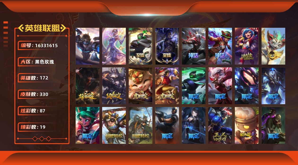 [16331615]未定级段位-172英雄-330皮肤-87炫彩-2终极-5神话-72限定-33传说-44史诗 【至臻皮肤】:至臻征服者贾克斯,至臻墨之影武者亚索 【臻彩皮肤】:天龙之子卡莎飞龙乘云,巅峰剑仙菲奥娜天神下凡,无畏圣弩薇恩绝境狂杀,无畏游侠卢锡安不败圣呛,无畏骑士瑟庄妮赤子初心,无畏意志墨菲特必不可挡,冠军之刃锐雯2016凯旋圣装,神龙尊者圣龙李青登龙,西部魔影卢锡安贝利尔之怠,星之守护者娑娜未来之光,泳池派对辛德拉荔枝枝连击,霸天异形卡兹克刹那银光,可爱可爱粉红红布里茨,魔女阿卡丽虚荣,净雪之月莫甘娜冬虹,玉剑传说星仙子丁香,斗魂觉醒伊芙琳幻之魂焰,咖啡甜心璐璐海盐泡芙 【年限皮肤】:虎痴之拳蔚,王国机神白虎贾克斯,招财进宝提莫,龙腾虎跃瑟提,天龙之子斯莫德,点心宝贝阿木木 【情人节限定】:甜心之羽霞,碎心之拳蔚,穿心之剑菲奥娜,觅心萝莉金克丝,觅心猎手薇恩,觅心魔灵奥莉安娜,幽梦玫瑰辛德拉,水晶玫瑰迦娜 【冰雪限定】:冬境仙灵索拉卡,圣诞精灵崔丝塔娜,圣诞狂欢努努和威朗普,阿木木“主人不要我了”,平安夜女神娑娜,圣诞捣蛋鬼金克丝,北极星守护者卢锡安 【终极皮肤】:大元素使拉克丝,未来战士伊泽瑞尔 【神话皮肤】:十周年纪念安妮,十五周年纪念希维尔,殿堂传奇薇恩,至臻征服者贾克斯,至臻墨之影武者亚索 【限定皮肤】:冠军之箭艾希,fnatic古拉加斯,fnatic迦娜,暗杀星蒙多,ssw辛吉德,ssw雷恩加尔,ssw锤石,sktt1瑞兹,sktt1奥拉夫,sktt1扎克,ig菲奥娜,ig乐芙兰,dwg烬,dwg蕾欧娜,edg格雷福斯,edg佛耶戈,drx亚托克斯,drx阿卡丽,玉剑传说舞剑仙,暗裔英雄盖伦,胜利之王泰达米尔,胜利巨口克格莫,胜利女神娑娜,胜利剑圣易,海贼瑞兹,灵魂收割者索拉卡,南瓜头王子阿木木,鬼影重重魔腾,鬼影森森茂凯,魅惑女巫奈德丽,魅惑女巫波比,泳池派对布隆,泳池派对黑默丁格,泳池派对嘉文四世,泳池派对雷克顿,泳池派对蕾欧娜,泳池派对瑟提,泳池派对佐伊,怦然心动凯特琳,野兽猎人瑟庄妮,野兽猎人泰达米尔,波比的巧克力工坊,御星魔矢艾希,战场boss吉格斯,征服者贾克斯,征服者卡尔玛,防暴士兵格雷福斯,防暴天使凯尔,海之歌萨勒芬妮,海之歌泽丽,双城之战2微光实验室辛吉德 【传说皮肤】:地狱之门卫士加里奥,血石领主弗拉基米尔,霸天零式赛恩,日蚀骑士希维尔,