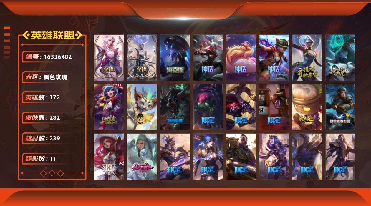 [16336402]【店主推荐捡漏号!可直接换绑】未定级段位-172英雄-282皮肤-239炫彩-0终极-12神话-40限定-25传说-56史诗 【至臻皮肤】:至臻海珀利安小队x09星环灵风迦娜,至臻暗裔英雄嘉文四世,至臻灵魂莲华拉克丝,至臻永恒星灵佐伊,至臻t1塞拉斯 【臻彩皮肤】:无畏骑士瑟庄妮赤子初心,冠军典狱长锤石凯旋圣装,神龙尊者圣龙李青龙腾云起,泳池派对辛德拉荔枝枝连击,霸天巨兽雪崩墨菲特,源计划火菲奥娜惩戒,星之吞噬者莫甘娜热情之末,幻灵战斗兔锐雯梦幻强袭,春晖神女艾希玉露金风 【年限皮肤】:天龙之子斯莫德,点心宝贝阿木木 【海克斯皮肤】:海克斯科技玛尔扎哈 【情人节限定】:水晶玫瑰斯维因 【冰雪限定】:阿木木“主人不要我了”,圣诞玩偶波比,圣诞驯鹿克格莫,魄罗骑士瑟庄妮,冰雪节玛尔扎哈,北极星守护者卢锡安 【神话皮肤】:十周年纪念安妮,源代码乐芙兰,十五周年纪念希维尔,黎明使者卡尔玛,殿堂传奇薇恩,超级音乐粉丝古拉加斯,海克斯科技玛尔扎哈,至臻海珀利安小队x09星环灵风迦娜 【限定皮肤】:钢铁军团拉克丝,fnatic迦娜,暗杀星蒙多,sktt1婕拉,ssw图奇,ssw雷恩加尔,ig乐芙兰,drx艾希,drx凯特琳,女帝厄运小姐,暗裔英雄盖伦,胜利呛神格雷福斯,胜利女神奥莉安娜,胜利之剑亚托克斯,胜利呛神卢锡安,胜利机器人布里茨,胜利女神瑟庄妮,胜利凤凰艾尼维亚,胜利之王泰达米尔,胜利巨口克格莫,胜利女神娑娜,胜利剑圣易,泳池派对雷克顿,泳池派对蕾欧娜,泳池派对塔里克,泳池派对塔莉垭,暗影沃里克,都铎王朝图奇,防暴士兵辛吉德,海之歌永恩,惊悚派对阿木木 【传说皮肤】:地狱之门卫士加里奥,战地机甲厄加特,战场女武神凯尔,霸天零式赛恩,欧米伽小队幽灵特工,合金巨兽努努和威朗普,幻灵战斗队长厄运小姐,鬼魂新娘莫甘娜,魔女伊芙琳,女警狙击凯特琳,上古战魂魔腾,神龙尊者圣龙李青,源计划净化薇恩,青花瓷伊泽瑞尔,源计划超体莫德凯撒,腥红之月鬼武姬阿卡丽,星之守护者阿卡丽,钢铁军团盖伦,星之守护者拉克丝,偶像歌手阿狸,宇航员诺提勒斯,霸天异形卡兹克,灌篮高手德莱厄斯,暗星尊烬,源计划毁灭派克 【史诗皮肤】:安伯斯与提妮,特战先锋赵信,女船长厄运小姐,紫晶射手艾希,百夫长贾克斯,黑色荆棘莫甘娜,卡尔萨斯祸害之光,贵族血统萨科,武动巅峰萨科,特种部队普朗克,北领前线斯维因,霸天巨兽墨菲特