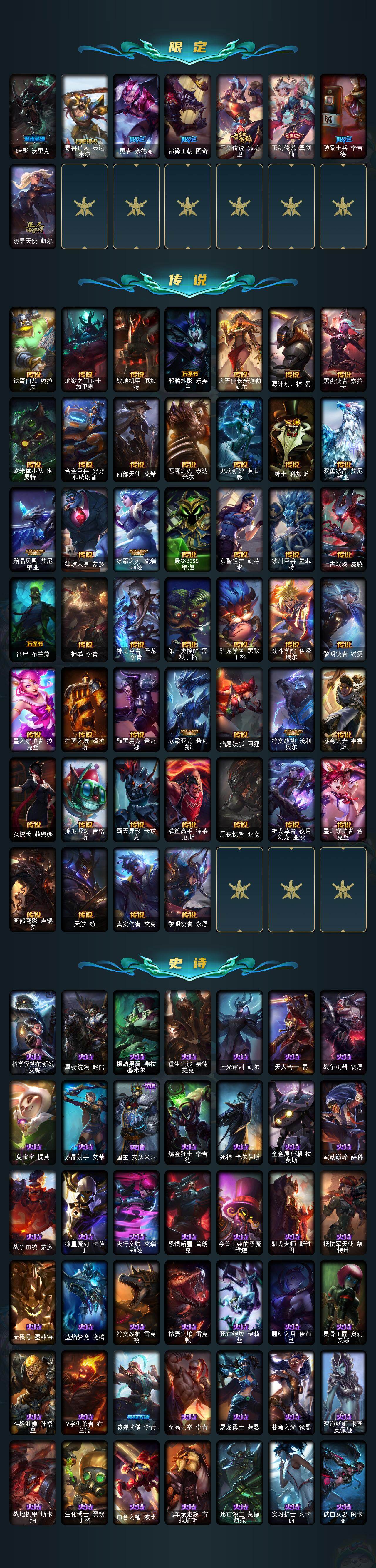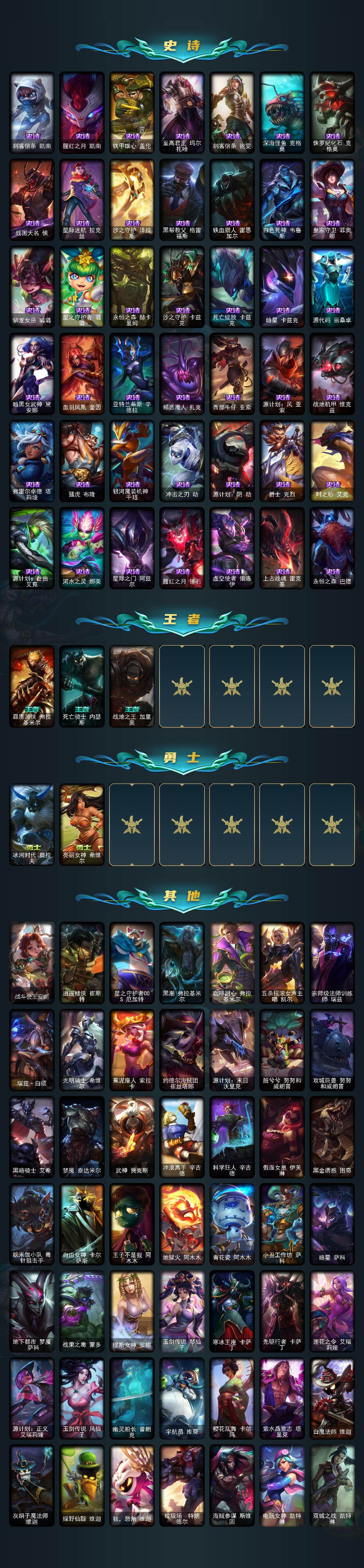 单双未定级段位-172英雄-351皮肤-115炫彩-0终极-17神话-43限定-46传说-84史诗 【神话皮肤】:十周年纪念安妮,源代码乐芙兰,十五周年纪念希维尔,灰烬杀手塞拉斯,海克斯科技吉格斯,零之呛骑赫卡里姆,摄魂使者薇恩,至臻真实伤害亚索,至臻drx亚托克斯,至臻黑夜使者凯隐,至臻kdaallout卡莎,至臻灵能特工伊泽瑞尔,至臻魅惑女巫莫甘娜,至臻神凰行者烈羽焰凰霞,至臻心之钢永恩,至臻源计划逆流塞拉斯,至臻玉剑传说武剑仙 【热门头像】:爱情之歌头像,永恒之森霞头像 【至臻皮肤】:至臻魅惑女巫莫甘娜,至臻灵能特工伊泽瑞尔,至臻玉剑传说武剑仙锐雯,至臻黑夜使者凯隐,至臻kdaallout卡莎,至臻真实伤害亚索,至臻drx亚托克斯,至臻神凰行者烈羽焰凰霞,至臻源计划逆流塞拉斯,至臻心之钢永恩 【臻彩皮肤】:天龙之子卡莎飞龙乘云,无畏骑士瑟庄妮赤子初心,神龙尊者圣龙李青龙腾云起,玉剑传说无影竞星,玉剑传说舞剑仙承影,星之守护者娑娜未来之光,黎明使者锐雯黑夜使者,咖啡甜心金克丝核桃巴菲,星之守护者金克丝黑洞,西部天使赛娜贝利尔之怠,幻灵战斗蝠薇恩梦幻强袭,幻灵战斗兔锐雯梦幻强袭,可爱可爱粉红红布里茨,魔女阿卡丽虚荣,净雪之月莫甘娜冬虹 【年限皮肤】:王国机神青龙德莱文,天龙之子斯莫德 【海克斯皮肤】:摄魂使者薇恩,海克斯科技吉格斯,零之呛骑赫卡里姆 【冰雪限定】:圣诞狂欢努努和威朗普,阿木木“主人不要我了”,圣诞老人古拉加斯,圣诞驯鹿克格莫,魄罗骑士瑟庄妮 【限定皮肤】:创星之灵璐璐,暗杀星蒙多,ssw泰隆,sktt1艾克,sktt1奥拉夫,sktt1烬,edg佛耶戈,drx艾希,勇敢的心德莱厄斯,玉剑传说无影,暗裔英雄盖伦,胜利呛神格雷福斯,胜利女神奥莉安娜,胜利之剑亚托克斯,胜利呛神卢锡安,胜利机器人布里茨,胜利女神瑟庄妮,胜利凤凰艾尼维亚,胜利之王泰达米尔,胜利巨口克格莫,胜利女神娑娜,胜利剑圣易,南瓜头费德提克,魅惑女巫波比,魅惑女巫菲奥娜,泳池派对雷克顿,机械迷城加里奥,破空呛骑孙悟空,暗影沃里克,野兽猎人泰达米尔,勇者奈德丽,都铎王朝图奇,玉剑传说舞龙卫,玉剑传说翼剑仙,防暴士兵辛吉德,防暴天使凯尔 【传说皮肤】:铁哥们儿奥拉夫,地狱之门卫士加里奥,战地机甲厄加特,邪鸦魅影乐芙兰,大天使长米迦勒凯尔,源计划林易,黑夜使者索拉卡,欧米伽小队幽灵特工,合金巨兽努努和威朗普,西部天使艾希,恶魔之刃泰达米尔,鬼魂新娘莫甘娜,绅士科加斯,双重冰晶艾尼维亚,黯晶凤凰艾尼维亚,律政大亨蒙多,冰霜之刃艾瑞莉娅,最终boss维迦,女警狙击凯特琳,冰川巨兽墨菲特,上古战魂魔腾,丧尸布兰德,神拳李青,神龙尊者圣龙李青,第三类接触黑默丁格,驯龙学者黑默丁格,战斗学院伊泽瑞尔,黎明使者锐雯,星之守护者拉克丝,枯萎之壤泽拉斯,黯黑魔龙希瓦娜,冰霜亚龙希瓦娜,焰尾妖狐阿狸,符文战熊沃利贝尔,苍穹之光韦鲁斯,女校长菲奥娜,泳池派对吉格斯,霸天异形卡兹克,灌篮高手德莱厄斯,黑夜使者亚索,神龙尊者夜月幻龙亚索,星之守护者金克丝,西部魔影卢锡安,天煞劫,真实伤害艾克,黎明使者永恩 【史诗皮肤】:科学怪熊的新娘安妮,翼骑统领赵信,摄魂男爵弗拉基米尔,重生之沙费德提克,圣光审判凯尔,天人合一易,战争机器赛恩,兔宝宝提莫,紫晶射手艾希,国王泰达米尔,炼金狂士辛吉德,死神卡尔萨斯,全金属狂潮拉莫斯,武动巅峰萨科,战争血统蒙多,掠星魔刃卡萨丁,夜行义贼艾瑞莉娅,恐惧新星普朗克,穿着正装的恶魔维迦,驯龙大师斯维因,抵抗军天使凯特琳,无畏号墨菲特,蓝焰梦魔魔腾,符文战神雷克顿,枯萎之壤雷克顿,死亡绽放伊莉丝,腥红之月伊莉丝,灵骨工匠奥莉安娜,斗战胜佛孙悟空,v字仇杀者布兰德,防弹武僧李青,至高之拳李青,屠龙勇士薇恩,苍穹之光薇恩,深海妖姬卡西奥佩娅,战地机甲斯卡纳,生化博士黑默丁格,血色之锤波比,飞车暴走族古拉加斯,死亡领主莫德凯撒,实习护士阿卡丽,铁血女忍阿卡丽,刺客信条凯南,腥红之月凯南,铁甲雄心盖伦,至高君王玛尔扎哈,刺客信条锐雯,深海怪鱼克格莫,侏罗纪化石克格莫,战国大名慎,星际迷航拉克丝,沙之守护泽拉斯,黑帮教父格雷福斯,铁血猎人雷恩加尔,白色死神韦鲁斯,皇家守卫菲奥娜,驯龙女巫璐璐,星之守护者璐璐,永恒之森赫卡里姆,沙之守护卡兹克,死亡绽放卡兹克,暗星卡兹克,源代码丽桑卓,暗黑女武神黛安娜,血羽凤凰奎因,亚特兰蒂斯辛德拉,邪恶魔人扎克,西部牛仔亚索,源计划风亚索,战地机甲维克兹,弗雷尔卓德塔莉垭,猛虎布隆,银河魔装机神千珏,冲击之刃劫,源计划阴劫,爵士克烈,时之砂艾克,源计划自由艾克,河水之灵娜美,星际之门阿兹尔,腥红之月锤石,虚空使者俄洛伊,上古战魂雷克塞,永恒之森巴德 【王者皮肤】:霹雳游侠弗拉基米尔,死亡骑士内瑟斯,战地之王加里奥 【勇士皮肤】:冰河时代奥拉夫,亮丽女神希维尔 【其他皮肤1】:战斗公主安妮,赌侠崔斯特,星之守护者cos厄加特,黑潮弗拉基米尔,咖啡甜心弗拉基米尔,五杀摇滚女声主唱凯尔,宗师级法师训练师瑞兹,瑞兹白须,光明骑士希维尔,蕉泥座人索拉卡,约德尔海贼团崔丝塔娜,源计划末日沃里克,脏兮兮努努和威朗普,攻城巨兽努努和威朗普,黑暗骑士艾希,梦魇泰达米尔,武神贾克斯,冲浪高手辛吉德,科学狂人辛吉德,假面女皇伊芙琳,黑金诱惑图奇,欧米伽小队毒针狙击手,自由女神卡尔萨斯,王子不是我阿木木