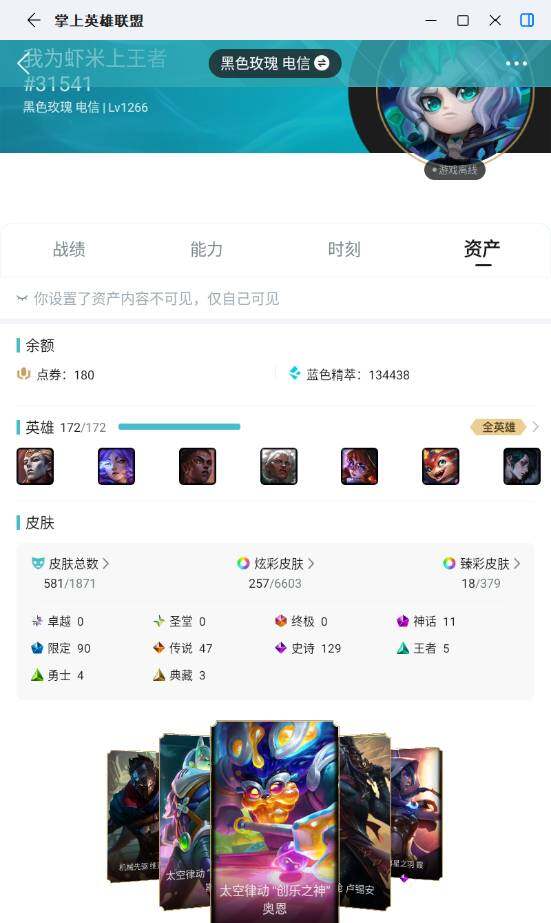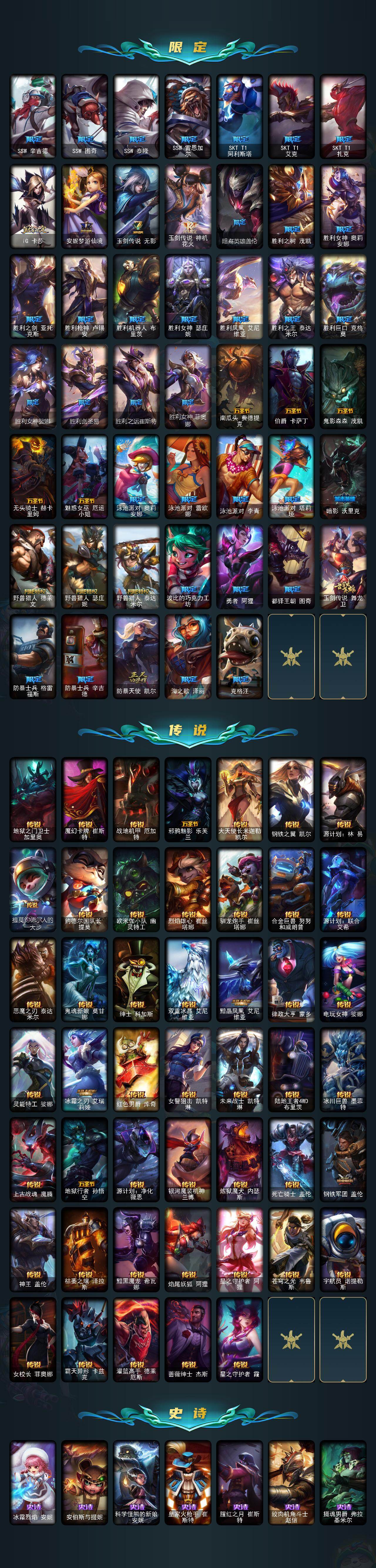 【特价出售/店主推荐】 黄金段位-172英雄-581皮肤-257炫彩-0终极-11神话-90限定-47传说-129史诗 【神话皮肤】:十周年纪念安妮,源代码乐芙兰,十五周年纪念希维尔,殿堂传奇薇恩,海克斯科技嘉文四世,海克斯科技魔腾,摄魂使者薇恩,新创战纪希维尔,至臻海之歌萨勒芬妮,至臻魅惑女巫厄运小姐,至臻女帝黛安娜 【珍稀头像】:星守阿狸头像 【热门头像】:爱情之歌头像 【至臻皮肤】:至臻魅惑女巫厄运小姐,至臻女帝黛安娜,至臻海之歌萨勒芬妮 【臻彩皮肤】:天龙之子卡莎飞龙乘云,无畏骑士瑟庄妮赤子初心,冠军之箭艾希凯旋圣装,赵云子龙炫金将军,墨之影武者亚索金墨耀影,霸天异形卡兹克掠空魅影,弹幕天使卡莎炽天使勇敢,源计划毁灭派克幻灭,弹幕天使卡莎炽天使公正,泳池派对奥莉安娜优雅珠光鲸,可爱可爱粉红红布里茨,魔女阿卡丽虚荣,魔女阿狸饕餮,净雪之月莫甘娜冬虹,墨之影武者永恩灵墨刻影,红莲之刃锐雯,心之钢伊泽瑞尔天纵才华 【年限皮肤】:碧玉之牙卡西奥佩娅,神龙之翼库奇,神龙烈焰金克丝,美猴王孙悟空,春晖神女拉克丝,金猪烈焰瑟庄妮,天龙之子斯莫德,点心宝贝阿木木 【海克斯皮肤】:新创战纪希维尔,海克斯科技魔腾,海克斯科技嘉文四世,摄魂使者薇恩 【情人节限定】:觅心魔灵奥莉安娜 【冰雪限定】:幸福女神乐芙兰,持胡萝卜的雪人易,冬境仙灵索拉卡,圣诞开心鬼提莫,圣诞精灵崔丝塔娜,圣诞狂欢努努和威朗普,圣诞糖果棒厄运小姐,阿木木“主人不要我了”,胡桃夹子萨科,平安夜女神娑娜,邪恶圣诞老人维迦,喜庆之树茂凯,雪默丁格,雪装奈德丽,圣诞玩偶波比,圣诞老人古拉加斯,魄罗骑士瑟庄妮,雪球也能爆炸吉格斯,冰雪节玛尔扎哈,北极星圣贤基兰 【限定皮肤】:送披萨的小姐姐希维尔,冠军典狱长锤石,冠军之血希瓦娜,冠军之矛卡莉丝塔,冠军之隐劫,fnatic古拉加斯,fnatic库奇,暗杀星蒙多,暗杀星努努和威朗普,暗杀星伊泽瑞尔,sktt1贾克斯,sktt1婕拉,sktt1李青,sktt1薇恩,ssw辛吉德,ssw图奇,ssw泰隆,ssw雷恩加尔,sktt1阿利斯塔,sktt1艾克,sktt1扎克,ig卡莎,安妮梦游仙境,玉剑传说无影,玉剑传说神机花火,暗裔英雄盖伦,胜利之树茂凯,胜利女神奥莉安娜,胜利之剑亚托克斯,胜利呛神卢锡安,胜利机器人布里茨,胜利女神瑟庄妮,胜利凤凰艾尼维亚,胜利之王泰达米尔,胜利巨口克格莫,胜利女神娑娜,胜利剑圣易,胜利之运崔斯特,胜利女神菲奥娜,南瓜头费德提克,伯爵卡萨丁,鬼影森森茂凯,无头骑士赫卡里姆,魅惑女巫厄运小姐,泳池派对奥莉安娜,泳池派对蕾欧娜,泳池派对李青,泳池派对塔莉垭,暗影沃里克,野兽猎人德莱文,野兽猎人瑟庄妮,野兽猎人泰达米尔,波比的巧克力工坊,勇者阿狸,都铎王朝图奇,玉剑传说舞龙卫,防暴士兵格雷福斯,防暴士兵辛吉德,防暴天使凯尔,海之歌泽丽,克格汪 【传说皮肤】:地狱之门卫士加里奥,魔幻卡牌崔斯特,战地机甲厄加特,邪鸦魅影乐芙兰,大天使长米迦勒凯尔,钢铁之翼凯尔,源计划林易,提莫约德尔人的一大步,约德尔国队长提莫,欧米伽小队幽灵特工,烈焰雄心崔丝塔娜,驯龙炮手崔丝塔娜,合金巨兽努努和威朗普,源计划联合艾希,恶魔之刃泰达米尔,鬼魂新娘莫甘娜,绅士科加斯,双重冰晶艾尼维亚,黯晶凤凰艾尼维亚,律政大亨蒙多,电玩女神娑娜,灵能特工娑娜,冰霜之刃艾瑞莉娅,红色男爵库奇,女警狙击凯特琳,未来战士凯特琳,陆地王者4wd布里茨,冰川巨兽墨菲特,上古战魂魔腾,地狱行者孙悟空,源计划净化薇恩,银河魔装机神兰博,炼狱魔犬内瑟斯,死亡骑士盖伦,钢铁军团盖伦,神王盖伦,枯萎之壤泽拉斯,黯黑魔龙希瓦娜,焰尾妖狐阿狸,星之守护者阿狸,苍穹之光韦鲁斯,宇航员诺提勒斯,女校长菲奥娜,霸天异形卡兹克,灌篮高手德莱厄斯,蔷薇绅士杰斯,星之守护者霞 【史诗皮肤】:冰霜烈焰安妮,安伯斯与提妮,科学怪熊的新娘安妮,皇家火呛手崔斯特,腥红之月崔斯特,绞肉机角斗士赵信,摄魂男爵弗拉基米尔,重生之沙费德提克,侍魂易,铁血剑豪易,地狱火阿利斯塔,战争机器赛恩,战场公主希维尔,钢铁之心希维尔,月光女神阿忒弥斯索拉卡,圣洁化身索拉卡,熊猫提莫,火牙狼人沃里克,荒野豺狼沃里克,法国皇室厄运小姐,黑帮狂花厄运小姐,紫晶射手艾希,国王泰达米尔,百夫长贾克斯,少林武僧贾克斯,黑色荆棘莫甘娜,炼金狂士辛吉德,死神卡尔萨斯,卡尔萨斯祸害之光,殇之机器人阿木木,熔火之心拉莫斯,全金属狂潮拉莫斯,飞越疯人院萨科,战争血统蒙多,五杀摇滚键盘手娑娜,掠星魔刃卡萨丁,海克斯科技迦娜,寒冰女皇迦娜,血石诅咒塔里克,北领前线斯维因,绝代智将斯维因,抵抗军天使凯特琳,铁血狙击手凯特琳,无畏号墨菲特,海贼魅影卡特琳娜,暗夜猫女卡特琳娜,前线指挥官卡特琳娜,沙漠风暴卡特琳娜,蓝焰梦魔魔腾,符文战神雷克顿,枯萎之壤雷克顿,龙骑统帅嘉文四世,凯旋英雄嘉文四世,死亡绽放伊莉丝,灵魂烈焰布兰德,地下拳王李青,深海妖姬卡西奥佩娅,战地机甲斯卡纳,法老王朝内瑟斯,艳后奈德丽,四神之力乌迪尔,军神战甲波比,血色之锤波比,飞车暴走族古拉加斯,钢铁意志潘森,大夏武士潘森,冰川勇者伊泽瑞尔,死亡领主莫德凯撒,实习护士阿卡丽,银色之牙阿卡丽,铁血女忍阿卡丽,刺客信条凯南,铁甲雄心盖伦,孤高游侠盖伦,至高君王玛尔扎哈,刺客信条锐雯,兔女郎锐雯,帝王斑蝶克格莫,深海怪鱼克格莫,腥红之月鬼武者慎,战国