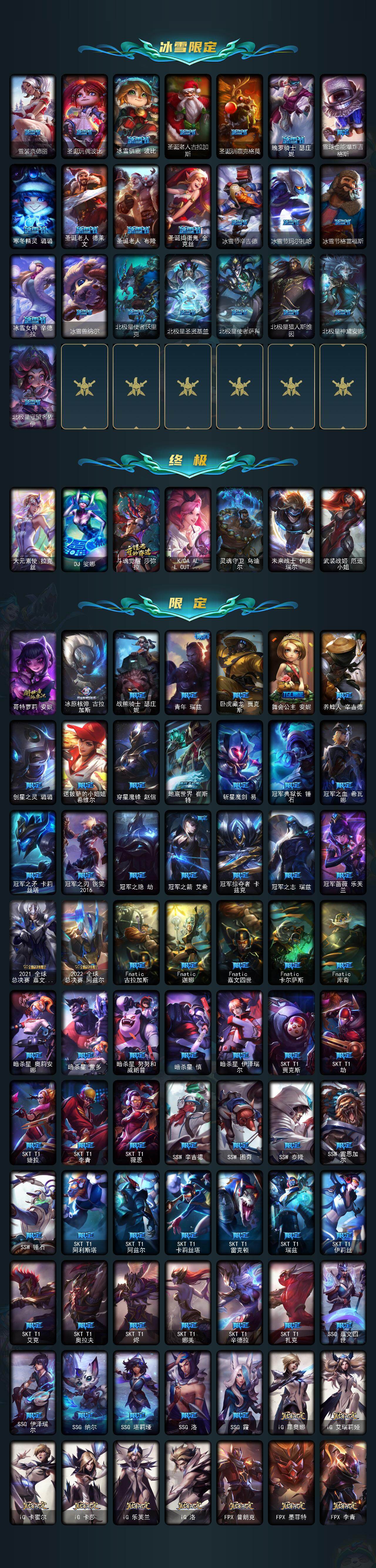 【lolx1418】172英雄/1458皮肤/9终极/98神话/299限定/36臻彩/1423炫彩/116传说/215史诗/未定级/十周年纪念安妮/十五周年纪念希维尔/水晶圣骑艾希/新卧虎藏龙贾克斯/神凰行者瑞羽圣凰艾尼维亚/灰烬征服者潘森/水晶巫灵泽拉斯/星之守护者塔莉垭/永恒之森奥恩/灰烬骑士派克/海克斯科技安妮/海克斯科技波比/海克斯科技崔丝塔娜/海克斯科技嘉文四世/海克斯科技吉格斯/海克斯科技卡萨丁/海克斯科技克格莫/海克斯科技雷克顿/海克斯科技玛尔扎哈/海克斯科技魔腾/海克斯科技瑟庄妮/海克斯科技斯维因/恐惧新星德莱厄斯/零之呛骑赫卡里姆/摄魂使者薇恩/新创战纪希维尔/至臻征服者贾克斯/至臻真实伤害奇亚娜/至臻真实伤害奇亚娜2022/至臻真实伤害赛娜/至臻真实伤害亚索/至臻神龙尊者比翼之龙洛/至臻天龙之子伊泽瑞尔/至臻西部魔影伊芙琳/至臻至高天凯尔/至臻暗星墨菲特/至臻奥术师佐伊/至臻北极星钢影卡蜜尔/至臻北极星使者沃里克/至臻电玩女神凯特琳/至臻电玩女神凯特琳2022/至臻斗魂觉醒派克/至臻drx亚托克斯/至臻飞升战神潘森/至臻福牛守护者菲奥娜/至臻海珀利安小队x09星环灵风迦娜/至臻海之歌萨勒芬妮/至臻黑夜使者凯隐/至臻黑夜使者李青/至臻幻灵战斗猫金克丝/至臻花仙使者卡特琳娜/至臻魂蔷薇烈娜塔/至臻剪纸仙灵希维尔/至臻绝息圣堂厄运小姐/至臻kda阿卡丽/至臻kda阿狸/至臻kdaallout卡莎/至臻kda卡莎/至臻kda伊芙琳/至臻kda伊芙琳2022/至臻烈焰美人薇恩/至臻烈焰美人薇恩2022/至臻灵魂莲华提莫/至臻灵魂莲华易/至臻灵能特工伊泽瑞尔/至臻魅惑女巫厄运小姐/至臻魅惑女巫莫甘娜/至臻魔女阿卡丽/至臻魔女婕拉/至臻魔女乐芙兰/至臻墨之影武者亚索/至臻女帝黛安娜/至臻青花瓷拉克丝/至臻青花瓷丽桑卓/至臻绒毛菲兹/至臻绒毛菲兹2022/至臻神凰行者烈羽焰凰霞/至臻神龙尊者均衡之龙沃利贝尔/至臻神龙尊者炎龙瑟提/至臻太空律动节奏幻师璐璐/至臻太空律动魔音海妖娜美/至臻王国机神玄武盖伦/至臻未来战士锤石/至臻未来战士锤石2022/至臻未来战士卢锡安/至臻西部魔影猎天使恶魔泰隆/至臻腥红之月亚托克斯/至臻腥红之月亚托克斯2022/至臻星之守护者艾克/至臻星之守护者辛德拉/至臻心之钢永恩/至臻焰执事布兰德/至臻源计划逆流塞拉斯/至臻源计划阴劫/至臻源计划正义艾瑞莉娅/至臻玉剑传说琴仙子/至臻战斗学院拉克丝/至臻战斗学院蕾欧娜/雪花头像/至爱的鹿头像/爱情之歌头像/觅心游侠卢锡安头像/银河魔装机神安妮头像/ssg霞头像/至臻kda伊芙琳2022/至臻玉剑传说琴仙子娑娜/至臻电玩女神凯特琳2022/至臻烈焰美人薇恩2022/至臻绒毛菲兹2022/至臻真实伤害奇亚娜2022/至臻腥红之月亚托克斯2022/至臻未来战士锤石2022/剪纸仙灵嘉文四世日进斗金/定海神珍孙悟空四海扬威/天龙之子卡莎飞龙乘云/无畏骑士瑟庄妮赤子初心/冠军之箭艾希凯旋圣装/玉剑传说无极白虎/冰雪节格雷福斯炫金/墨之影武者亚索金墨耀影/冠军掠夺者卡兹克凯旋圣装/冠军之血希瓦娜凯旋圣装/冠军之矛卡莉丝塔凯旋圣装/冠军之隐劫凯旋圣装/墨之影武者易金墨耀影/雾雨之刃锐雯/神龙尊者圣龙李青龙腾云起/弹幕天使卡莎炽天使勇敢/源计划联合艾希红莲之弓/星之守护者金克丝黑洞/咖啡甜心兰博核桃巴菲/西部天使赛娜贝利尔之怠/泳池派对奥莉安娜优雅珠光鲸/霸天巨兽雪崩墨菲特/玉剑传说苍鸾丁香/可爱可爱粉红红布里茨/魔女阿卡丽虚荣/净雪之月莫甘娜冬虹/幻灵战斗兔阿萝拉梦幻强袭/红莲之刃锐雯/北极星钢影卡蜜尔智慧纽带/心之钢伊泽瑞尔天纵才华/龙的传人李青/银龙裁决泰隆/你看见过我的熊猫吗安妮/碧玉之牙卡西奥佩娅/神龙之翼库奇/替父从军花木兰/广寒仙子嫦娥/神龙烈焰金克丝/美猴王孙悟空/紫金罗刹莫甘娜/玉净夜叉凯特琳/张辽文远/司马懿仲达/虎痴之拳蔚/南天之怒沃里克/北辰之威内瑟斯/春晖神女拉克丝/金猪烈焰瑟庄妮/烈焰美人薇恩/王国机神青龙德莱文/王国机神朱雀蕾欧娜/王国机神苍狼瑟提/王国机神白虎贾克斯/王国机神玄武盖伦/福牛守护者安妮/福牛守护者厄斐琉斯/福牛守护者德莱厄斯/福牛守护者阿利斯塔/福牛守护者嘉文四世/福牛守护者菲奥娜/猛虎下山赵信/招财进宝提莫/虎头虎脑崔丝塔娜/烈焰仙子黛安娜/龙腾虎跃瑟提/天龙之子斯莫德/甜心宝贝安妮/甜心宝贝娑娜/甜心之羽霞/甜心之翎洛/碎心之拳蔚/穿心之剑菲奥娜/觅心萝莉金克丝/觅心猎手薇恩/觅心之翼奎因/觅心游侠卢锡安/觅心猫猫悠米/觅心女王艾希/觅心魔灵奥莉安娜/幽梦玫瑰辛德拉/幽梦玫瑰泰隆/水晶玫瑰婕拉/水晶玫瑰斯维因/幽梦玫瑰伊莉丝/水晶玫瑰迦娜/水晶玫瑰阿克尚/幸福女神乐芙兰/持胡萝卜的雪人易/冰雪风暴希维尔/冬境仙灵索拉卡/圣诞开心鬼提莫/圣诞精灵崔丝塔娜/圣诞狂欢努努和威朗普/圣诞糖果棒厄运小姐/圣诞狂欢基兰/狂心冰王图奇/阿木木“主人不要我了”/胡桃夹子萨科/冰封王子蒙多/平安夜女神娑娜/英勇玩具兵普朗克/冬季仙境卡尔玛/邪恶圣诞老人维迦/夺命美人卡特琳娜/喜庆之树茂凯/冬季仙境奥莉安娜/雪默丁格/雪装奈德丽/圣诞玩偶波比/冰雪驯鹿波比/圣诞老人古拉加斯/圣诞驯鹿克格莫/魄罗骑士瑟庄妮/雪球也能爆炸吉格斯/寒冬精灵璐璐/圣诞老人德莱文/圣诞老人布隆/圣诞捣蛋鬼金克丝/冰雪节辛吉德/冰雪节玛尔扎哈/冰