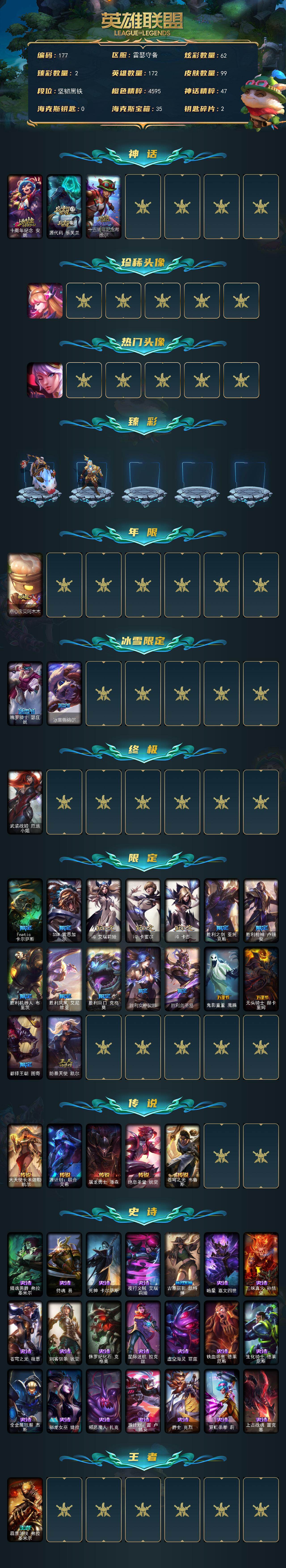 【177】未定级段位-172英雄-99皮肤-62炫彩-1终极-3神话-19限定-5传说-21史诗 【神话皮肤】:十周年纪念安妮,源代码乐芙兰,十五周年纪念希维尔 【珍稀头像】:星守阿狸头像 【热门头像】:觅心之翼奎因头像 【臻彩皮肤】:无畏骑士瑟庄妮赤子初心,冠军之志瑞兹凯旋圣装 【年限皮肤】:点心宝贝阿木木 【冰雪限定】:魄罗骑士瑟庄妮,冰雪兽纳尔 【终极皮肤】:武装战姬厄运小姐 【限定皮肤】:fnatic卡尔萨斯,ssw雷恩加尔,ig艾瑞莉娅,ig卡蜜尔,ig卡莎,胜利之剑亚托克斯,胜利呛神卢锡安,胜利机器人布里茨,胜利凤凰艾尼维亚,胜利巨口克格莫,胜利女神娑娜,胜利剑圣易,鬼影重重魔腾,无头骑士赫卡里姆,都铎王朝图奇,防暴天使凯尔 【传说皮肤】:大天使长米迦勒凯尔,源计划联合艾希,屠龙勇士潘森,绝息圣堂锐雯,苍穹之光韦鲁斯 【史诗皮肤】:摄魂男爵弗拉基米尔,侍魂易,死神卡尔萨斯,夜行义贼艾瑞莉娅,古墓丽影凯特琳,暗星嘉文四世,三昧真火孙悟空,苍穹之光薇恩,刺客信条锐雯,侏罗纪化石克格莫,星际迷航拉克丝,虚空海灵菲兹,铁血帝皇德莱厄斯,生化骑士德莱厄斯,全金属狂潮杰斯,驯龙女巫婕拉,邪恶魔人扎克,源计划雷卢锡安,爵士克烈,霓虹杀拳蔚,上古战魂雷克塞 【王者皮肤】:霹雳游侠弗拉基米尔 【其他皮肤1】:电锯狂人厄加特,星战易,腥红之月希维尔,游击队员崔丝塔娜,源计划末日沃里克,荒野巨兽努努和威朗普,冰球队员贾克斯,宗师级钓鱼训练师贾克斯,机械污染辛吉德,黑色天灾辛吉德,黑金诱惑图奇,横行霸道图奇,梦魇科加斯,尼斯巨兽科加斯,星之守护者娑娜,玉剑传说风仙子,沙之守护迦娜,海牛骑手库奇,樱花乱舞卡尔玛,紫水晶意志塔里克,图腾古树茂凯,星河战队雷克顿,猛龙雷克顿,银河魔装机神伊莉丝,黑色玫瑰假面舞会伊莉丝,战斗学院孙悟空,猎天使魔女薇恩,法国女仆奈德丽,黑桃皇牌伊泽瑞尔,足球宝贝阿卡丽,医学博士凯南,德玛西亚警官盖伦,荣誉使者慎,猎户星神韦鲁斯,星界圣骑诺提勒斯,源计划统帅瑟庄妮,泳池派对德莱文,地下都市梦魇德莱厄斯,战斗学院杰斯,弹幕天使卡莎,灵魂莲华亚索,魔女卡蜜尔,荣誉使者阿克尚,源计划升华烬,双城之战金克丝,夺命前锋卢锡安,德玛西亚警官卢锡安,比翼之心霞,黎明使者薇古丝