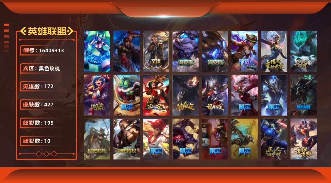 [16409313]【店主推荐捡漏号!可直接换绑】铂金段位-172英雄-427皮肤-195炫彩-2终极-8神话-57限定-27传说-124史诗 【至臻皮肤】:至臻灵能特工伊泽瑞尔 【臻彩皮肤】:天龙之子卡莎飞龙乘云,无畏骑士瑟庄妮赤子初心,墨之影武者亚索金墨耀影,征服者韦鲁斯炫金,冠军之矛卡莉丝塔凯旋圣装,泳池派对奥莉安娜优雅珠光鲸,霸天巨兽雪崩墨菲特,幻灵战斗兔锐雯梦幻强袭,魔女阿卡丽虚荣,净雪之月莫甘娜冬虹 【年限皮肤】:神龙烈焰金克丝,王国机神青龙德莱文,福牛守护者阿利斯塔 【海克斯皮肤】:海克斯科技阿木木,海克斯科技吉格斯 【冰雪限定】:冰雪风暴希维尔,圣诞精灵崔丝塔娜,圣诞狂欢努努和威朗普,圣诞狂欢基兰,阿木木“主人不要我了”,平安夜女神娑娜,喜庆之树茂凯,雪默丁格,圣诞玩偶波比,魄罗骑士瑟庄妮,冰雪节辛吉德 【终极皮肤】:dj娑娜,灵魂守卫乌迪尔 【神话皮肤】:十周年纪念安妮,源代码乐芙兰,十五周年纪念希维尔,神凰行者瑞羽圣凰艾尼维亚,黎明使者卡尔玛,海克斯科技阿木木,海克斯科技吉格斯,至臻灵能特工伊泽瑞尔 【限定皮肤】:送披萨的小姐姐希维尔,fnatic古拉加斯,fnatic迦娜,fnatic卡尔萨斯,暗杀星奥莉安娜,暗杀星蒙多,sktt1贾克斯,ssw图奇,暗裔英雄盖伦,胜利之树茂凯,胜利呛神格雷福斯,胜利女神奥莉安娜,胜利之剑亚托克斯,胜利呛神卢锡安,胜利机器人布里茨,胜利凤凰艾尼维亚,胜利之王泰达米尔,胜利巨口克格莫,胜利女神娑娜,胜利剑圣易,胜利之运崔斯特,胜利女神菲奥娜,海贼瑞兹,南瓜头费德提克,鬼影重重魔腾,鬼影森森茂凯,无头骑士赫卡里姆,魅惑女巫悠米,泳池派对黑默丁格,泳池派对塔里克,外星装甲库奇,暗影沃里克,野兽猎人德莱文,野兽猎人瑟庄妮,勇者阿狸,都铎王朝图奇,玉剑传说舞龙卫,御星魔矢艾希,钢铁之翼艾尼维亚,征服者卡尔玛,防暴士兵辛吉德,防暴天使凯尔,海之歌泽丽 【传说皮肤】:地狱之门卫士加里奥,血石领主弗拉基米尔,大天使长米迦勒凯尔,战场女武神凯尔,恶魔男爵瑞兹,约德尔国队长提莫,驯龙炮手崔丝塔娜,女皇艾希,西部天使艾希,双重冰晶艾尼维亚,电玩女神娑娜,女主播迦娜,女警狙击凯特琳,未来战士凯特琳,陆地王者4wd布里茨,源计划泯灭雷克顿,第三类接触黑默丁格,屠龙勇士潘森,腥红之月鬼武姬阿卡丽,枯萎之壤泽拉斯,冰霜亚龙希瓦娜,焰尾妖狐阿狸,偶像歌手阿狸,