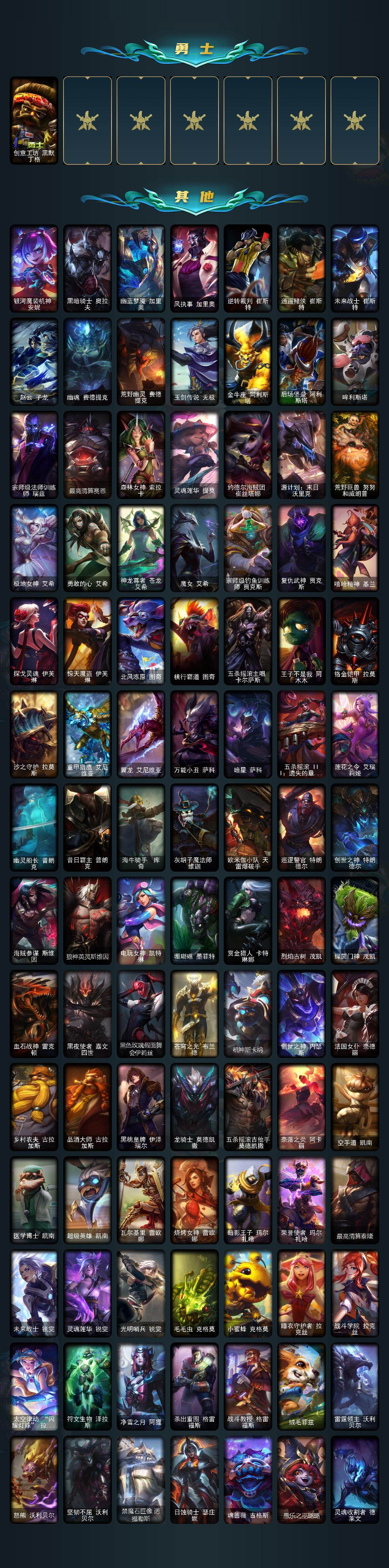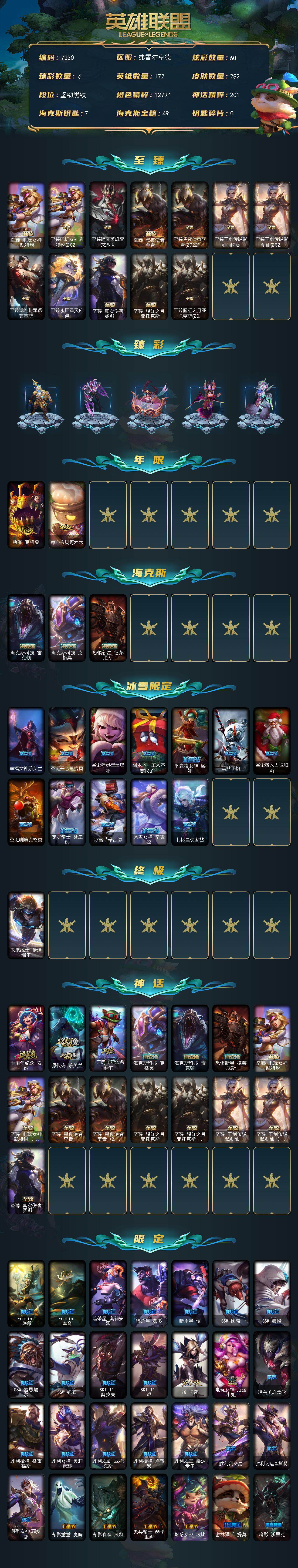 172英雄-282皮肤-172英雄/282皮肤/1终极/18神话/45限定/6臻彩/60炫彩/28传说/62史诗/未定级/十周年纪念 安妮/源代码 乐芙兰/十五周年纪念 希维尔/海克斯科技 克格莫/海克斯科技 雷克顿/恐惧新星 德莱厄斯/至臻 真实伤害 赛娜/至臻 电玩女神 凯特琳/至臻 电玩女神 凯特琳 2022/至臻 黑夜使者 李青/至臻 黑夜使者 李青 2022/至臻 腥红之月 亚托克斯/至臻 腥红之月