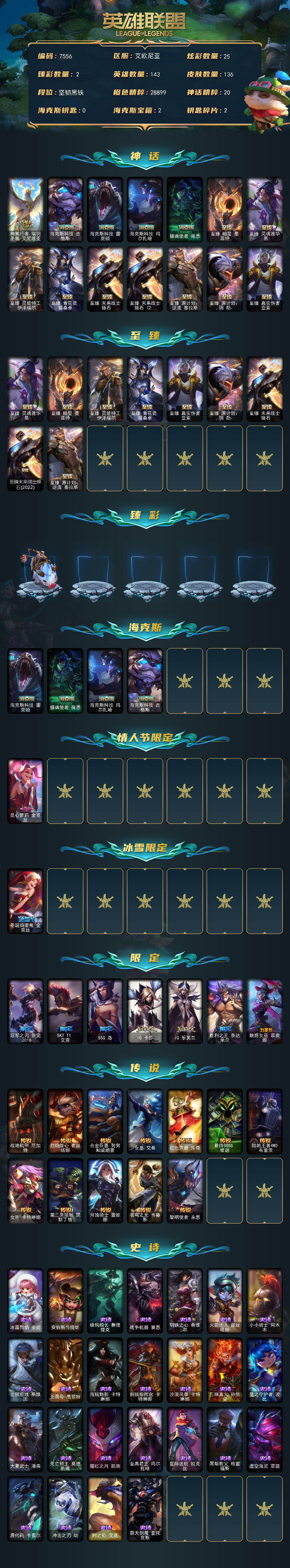 143英雄-136皮肤-143英雄/136皮肤/14神话/10限定/2臻彩/25炫彩/12传说/25史诗/黑铁/神凰行者 瑞羽圣凰 艾尼维亚/海克斯科技 吉格斯/海克斯科技 雷克顿/海克斯科技 玛尔扎哈/摄魂使者 薇恩/至臻 真实伤害 亚索/至臻 暗星 墨菲特/至臻 灵魂莲华 易/至臻 灵能特工 伊泽瑞尔/至臻 青花瓷 丽桑卓/至臻 未来战士 锤石/至臻 未来战士 锤石 2022/至臻 源计划:逆流 塞拉斯/至臻
