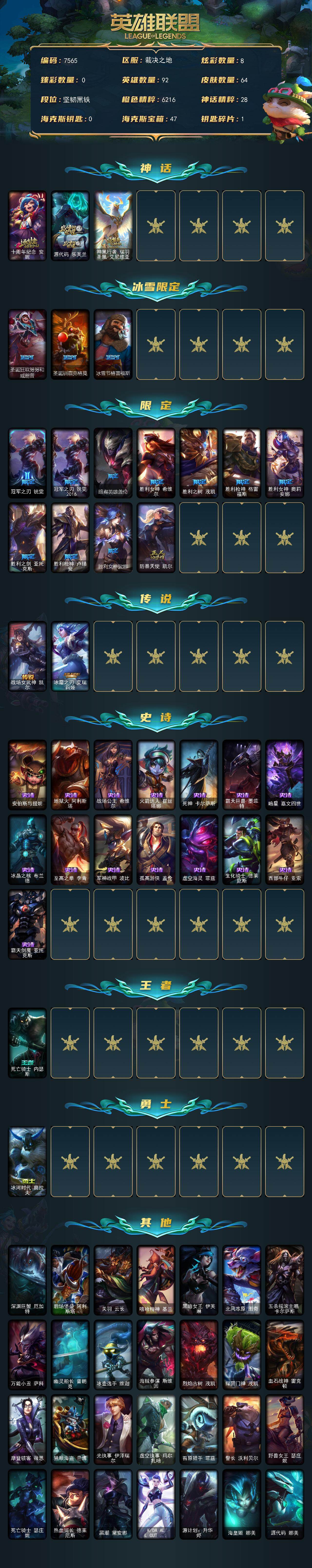 92英雄-64皮肤-92英雄/64皮肤/3神话/14限定/8炫彩/2传说/15史诗/未定级/十周年纪念 安妮/源代码 乐芙兰/神凰行者 瑞羽圣凰 艾尼维亚/圣诞狂欢努努和威朗普/圣诞驯鹿克格莫/冰雪节格雷福斯/冠军之刃 锐雯/冠军之刃 锐雯 2016/暗裔英雄盖伦/胜利女神 希维尔/胜利之树 茂凯/胜利呛神 格雷福斯/胜利女神 奥莉安娜/胜利之剑 亚托克斯/胜利呛神 卢锡安/胜利女神娑娜/防暴天使 凯尔/战场女武