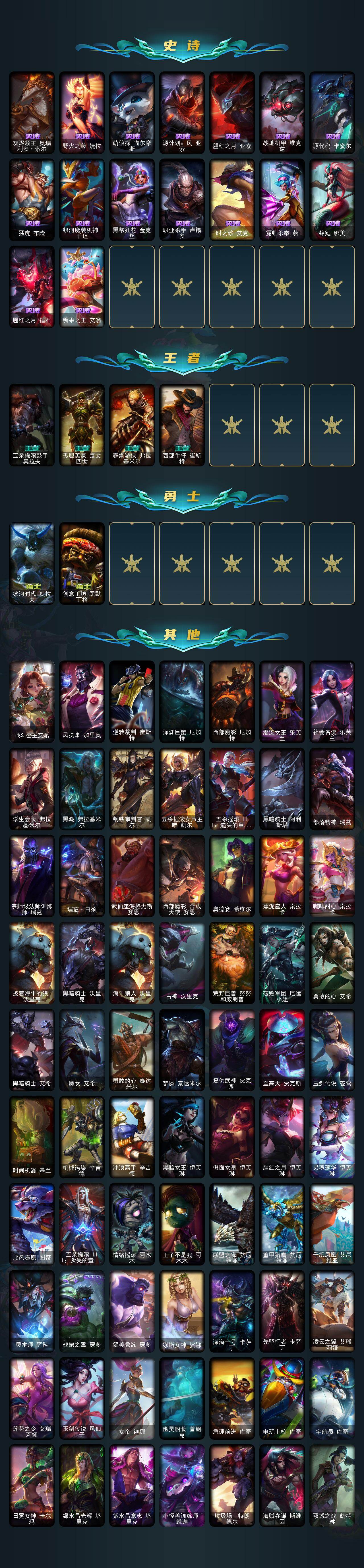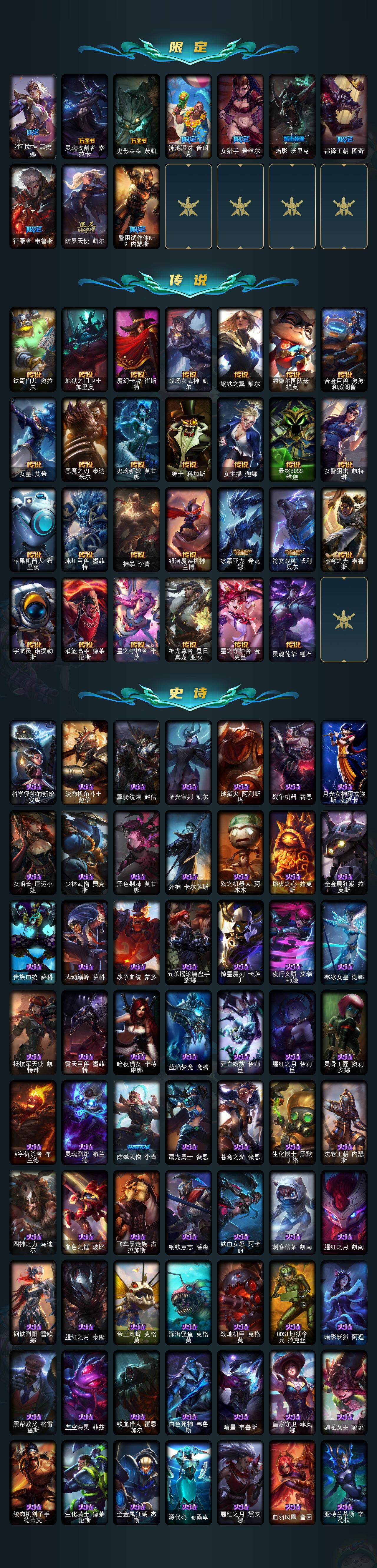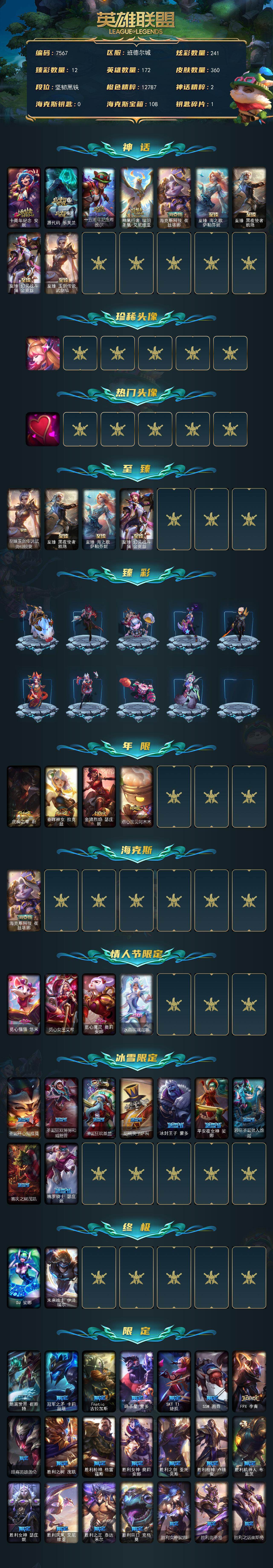172英雄-360皮肤-172英雄/360皮肤/2终极/9神话/49限定/12臻彩/241炫彩/27传说/79史诗/未定级/十周年纪念 安妮/源代码 乐芙兰/十五周年纪念 希维尔/神凰行者 瑞羽圣凰 艾尼维亚/海克斯科技 崔丝塔娜/至臻 海之歌 萨勒芬妮/至臻 黑夜使者 凯隐/至臻 幻灵战斗猫 金克丝/至臻 玉剑传说 武剑仙/星守阿狸头像/爱意绵绵头像/至臻玉剑传说武剑仙锐雯/天龙之子卡莎飞龙乘云/无畏骑士 瑟庄妮
