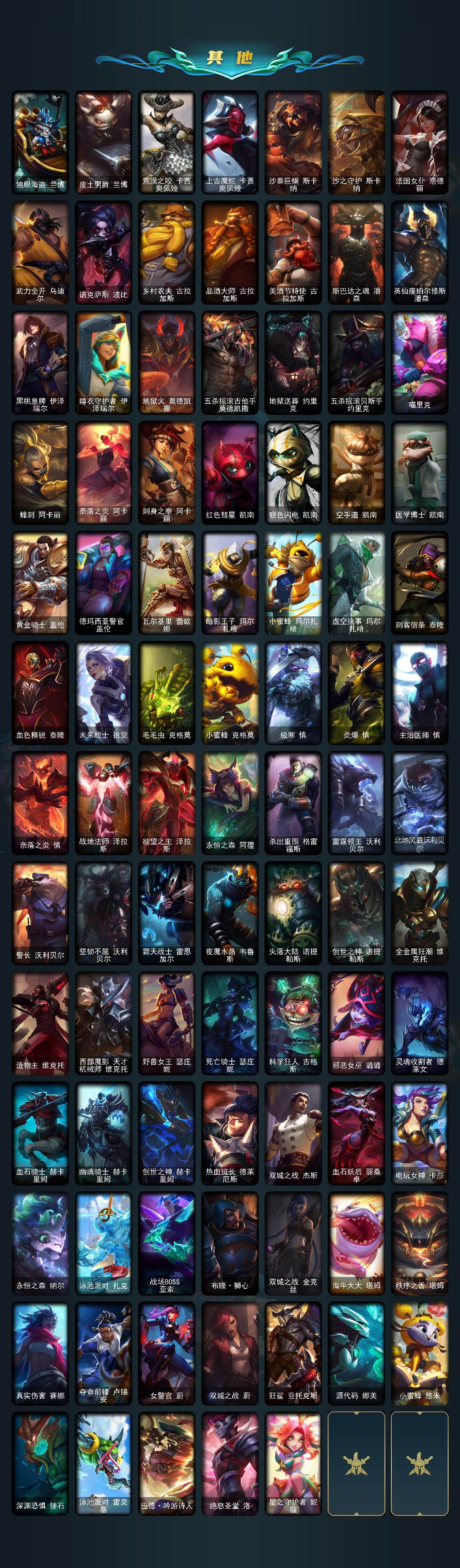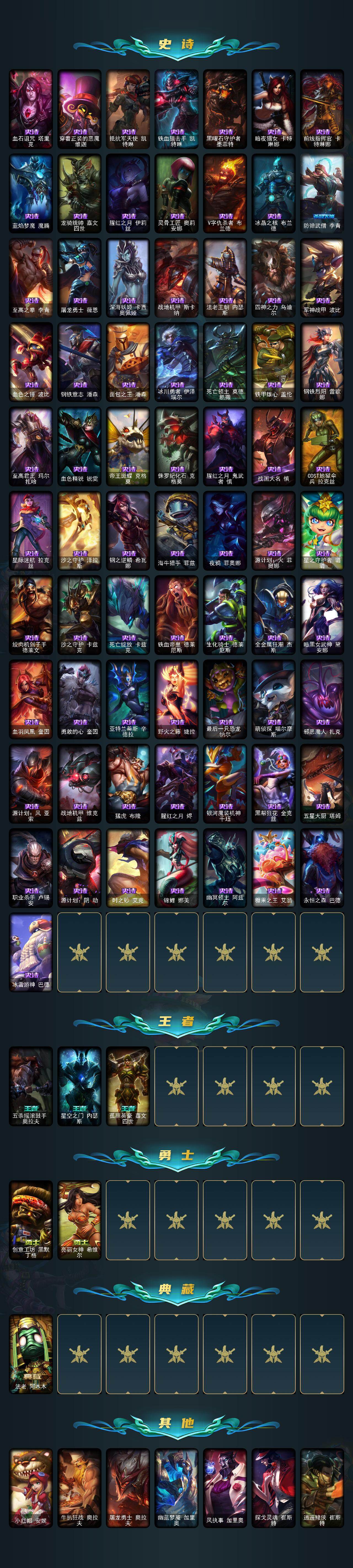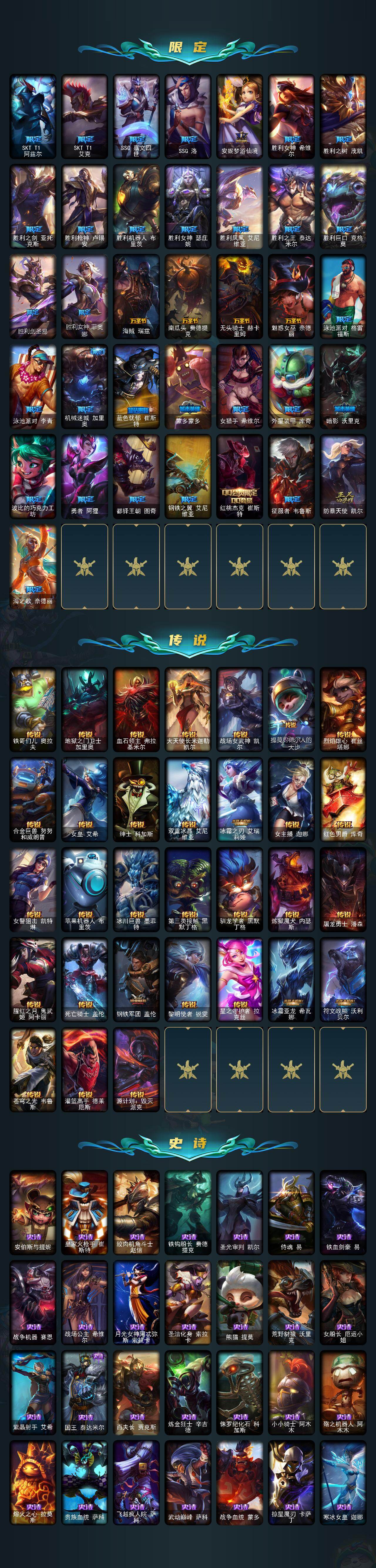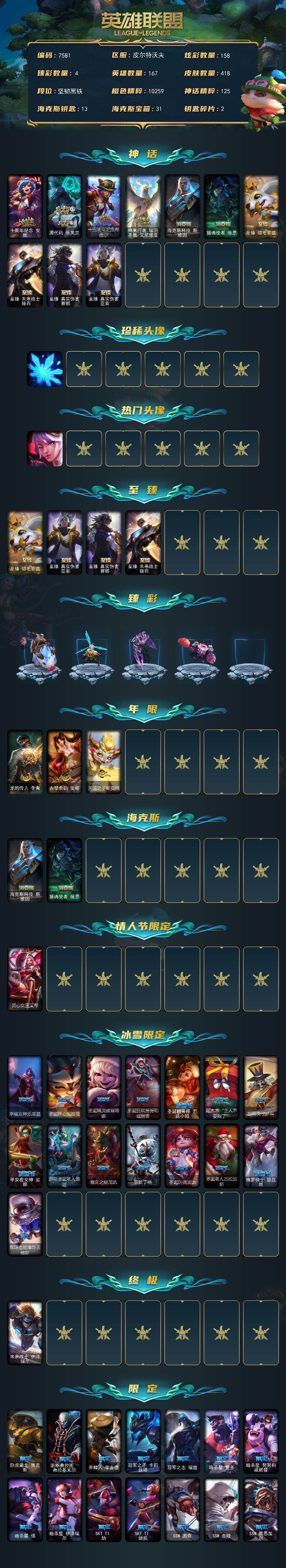 167英雄-418皮肤-167英雄/418皮肤/1终极/10神话/69限定/4臻彩/158炫彩/31传说/99史诗/未定级/十周年纪念 安妮/源代码 乐芙兰/十五周年纪念 希维尔/神凰行者 瑞羽圣凰 艾尼维亚/海克斯科技 斯维因/摄魂使者 薇恩/至臻 真实伤害 赛娜/至臻 真实伤害 亚索/至臻 绒毛菲兹/至臻 未来战士 锤石/雪花头像/觅心之翼奎因头像/无畏骑士 瑟庄妮 赤子初心/冰霜之刃 艾瑞莉娅 炫金/天煞 劫