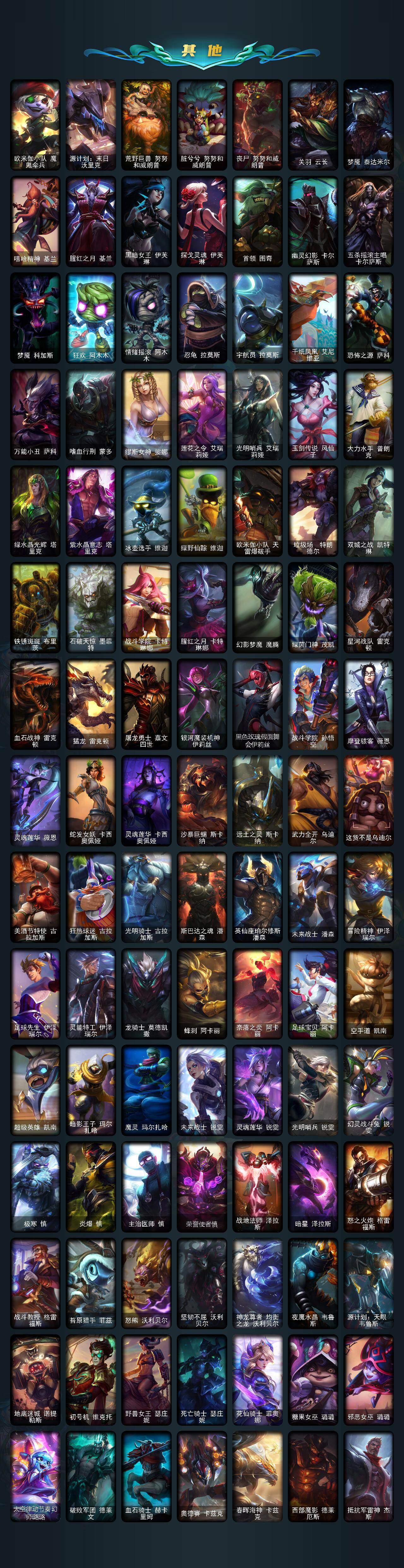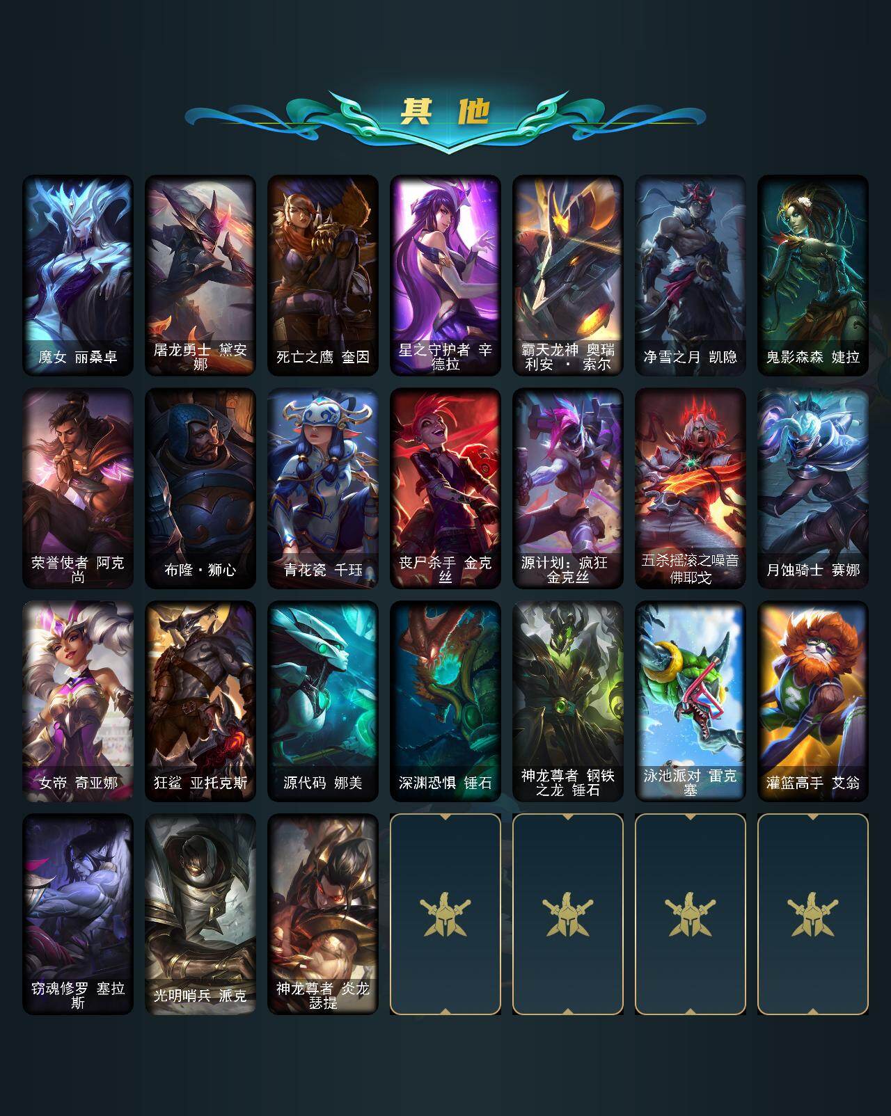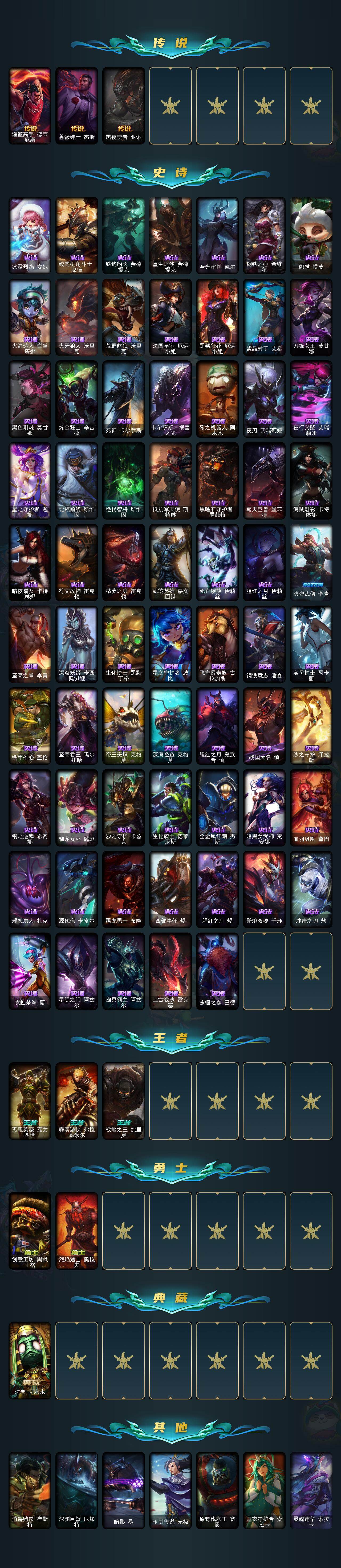 172英雄-277皮肤-172英雄/277皮肤/1终极/7神话/28限定/12臻彩/169炫彩/31传说/68史诗/未定级/十周年纪念 安妮/源代码 乐芙兰/十五周年纪念 希维尔/神凰行者 瑞羽圣凰 艾尼维亚/海克斯科技 魔腾/恐惧新星 德莱厄斯/零之呛骑 赫卡里姆/爱情之歌头像/觅心之翼奎因头像/觅心游侠卢锡安头像/无畏骑士 瑟庄妮 赤子初心/闭月之颜 貂蝉 炫金莲华/冠军之矛 卡莉丝塔 凯旋圣装/霸天异形 卡兹克