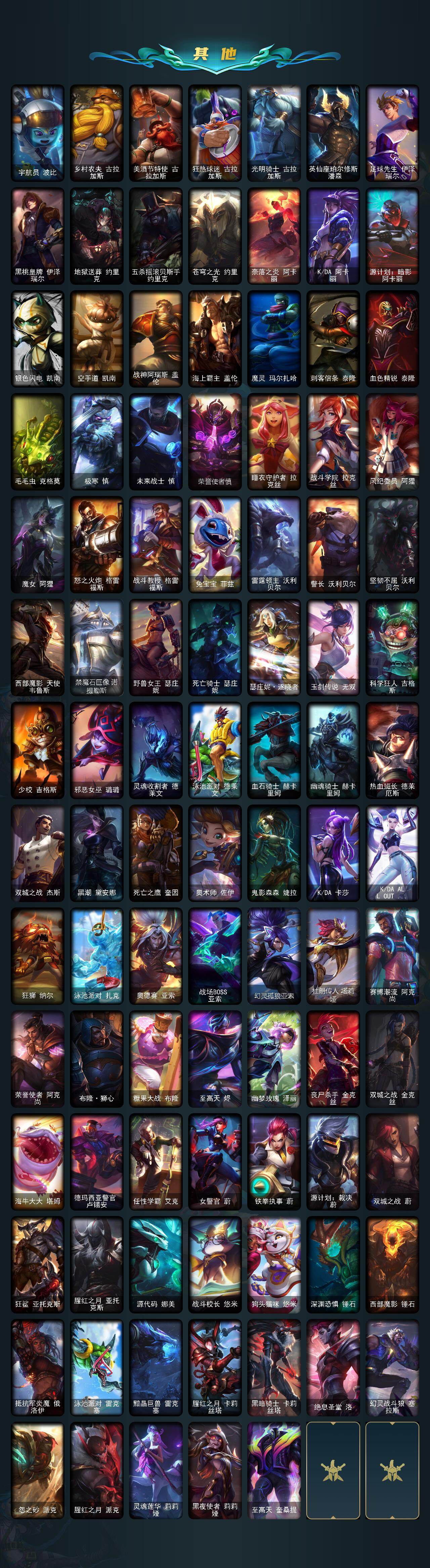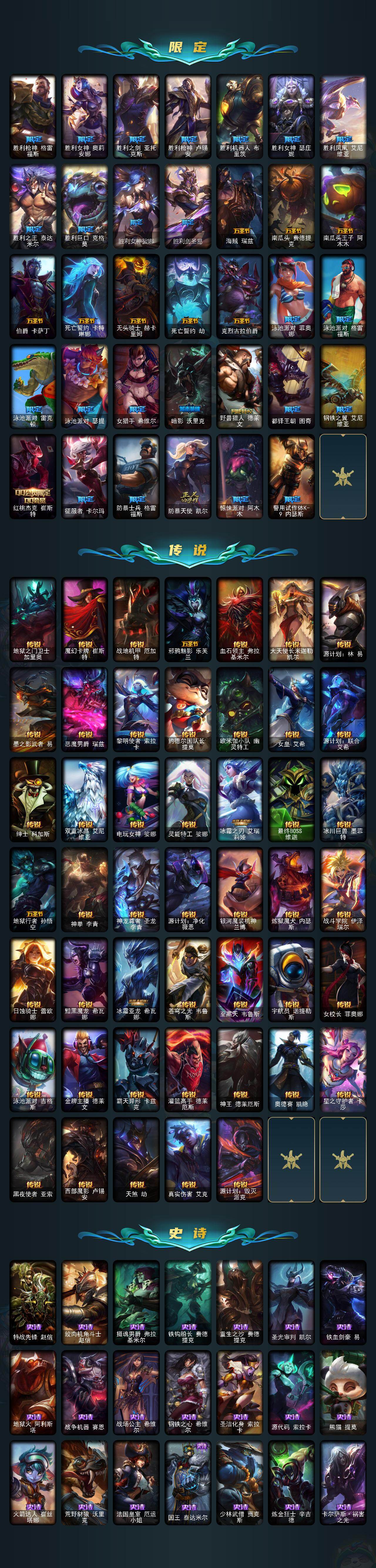 172英雄-447皮肤-172英雄/447皮肤/16神话/70限定/14臻彩/169炫彩/47传说/111史诗/铂金/十周年纪念 安妮/源代码 乐芙兰/十五周年纪念 希维尔/神凰行者 瑞羽圣凰 艾尼维亚/灰烬骑士 莫德凯撒/灰烬杀手 塞拉斯/零之呛骑 赫卡里姆/至臻 北极星使者 沃里克/至臻 黑夜使者 李青/至臻 黑夜使者 李青 2022/至臻 k/da 阿卡丽/至臻 神龙尊者 均衡之龙 沃利贝尔/至臻 源计划: