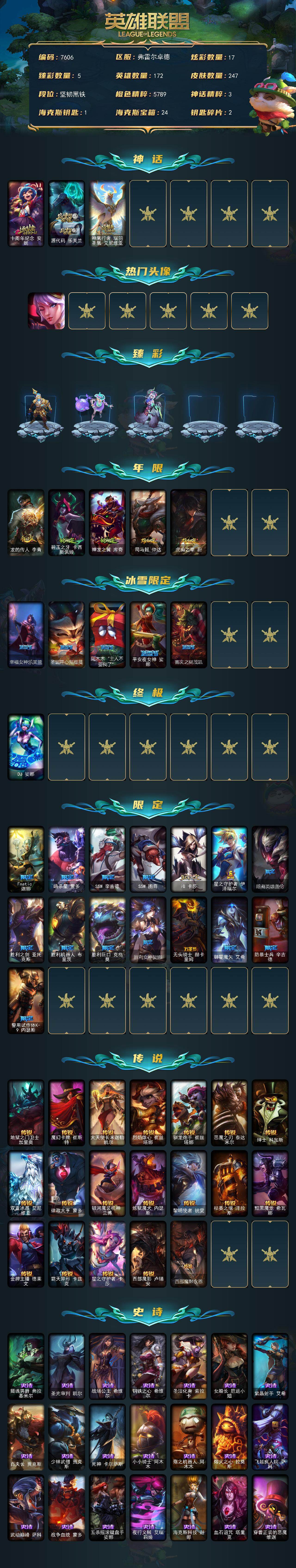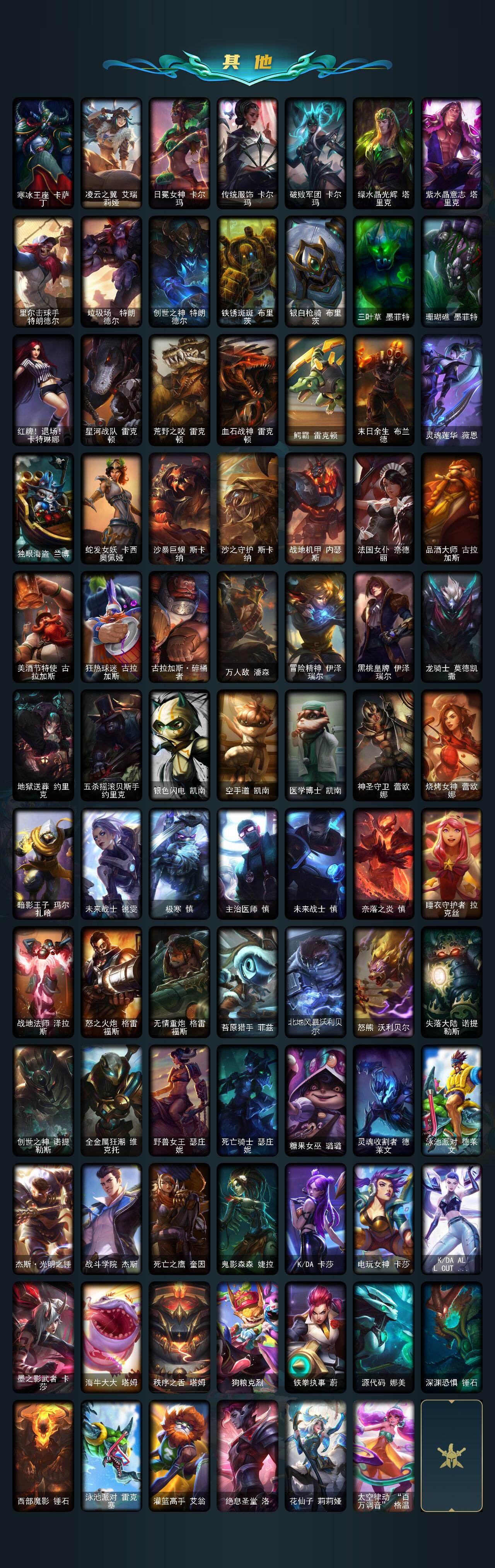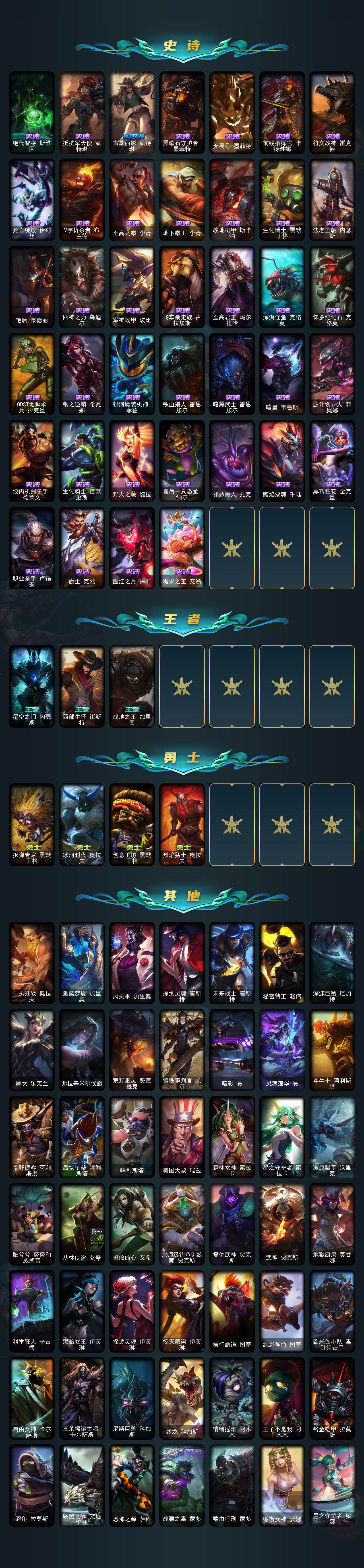 172英雄-247皮肤-172英雄/247皮肤/1终极/3神话/25限定/5臻彩/17炫彩/19传说/60史诗/未定级/十周年纪念 安妮/源代码 乐芙兰/神凰行者 瑞羽圣凰 艾尼维亚/觅心之翼奎因头像/冠军之志 瑞兹 凯旋圣装/泳池派对 奥莉安娜 优雅珠光鲸/海之歌艾希冰爽浪花/魔女 阿卡丽 虚荣/净雪之月 莫甘娜 冬虹/龙的传人 李青/碧玉之牙 卡西奥佩娅/神龙之翼 库奇/司马懿 仲达/虎痴之拳 蔚/幸福女神乐芙兰