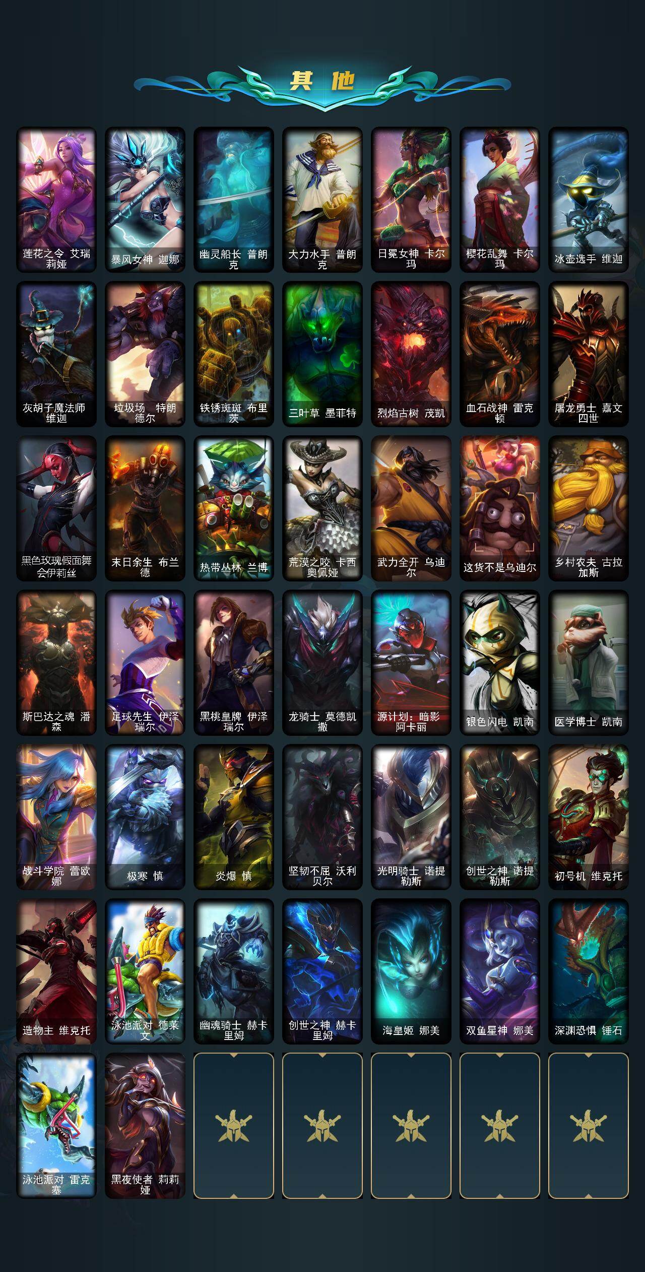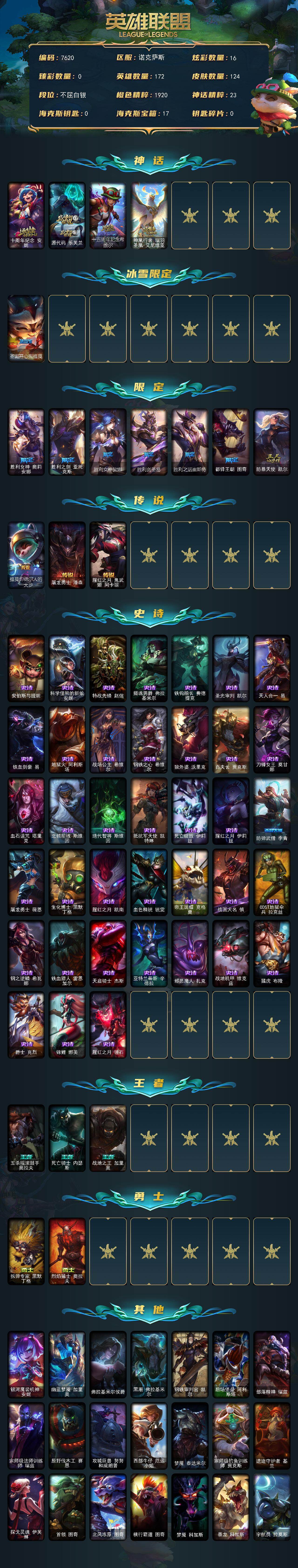 172英雄-124皮肤-172英雄/124皮肤/4神话/9限定/16炫彩/3传说/38史诗/白银/十周年纪念 安妮/源代码 乐芙兰/十五周年纪念 希维尔/神凰行者 瑞羽圣凰 艾尼维亚/圣诞开心鬼提莫/胜利女神 奥莉安娜/胜利之剑 亚托克斯/胜利女神娑娜/胜利剑圣易/胜利之运崔斯特/都铎王朝 图奇/防暴天使 凯尔/提莫:"约德尔人的一大步"/屠龙勇士 潘森/腥红之月 鬼武姬 阿卡丽/安伯斯与提妮/科学怪熊的新娘 安妮/