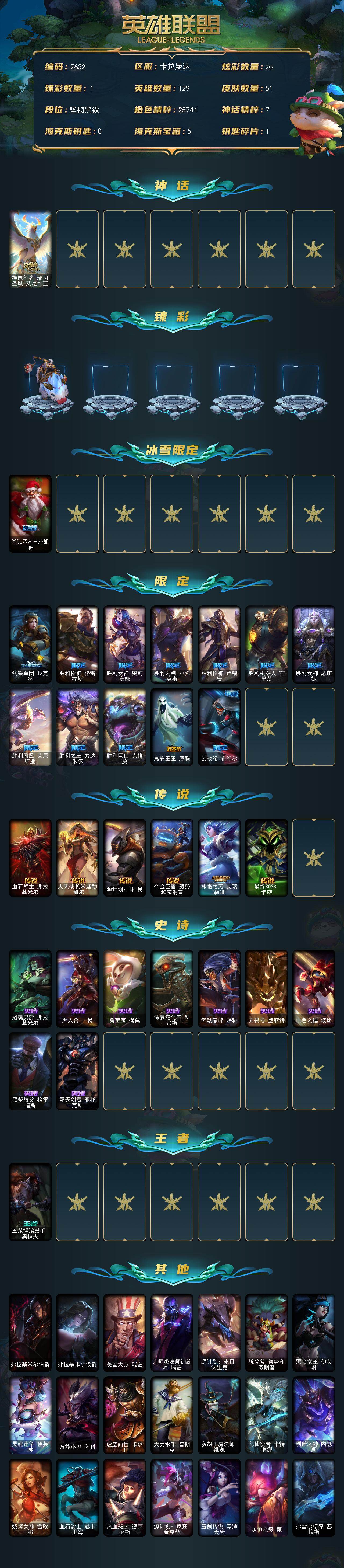 129英雄-51皮肤-129英雄/51皮肤/1神话/13限定/1臻彩/20炫彩/6传说/9史诗/未定级/神凰行者 瑞羽圣凰 艾尼维亚/无畏骑士 瑟庄妮 赤子初心/圣诞老人古拉加斯/钢铁军团 拉克丝/胜利呛神 格雷福斯/胜利女神 奥莉安娜/胜利之剑 亚托克斯/胜利呛神 卢锡安/胜利机器人 布里茨/胜利女神 瑟庄妮/胜利凤凰 艾尼维亚/胜利之王 泰达米尔/胜利巨口 克格莫/鬼影重重 魔腾/创战纪 希维尔/血石领主 弗拉