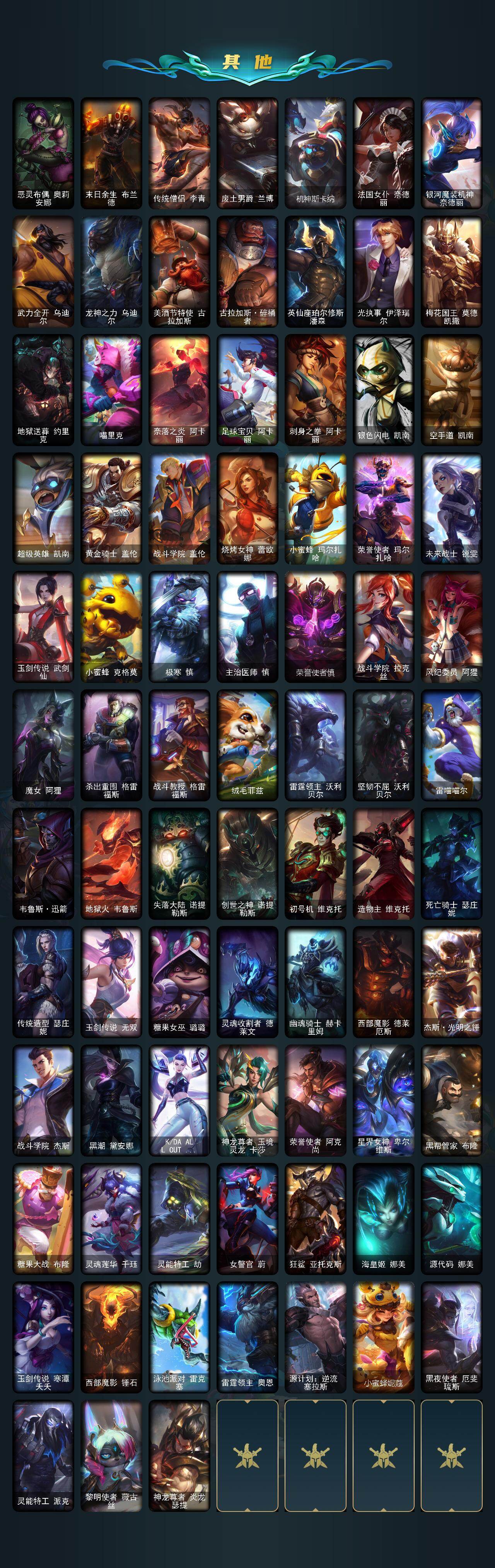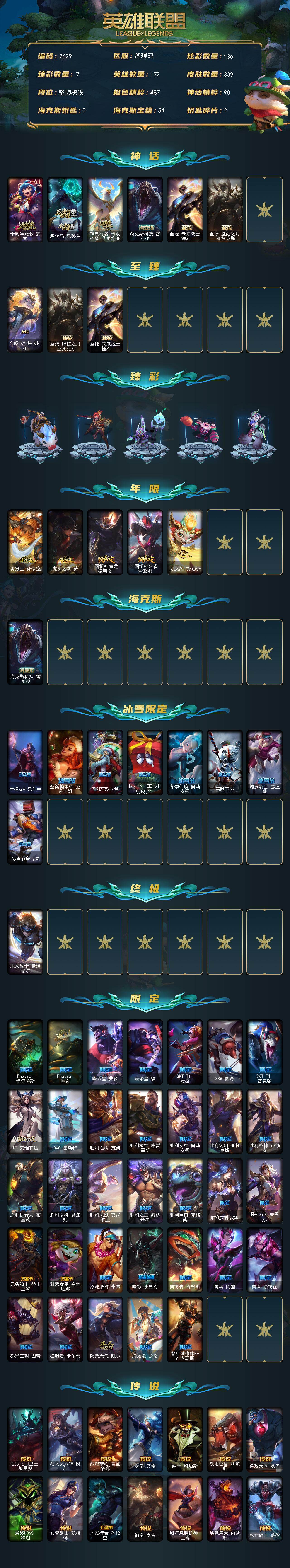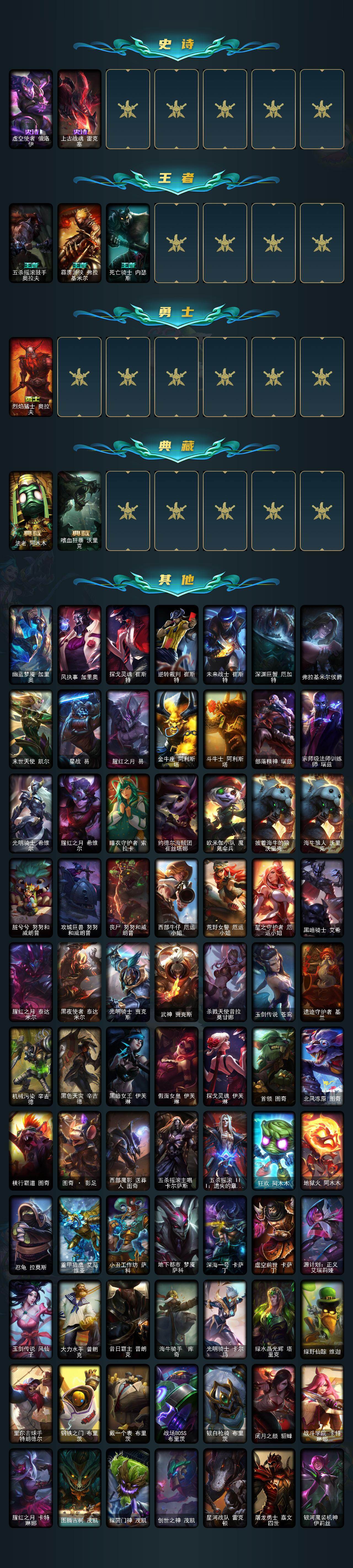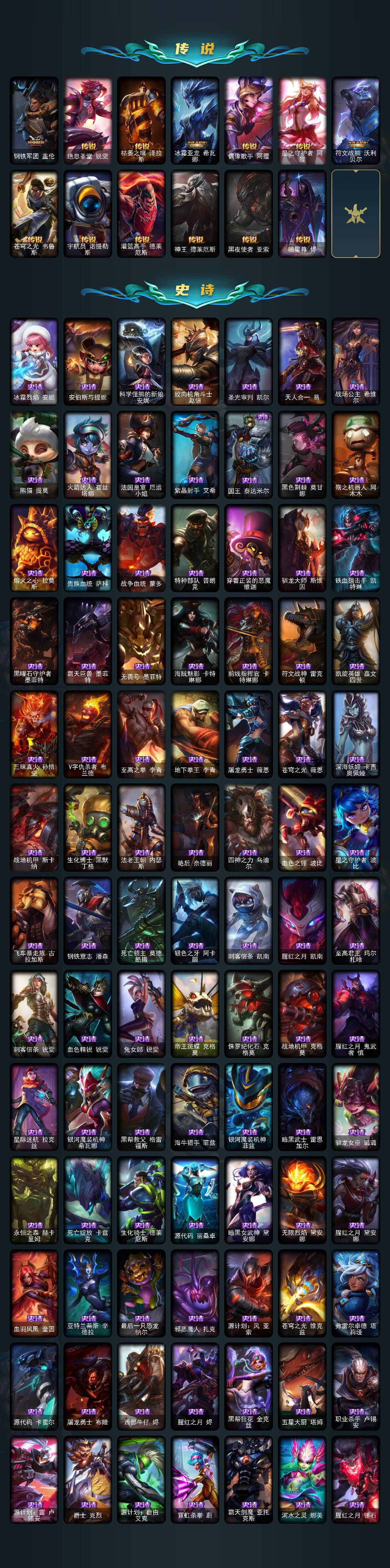 172英雄-339皮肤-172英雄/339皮肤/1终极/7神话/47限定/7臻彩/136炫彩/27传说/93史诗/未定级/十周年纪念 安妮/源代码 乐芙兰/神凰行者 瑞羽圣凰 艾尼维亚/海克斯科技 雷克顿/至臻 未来战士 锤石/至臻 腥红之月 亚托克斯/至臻永恒星灵佐伊/天龙之子卡莎飞龙乘云/无畏骑士 瑟庄妮 赤子初心/黎明使者 锐雯 黑夜使者/最终boss 维迦 里·大魔王/可爱可爱粉红红 布里茨/魔女 阿卡丽 虚