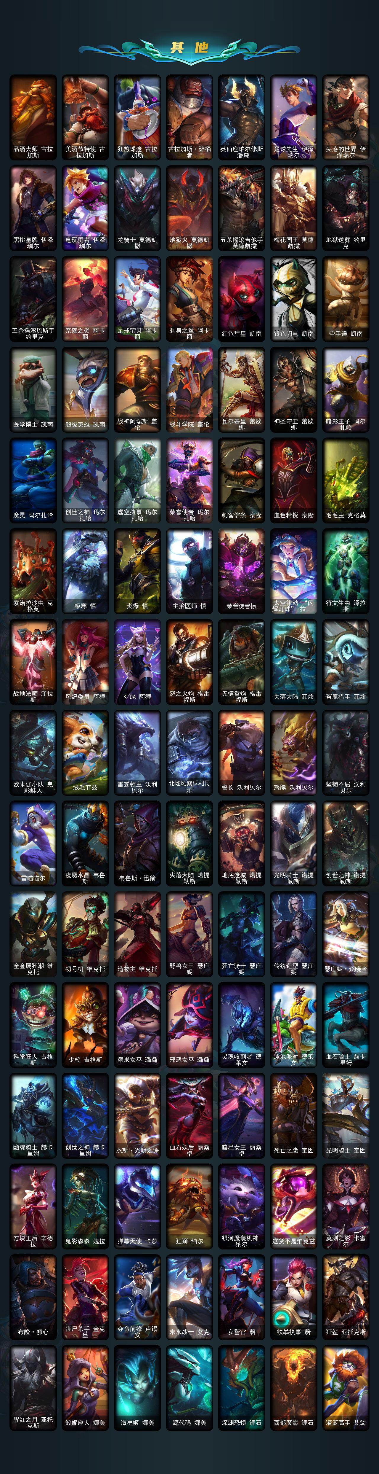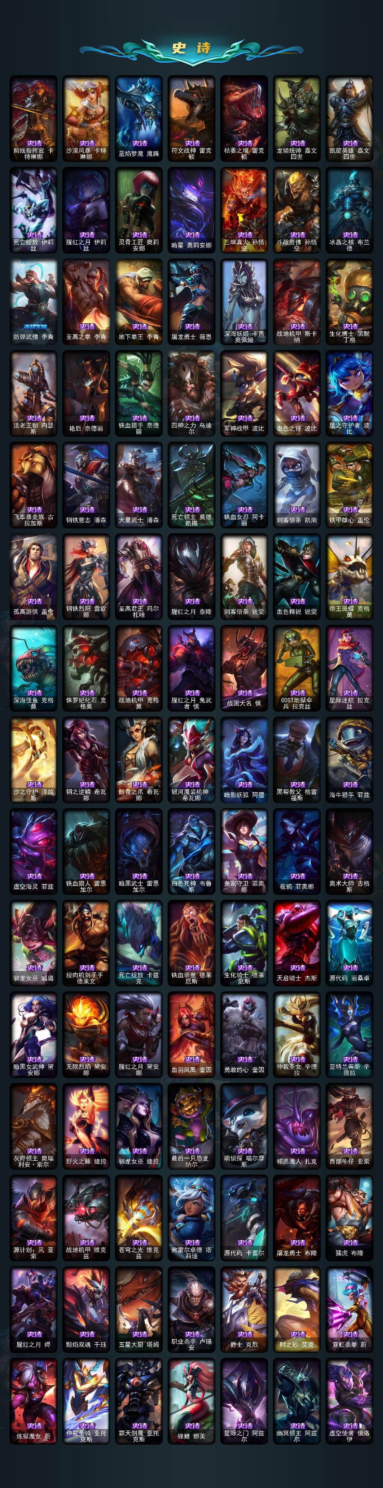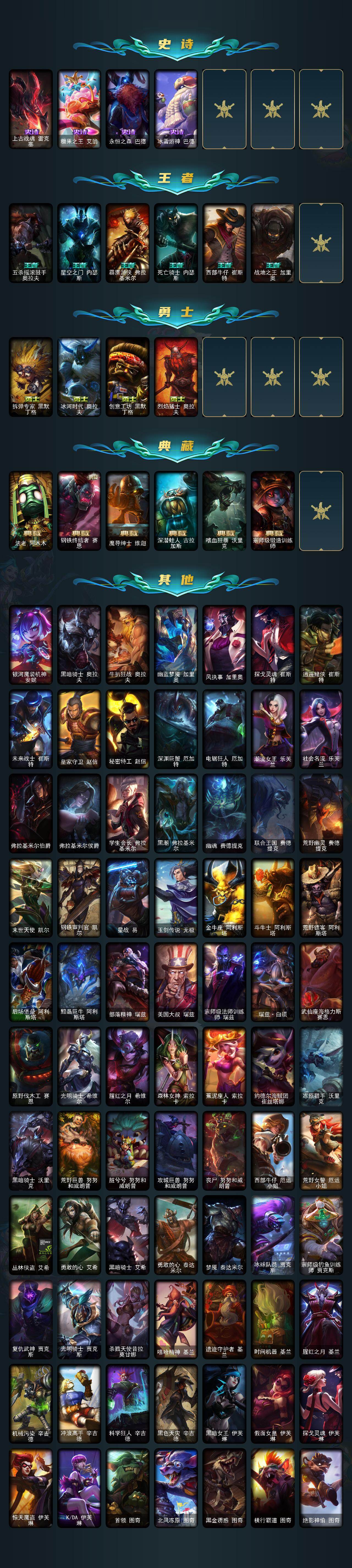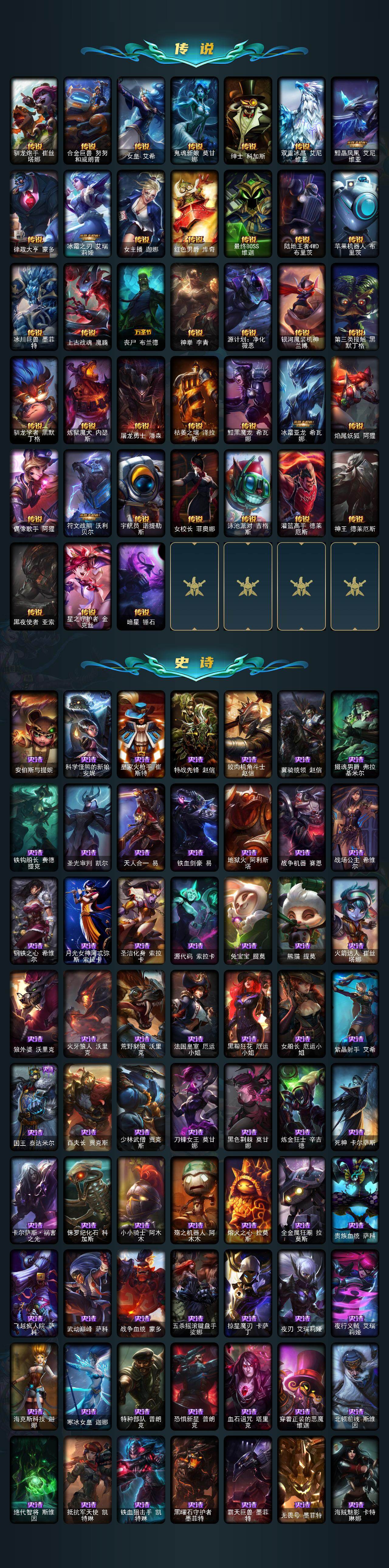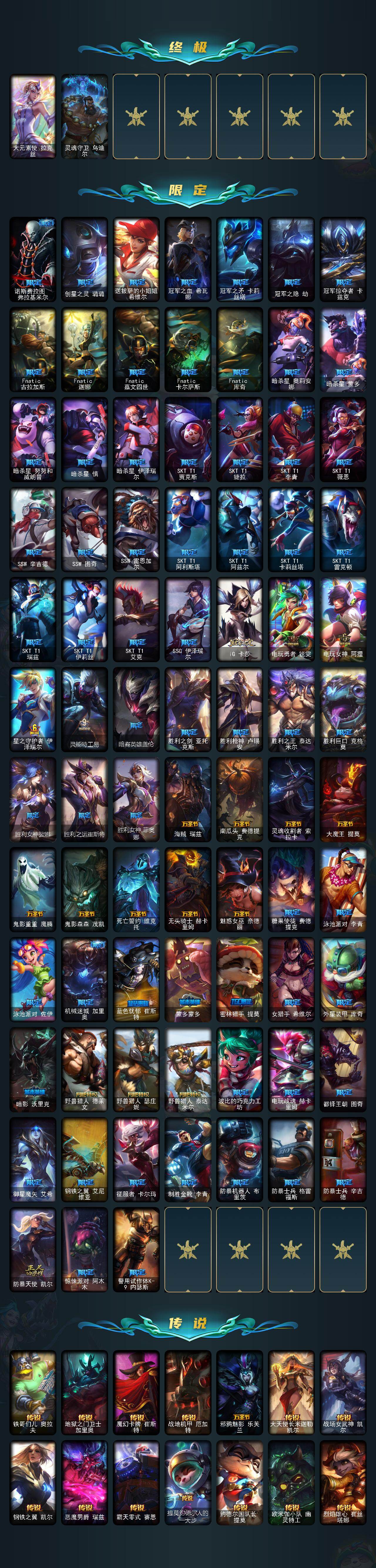 172英雄-677皮肤-172英雄/677皮肤/2终极/21神话/120限定/11臻彩/110炫彩/52传说/172史诗/黄金/十周年纪念 安妮/源代码 乐芙兰/十五周年纪念 希维尔/神凰行者 瑞羽圣凰 艾尼维亚/水晶掠夺者 卡兹克/海克斯科技 波比/海克斯科技 嘉文四世/海克斯科技 卡萨丁/海克斯科技 雷克顿/海克斯科技 斯维因/至臻 真实伤害 赛娜/至臻 真实伤害 亚索/至臻 福牛守护者 菲奥娜/至臻 黑夜使者