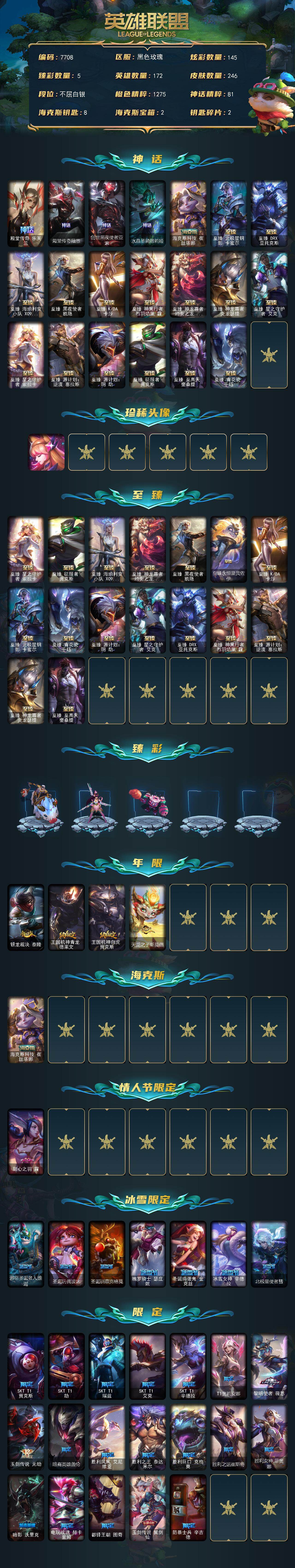 172英雄-246皮肤-172英雄/246皮肤/21神话/34限定/5臻彩/145炫彩/29传说/40史诗/白银/殿堂传奇 乐芙兰/殿堂传奇薇恩/创世黑夜使者亚索/水晶圣骑 塔莉垭/海克斯科技 崔丝塔娜/至臻 征服者 贾克斯/至臻 至高天 奎桑提/至臻 青花瓷 千珏/至臻 北极星钢影 卡蜜尔/至臻 drx 亚托克斯/至臻 海珀利安小队 x09-星环灵风 迦娜/至臻 黑夜使者 凯隐/至臻 k/da 卡莎/至臻 神凰行者