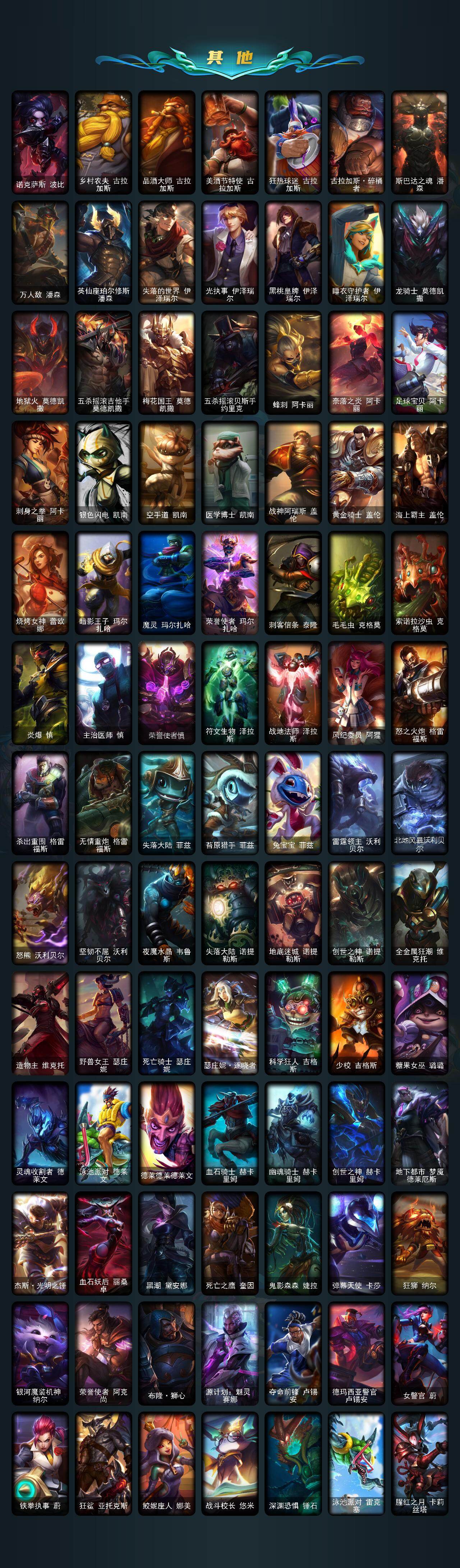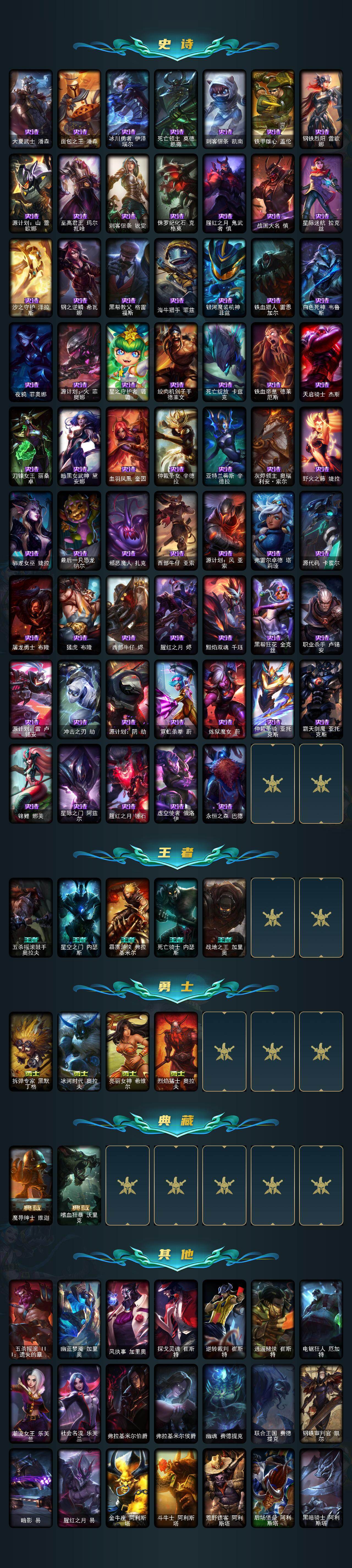 172英雄-458皮肤-172英雄/458皮肤/2终极/5神话/50限定/2臻彩/82炫彩/42传说/131史诗/未定级/十周年纪念 安妮/源代码 乐芙兰/十五周年纪念 希维尔/水晶巫灵 泽拉斯/至臻 腥红之月 亚托克斯/星界起源头像/星守阿狸头像/冠军之隐 劫 凯旋圣装/霸天巨兽·雪崩 墨菲特/王国机神青龙 德莱文/甜心之羽 霞/觅心游侠 卢锡安/幸福女神乐芙兰/圣诞开心鬼提莫/圣诞精灵崔丝塔娜/圣诞狂欢努努和威朗