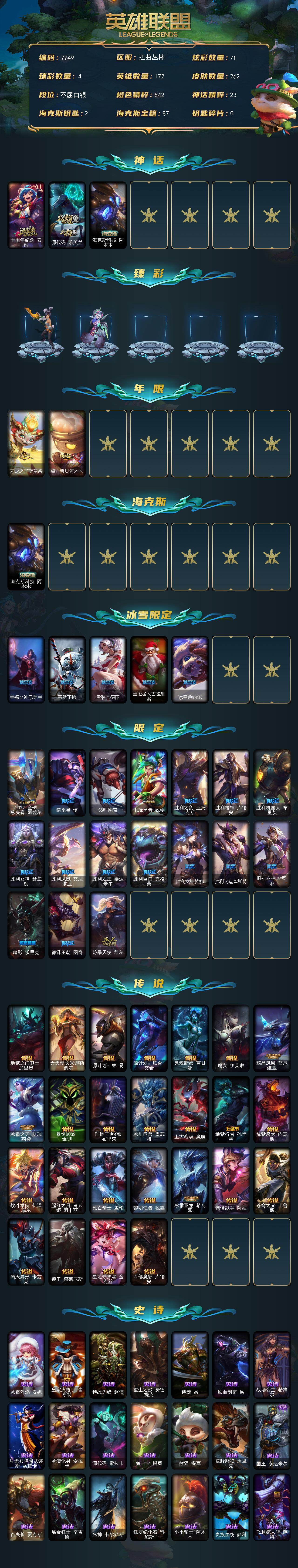 172英雄-262皮肤-172英雄/262皮肤/3神话/25限定/4臻彩/71炫彩/25传说/70史诗/白银/十周年纪念 安妮/源代码 乐芙兰/海克斯科技 阿木木/雾雨之刃 锐雯/魔女 阿卡丽 虚荣/净雪之月 莫甘娜 冬虹/红莲之刃锐雯/天龙之子斯莫德/点心宝贝阿木木/幸福女神乐芙兰/雪默丁格/雪装奈德丽/圣诞老人古拉加斯/冰雪兽纳尔/2022 全球总决赛 阿兹尔/暗杀星 慎/ssw 图奇/电玩勇者 锐雯/胜利之剑