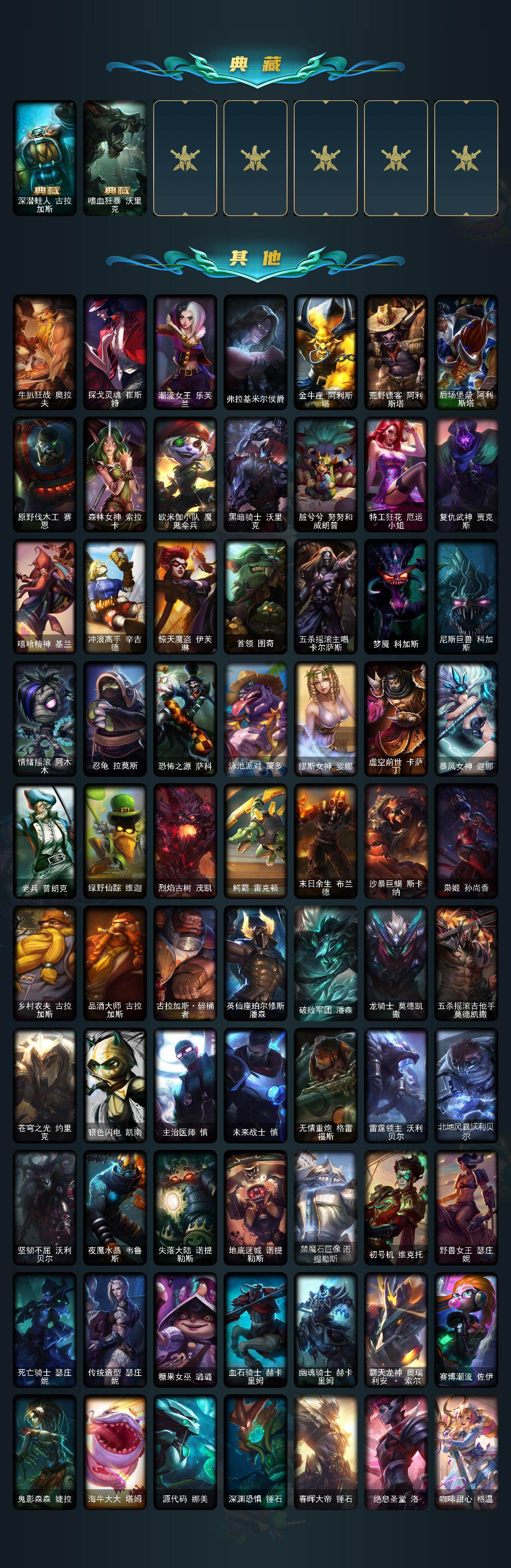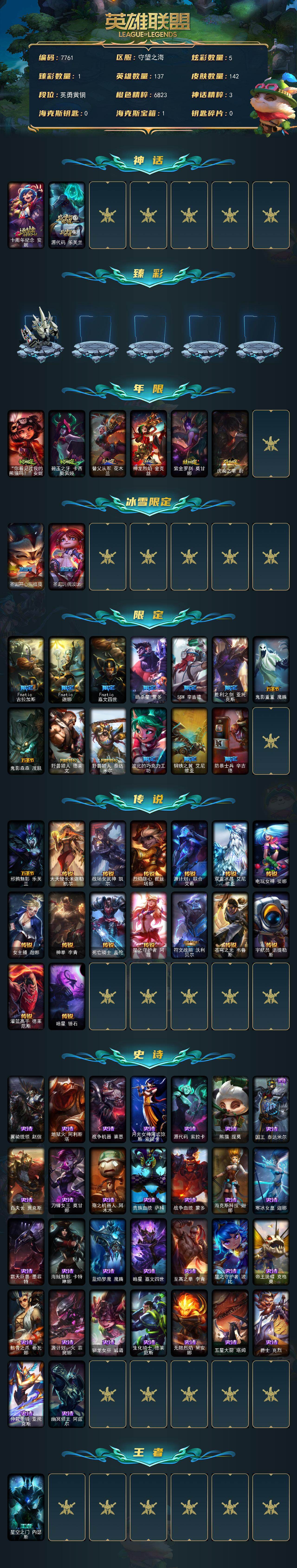 137英雄-142皮肤-137英雄/142皮肤/2神话/21限定/1臻彩/5炫彩/16传说/30史诗/青铜/十周年纪念 安妮/源代码 乐芙兰/霸天巨兽·雪崩 墨菲特/“你看见过我的熊猫吗?”安妮/碧玉之牙 卡西奥佩娅/替父从军 花木兰/神龙烈焰 金克丝/紫金罗刹 莫甘娜/虎痴之拳 蔚/圣诞开心鬼提莫/圣诞玩偶波比/fnatic 古拉加斯/fnatic 迦娜/fnatic 嘉文四世/暗杀星 蒙多/ssw 辛吉德/胜利之
