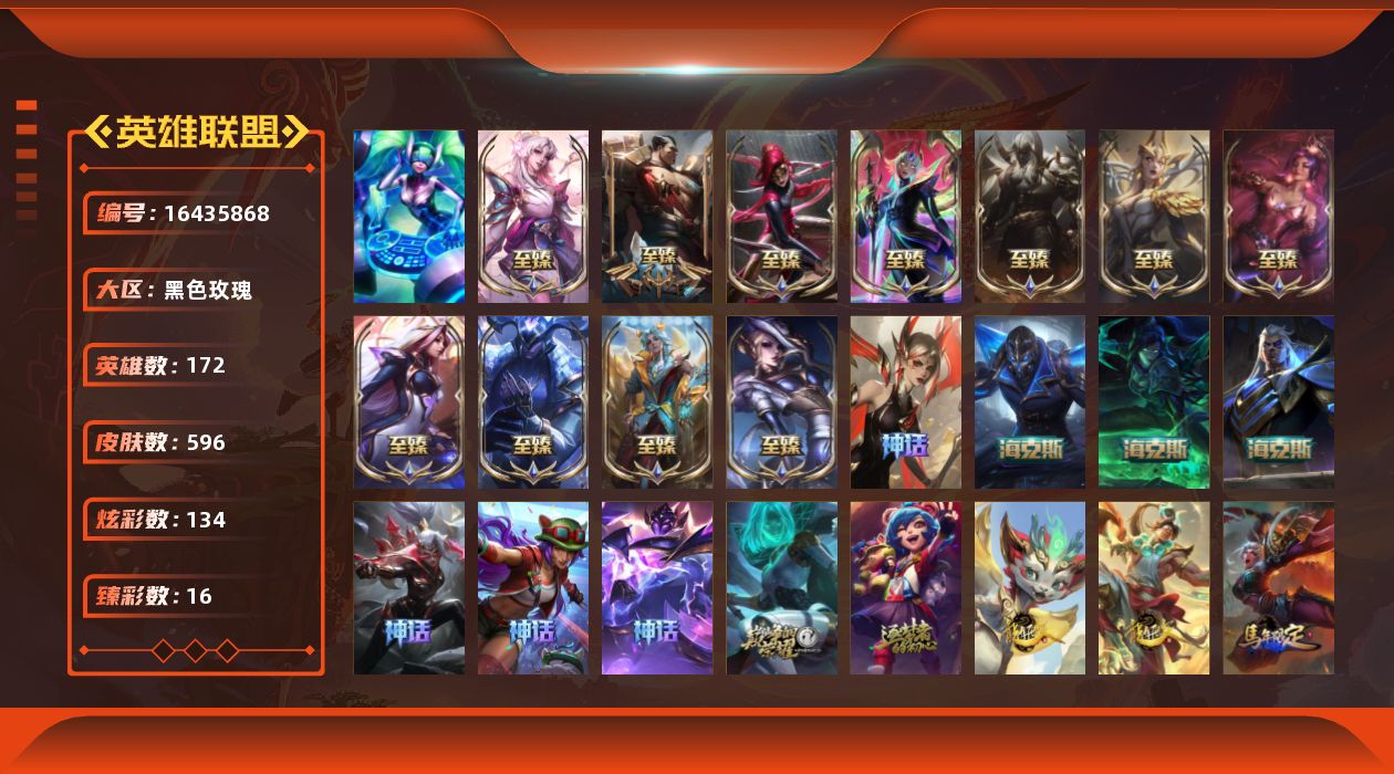 [16435868]【特价出售/店主推荐】 未定级段位-172英雄-596皮肤-134炫彩-1终极-22神话-84限定-54传说-128史诗 【至臻皮肤】:至臻魔女乐芙兰,至臻至高天凯尔,至臻剪纸仙灵希维尔,至臻绝息圣堂厄运小姐,至臻西部魔影伊芙琳,至臻黑色玫瑰假面舞会卡特琳娜,至臻暗裔英雄嘉文四世,至臻天龙之子伊泽瑞尔,至臻灵魂莲华拉克丝,至臻凯旋将军德莱厄斯,至臻腥红之月亚托克斯,至臻drx亚托克斯 【臻彩皮肤】:天龙之子卡莎飞龙乘云,墨之影武者亚索金墨耀影,冰雪游神巴德炫金,幻灵白鸽萨勒芬妮梦幻强袭,战斗学院卡特琳娜盛典礼服,咖啡甜心璐璐焦糖布丁,玉剑传说翼剑仙珠光,星之守护者金克丝黑洞,泳池派对奥莉安娜优雅珠光鲸,霸天异形卡兹克刹那银光,殿堂传奇乐芙兰登神,魔女阿卡丽虚荣,净雪之月莫甘娜冬虹,霸天异形卡兹克丛林灾厄,心之钢伊泽瑞尔天纵才华 【年限皮肤】:替父从军花木兰,玉净夜叉凯特琳,张辽文远,春晖神女拉克丝,天龙之子李青,天龙之子斯莫德,点心宝贝阿木木 【海克斯皮肤】:海克斯科技卡萨丁,海克斯科技斯维因,摄魂使者薇恩 【冰雪限定】:幸福女神乐芙兰,圣诞精灵崔丝塔娜,冰封王子蒙多,平安夜女神娑娜,英勇玩具兵普朗克,邪恶圣诞老人维迦,圣诞老人古拉加斯,魄罗骑士瑟庄妮,圣诞捣蛋鬼金克丝,冰雪节玛尔扎哈 【终极皮肤】:dj娑娜 【神话皮肤】:十周年纪念安妮,源代码乐芙兰,殿堂传奇乐芙兰,十五周年纪念希维尔,神凰行者瑞羽圣凰艾尼维亚,殿堂传奇薇恩,水晶巫灵泽拉斯,海克斯科技卡萨丁,海克斯科技斯维因,摄魂使者薇恩,至臻天龙之子伊泽瑞尔,至臻西部魔影伊芙琳,至臻至高天凯尔,至臻drx亚托克斯,至臻剪纸仙灵希维尔,至臻绝息圣堂厄运小姐,至臻魔女乐芙兰,至臻腥红之月亚托克斯 【限定皮肤】:生化领主泰达米尔,冠军之血希瓦娜,冠军之矛卡莉丝塔,冠军掠夺者卡兹克,2021全球总决赛嘉文四世,fnatic古拉加斯,fnatic迦娜,暗杀星奥莉安娜,暗杀星伊泽瑞尔,sktt1劫,sktt1薇恩,ssw图奇,ssw泰隆,ssw雷恩加尔,ssw锤石,sktt1阿兹尔,sktt1瑞兹,sktt1艾克,sktt1奥拉夫,sktt1烬,sktt1娜美,sktt1辛德拉,sktt1扎克,ig卡莎,f普朗克,edg佛耶戈,drx凯特琳,星之守护者伊泽瑞尔,玉剑传说无影,海珀利安小队y03权天使卡蜜尔,女帝厄运小