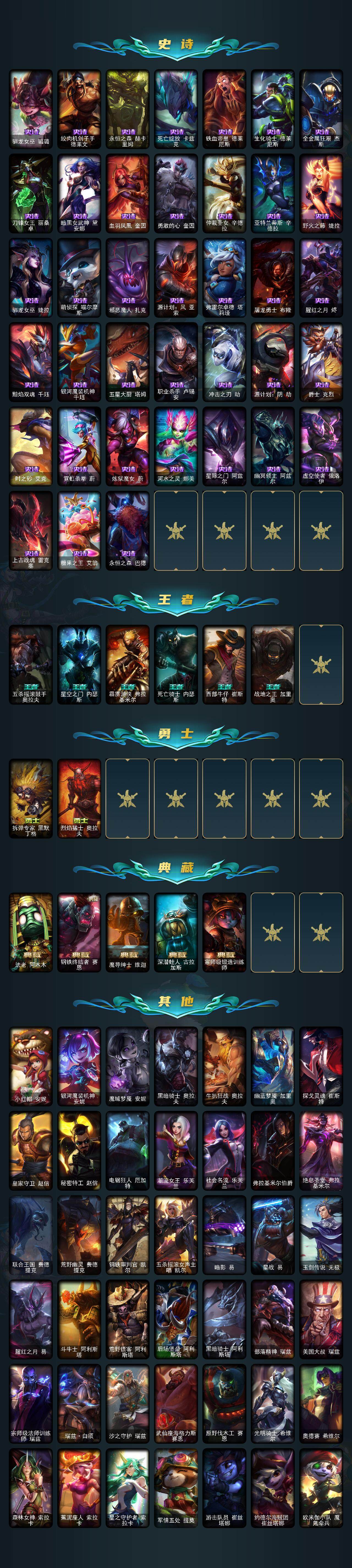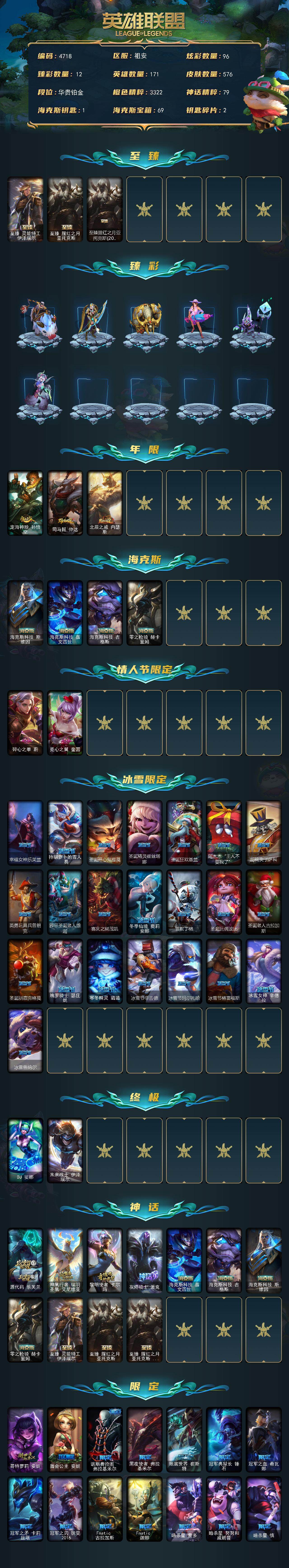 171英雄-576皮肤-171英雄/576皮肤/2终极/11神话/90限定/12臻彩/96炫彩/51传说/143史诗/铂金/源代码 乐芙兰/神凰行者 瑞羽圣凰 艾尼维亚/黎明使者 卡尔玛/灰烬骑士 派克/海克斯科技 嘉文四世/海克斯科技 吉格斯/海克斯科技 斯维因/零之呛骑 赫卡里姆/至臻 灵能特工 伊泽瑞尔/至臻 腥红之月 亚托克斯/至臻 腥红之月 亚托克斯 2022/至臻腥红之月亚托克斯2022/天龙之子