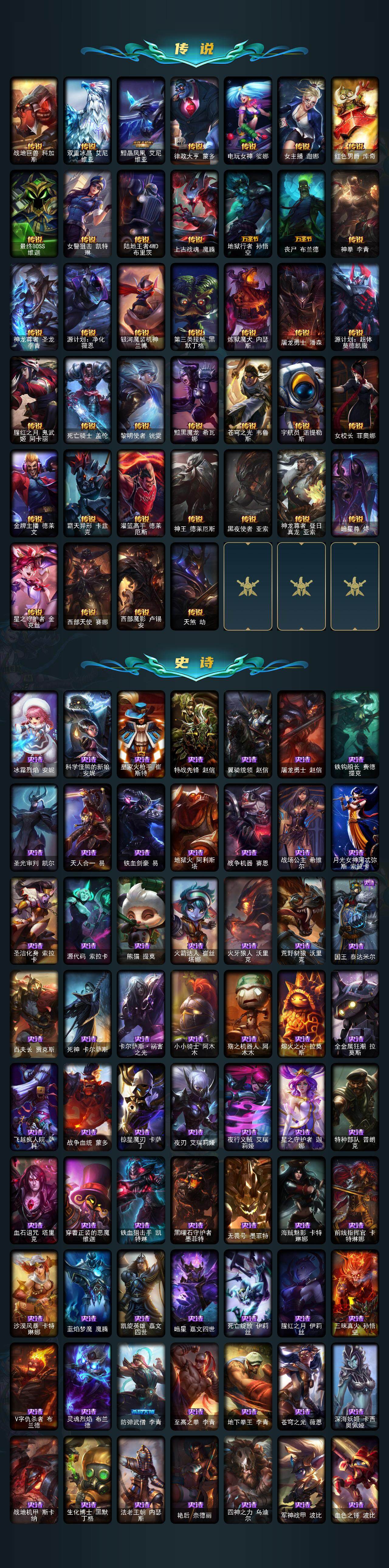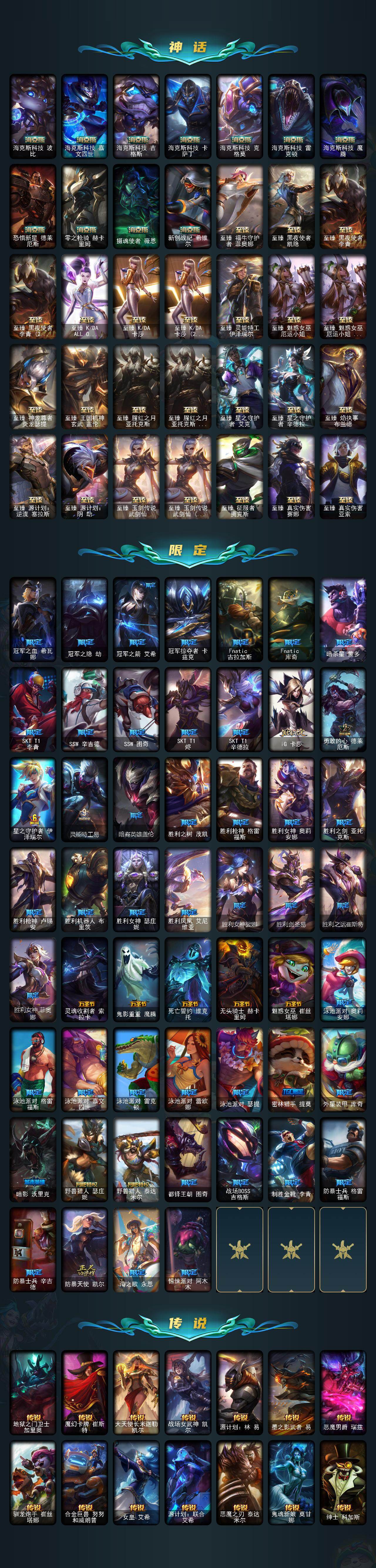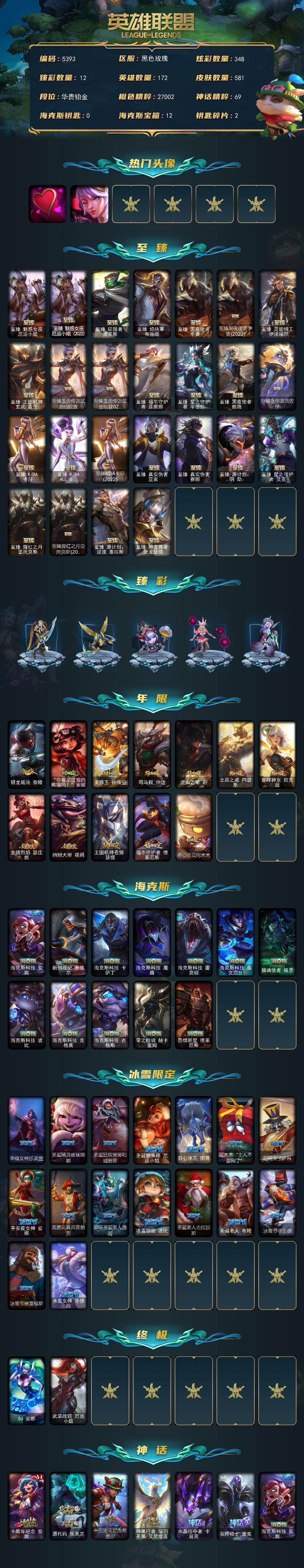 172英雄-581皮肤-172英雄/581皮肤/2终极/43神话/81限定/12臻彩/348炫彩/53传说/132史诗/铂金/十周年纪念 安妮/源代码 乐芙兰/十五周年纪念 希维尔/神凰行者 瑞羽圣凰 艾尼维亚/水晶掠夺者 卡兹克/灰烬骑士 派克/海克斯科技 安妮/海克斯科技 波比/海克斯科技 嘉文四世/海克斯科技 吉格斯/海克斯科技 卡萨丁/海克斯科技 克格莫/海克斯科技 雷克顿/海克斯科技 魔腾/恐惧新星 德莱厄