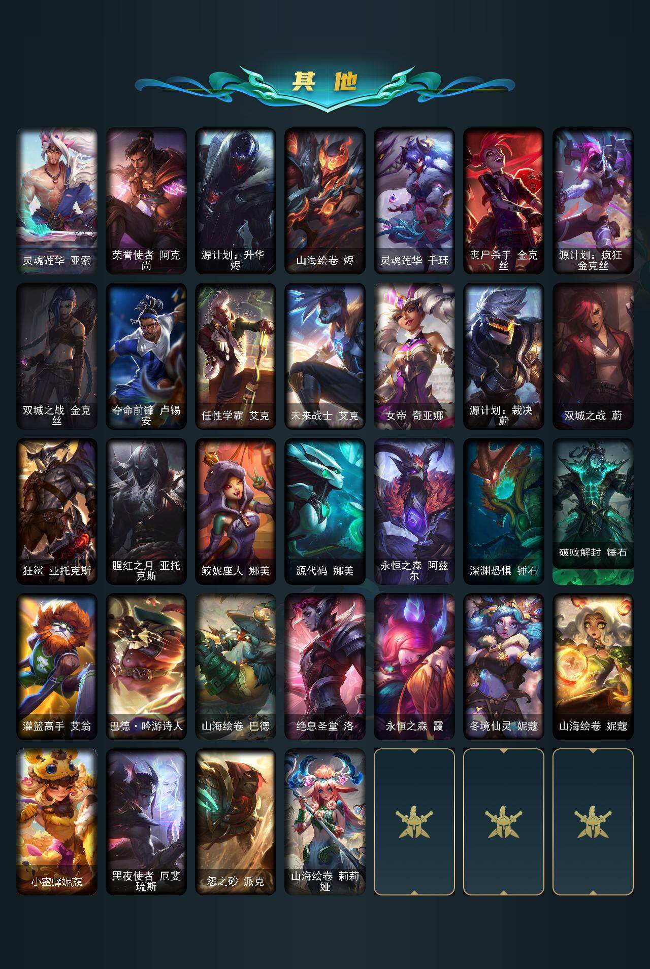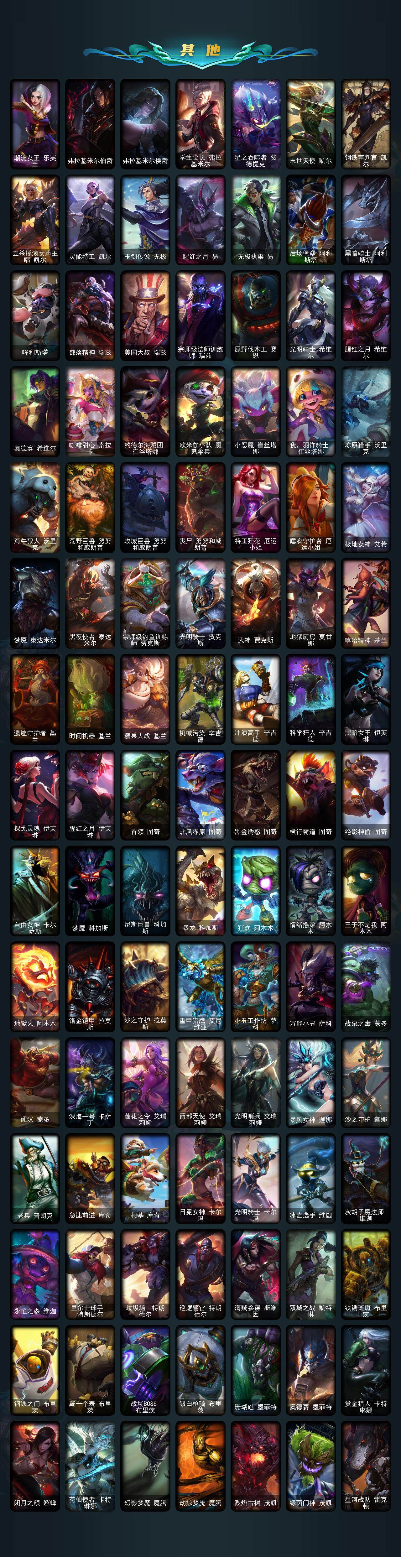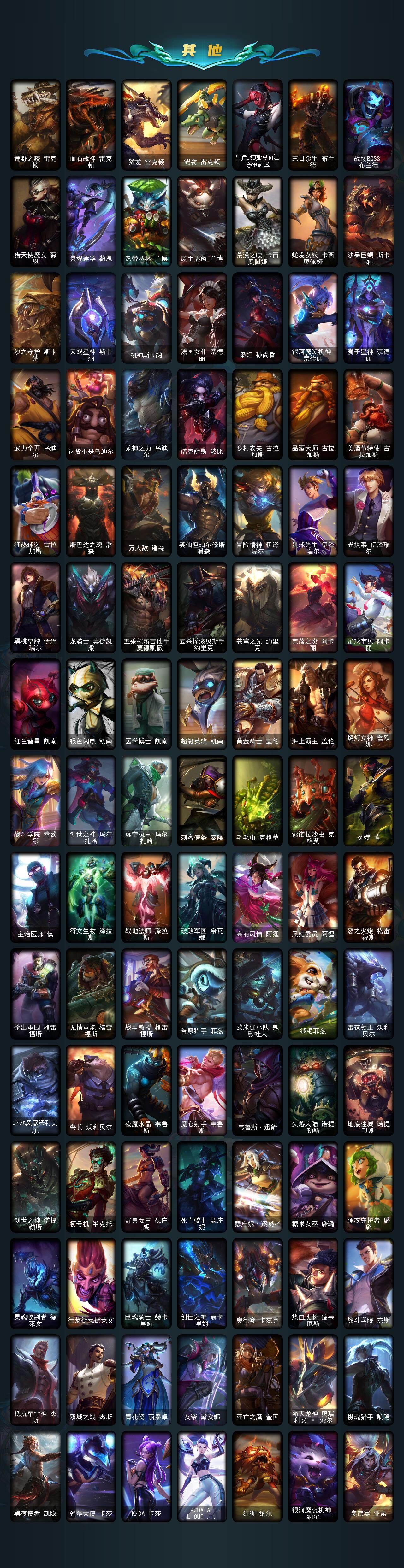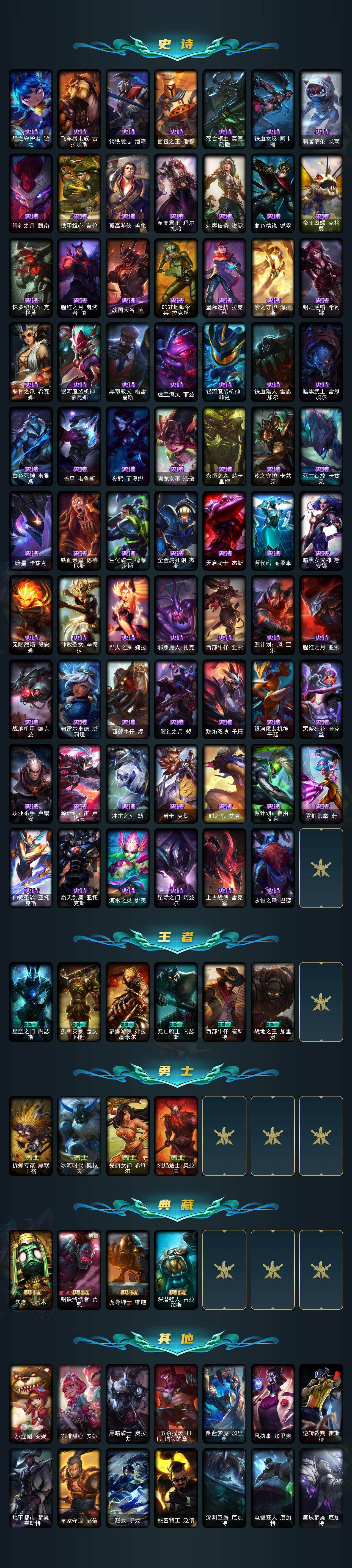 172英雄-581皮肤-172英雄/581皮肤/2终极/43神话/81限定/12臻彩/348炫彩/53传说/132史诗/铂金/十周年纪念 安妮/源代码 乐芙兰/十五周年纪念 希维尔/神凰行者 瑞羽圣凰 艾尼维亚/水晶掠夺者 卡兹克/灰烬骑士 派克/海克斯科技 安妮/海克斯科技 波比/海克斯科技 嘉文四世/海克斯科技 吉格斯/海克斯科技 卡萨丁/海克斯科技 克格莫/海克斯科技 雷克顿/海克斯科技 魔腾/恐惧新星 德莱厄