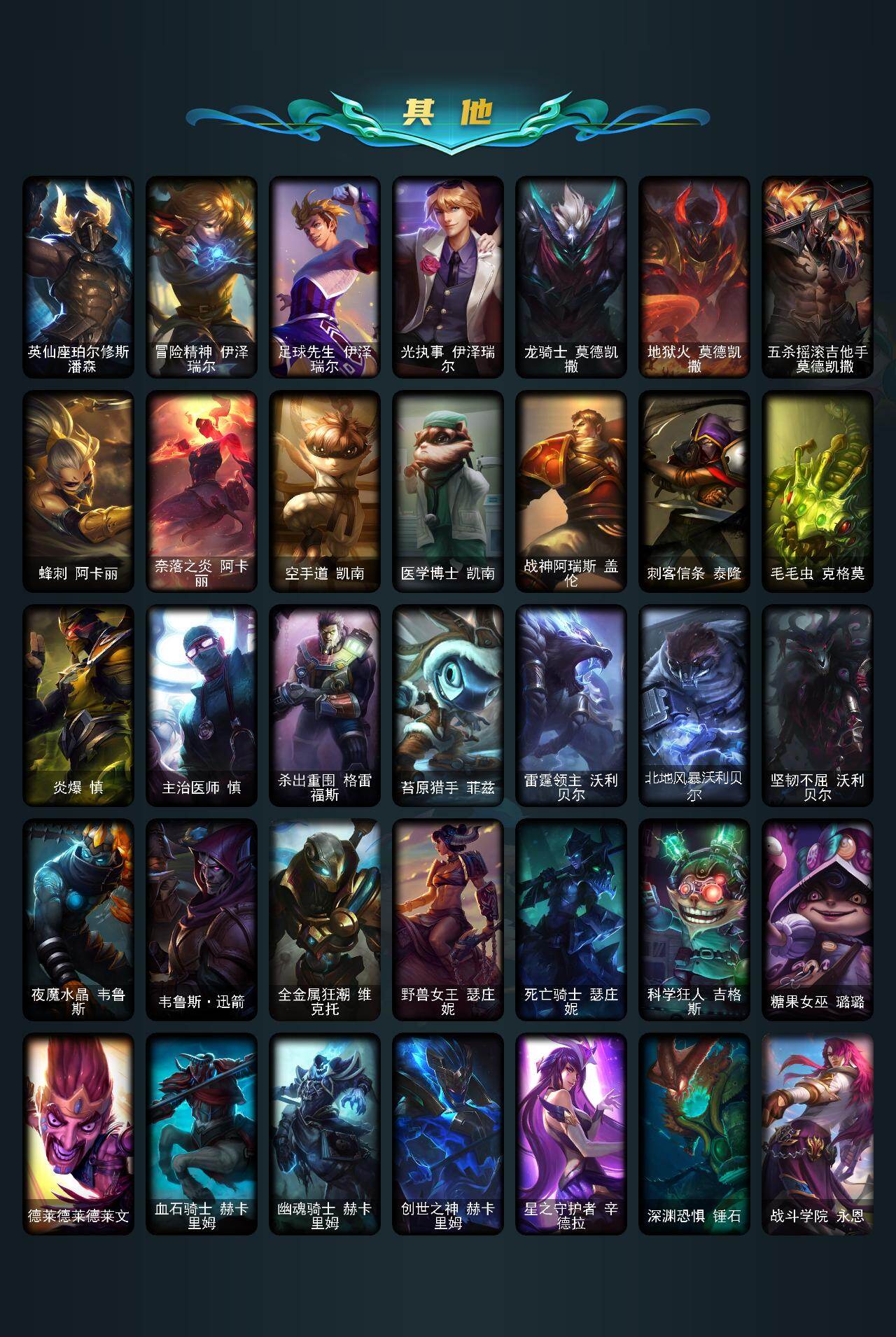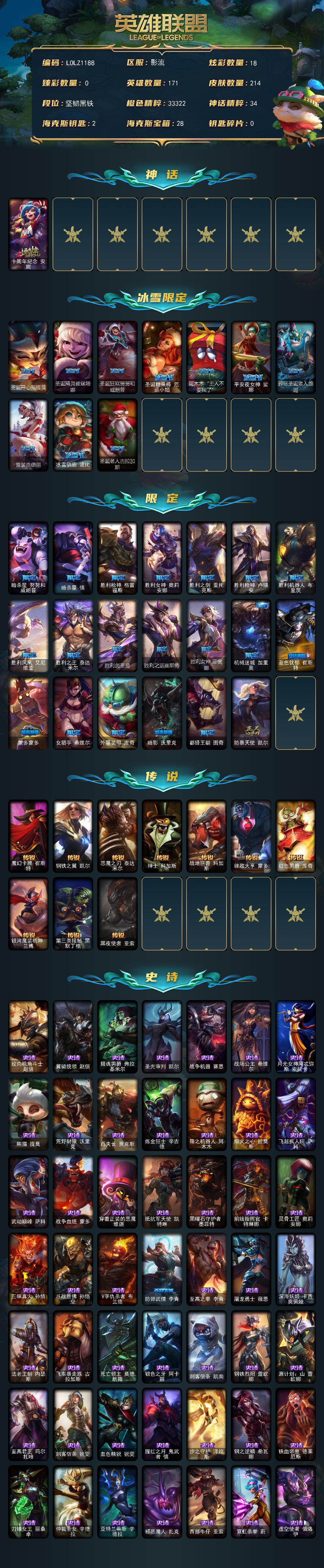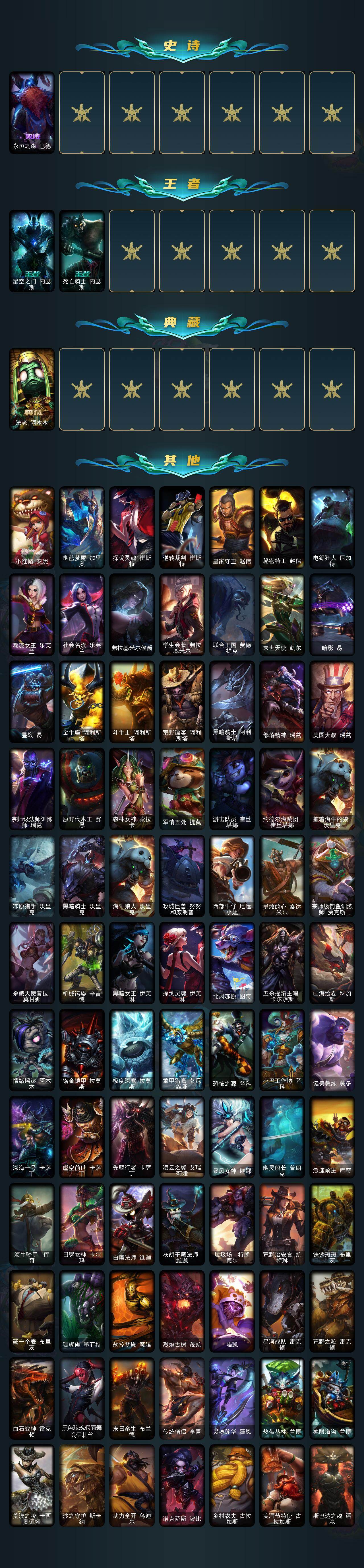 【lolz1188】171英雄/214皮肤/1神话/31限定/18炫彩/10传说/50史诗/未定级/十周年纪念安妮/圣诞开心鬼提莫/圣诞精灵崔丝塔娜/圣诞狂欢努努和威朗普/圣诞糖果棒厄运小姐/阿木木“主人不要我了”/平安夜女神娑娜/邪恶圣诞老人维迦/雪装奈德丽/冰雪驯鹿波比/圣诞老人古拉加斯/暗杀星努努和威朗普/暗杀星慎/胜利呛神格雷福斯/胜利女神奥莉安娜/胜利之剑亚托克斯/胜利呛神卢锡安/胜利机器人布里茨/胜利凤凰艾尼维亚/胜利之王泰达米尔/胜利剑圣易/胜利之运崔斯特/胜利女神菲奥娜/机械迷城加里奥/蓝色忧郁崔斯特/蒙多蒙多/女猎手希维尔/外星装甲库奇/暗影沃里克/都铎王朝图奇/防暴天使凯尔/魔幻卡牌崔斯特/钢铁之翼凯尔/恶魔之刃泰达米尔/绅士科加斯/战地巨兽科加斯/律政大亨蒙多/红色男爵库奇/银河魔装机神兰博/第三类接触黑默丁格/黑夜使者亚索/绞肉机角斗士赵信/翼骑统领赵信/摄魂男爵弗拉基米尔/圣光审判凯尔/战争机器赛恩/战场公主希维尔/月光女神阿忒弥斯索拉卡/熊猫提莫/荒野豺狼沃里克/百夫长贾克斯/炼金狂士辛吉德/殇之机器人阿木木/熔火之心拉莫斯/飞越疯人院萨科/武动巅峰萨科/战争血统蒙多/穿着正装的恶魔维迦/抵抗军天使凯特琳/黑曜石守护者墨菲特/前线指挥官卡特琳娜/灵骨工匠奥莉安娜/三昧真火孙悟空/斗战胜佛孙悟空/v字仇杀者布兰德/防弹武僧李青/至高之拳李青/屠龙勇士薇恩/深海妖姬卡西奥佩娅/法老王朝内瑟斯/飞车暴走族古拉加斯/死亡领主莫德凯撒/银色之牙阿卡丽/刺客信条凯南/钢铁烈阳蕾欧娜/源计划山蕾欧娜/至高君王玛尔扎哈/刺客信条锐雯/血色精锐锐雯/腥红之月鬼武者慎/沙之守护泽拉斯/钢之逆鳞希瓦娜/铁血帝皇德莱厄斯/刀锋女王丽桑卓/仲裁圣女辛德拉/亚特兰蒂斯辛德拉/邪恶魔人扎克/西部牛仔亚索/霓虹杀拳蔚/虚空使者俄洛伊/永恒之森巴德/星空之门内瑟斯/死亡骑士内瑟斯/法老阿木木/小红帽安妮/幽蓝梦魇加里奥/探戈灵魂崔斯特/逆转裁判崔斯特/皇家守卫赵信/秘密特工赵信/电锯狂人厄加特/潮流女王乐芙兰/社会名流乐芙兰/弗拉基米尔侯爵/学生会长弗拉基米尔/联合王国费德提克/末世天使凯尔/暗影易/星战易/金牛座阿利斯塔/斗牛士阿利斯塔/荒野镖客阿利斯塔/黑暗骑士阿利斯塔/部落精神瑞兹/美国大叔瑞兹/宗师级法师训练师瑞兹/原野伐木工赛恩/森林女神索拉卡/军情五处提莫/游击队员崔丝塔娜/约德尔海贼团崔丝塔娜/披着海牛的狼沃里克/冻原猎手沃里克/黑暗骑士沃里克/海牛狼人沃里克/攻城巨兽努努和威朗普/西部牛仔厄运小姐/勇敢的心泰达米尔/宗师级钓鱼训练师贾克斯/杀戮天使昔拉莫甘娜/机械污染辛吉德/黑暗女王伊芙琳/探戈灵魂伊芙琳/北风冻原图奇/五杀摇滚主唱卡尔萨斯/山海绘卷科加斯/情绪摇滚阿木木/铬金铠甲拉莫斯/极度深寒拉莫斯/重甲猎鹰艾尼维亚/恐怖之源萨科/小丑工作坊萨科/健美教练蒙多/深海一号卡萨丁/虚空前世卡萨丁/先驱行者卡萨丁/凌云之翼艾瑞莉娅/暴风女神迦娜/幽灵船长普朗克/急速前进库奇/海牛骑手库奇/日冕女神卡尔玛/白魔法师维迦/灰胡子魔法师维迦/垃圾场特朗德尔/荒野治安官凯特琳/铁锈斑斑布里茨/戴一个表布里茨/珊瑚礁墨菲特/劫掠梦魇魔腾/烈焰古树茂凯/喵凯/星河战队雷克顿/荒野之咬雷克顿/血石战神雷克顿/黑色玫瑰假面舞会伊莉丝/末日余生布兰德/传统僧侣李青/灵魂莲华薇恩/热带丛林兰博/独眼海盗兰博/荒漠之咬卡西奥佩娅/沙之守护斯卡纳/武力全开乌迪尔/诺克萨斯波比/乡村农夫古拉加斯/美酒节特使古拉加斯/斯巴达之魂潘森/英仙座珀尔修斯潘森/冒险精神伊泽瑞尔/足球先生伊泽瑞尔/光执事伊泽瑞尔/龙骑士莫德凯撒/地狱火莫德凯撒/五杀摇滚吉他手莫德凯撒/蜂刺阿卡丽/奈落之炎阿卡丽/空手道凯南/医学博士凯南/战神阿瑞斯盖伦/刺客信条泰隆/毛毛虫克格莫/炎爆慎/主治医师慎/杀出重围格雷福斯/苔原猎手菲兹/雷霆领主沃利贝尔/北地风暴沃利贝尔/坚韧不屈沃利贝尔/夜魔水晶韦鲁斯/韦鲁斯迅箭/全金属狂潮维克托/野兽女王瑟庄妮/死亡骑士瑟庄妮/科学狂人吉格斯/糖果女巫璐璐/德莱德莱德莱文/血石骑士赫卡里姆/幽魂骑士赫卡里姆/创世之神赫卡里姆/星之守护者辛德拉/深渊恐惧锤石/战斗学院永恩
