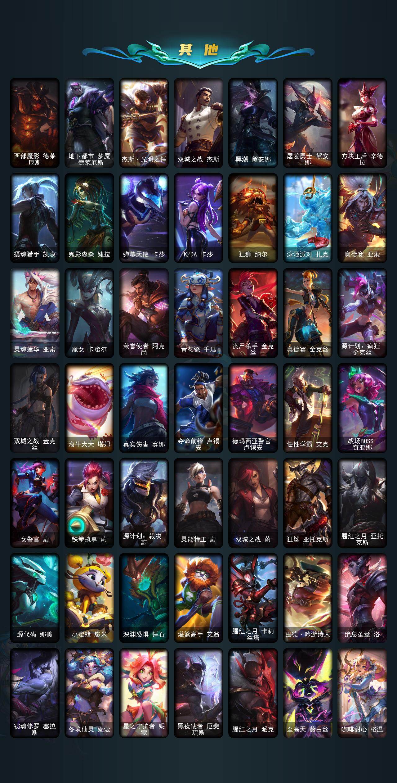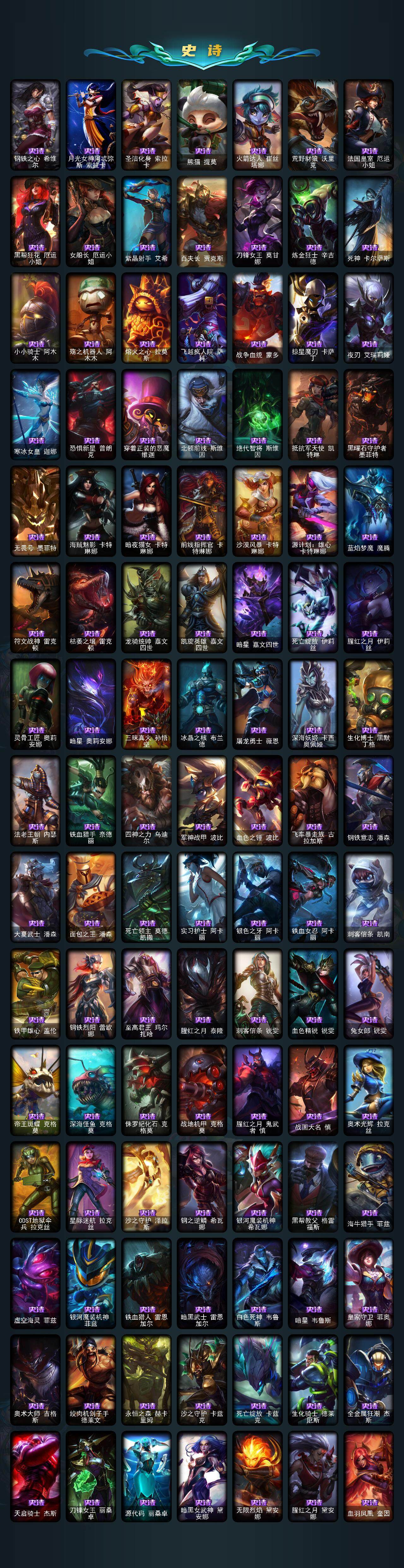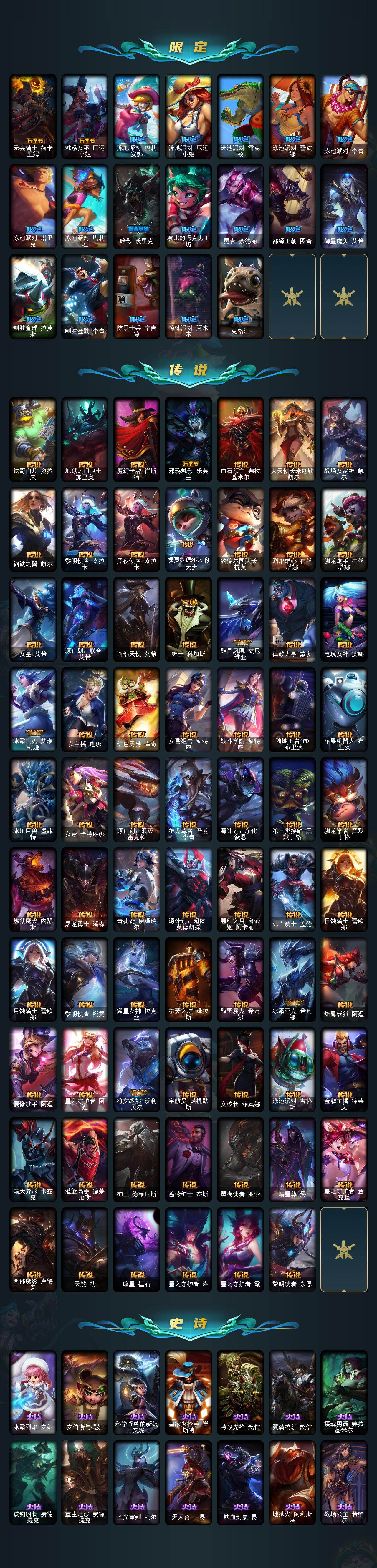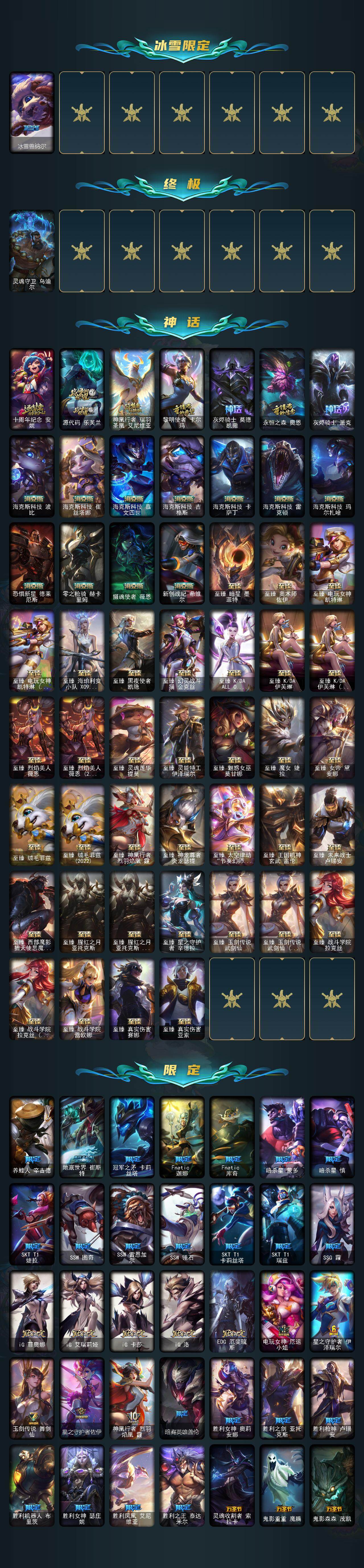 172英雄-673皮肤-172英雄/673皮肤/1终极/53神话/79限定/15臻彩/324炫彩/69传说/157史诗/钻石/十周年纪念 安妮/源代码 乐芙兰/神凰行者 瑞羽圣凰 艾尼维亚/黎明使者 卡尔玛/灰烬骑士 莫德凯撒/永恒之森 奥恩/灰烬骑士 派克/海克斯科技 波比/海克斯科技 崔丝塔娜/海克斯科技 嘉文四世/海克斯科技 吉格斯/海克斯科技 卡萨丁/海克斯科技 雷克顿/海克斯科技 玛尔扎哈/恐惧新星 德莱厄